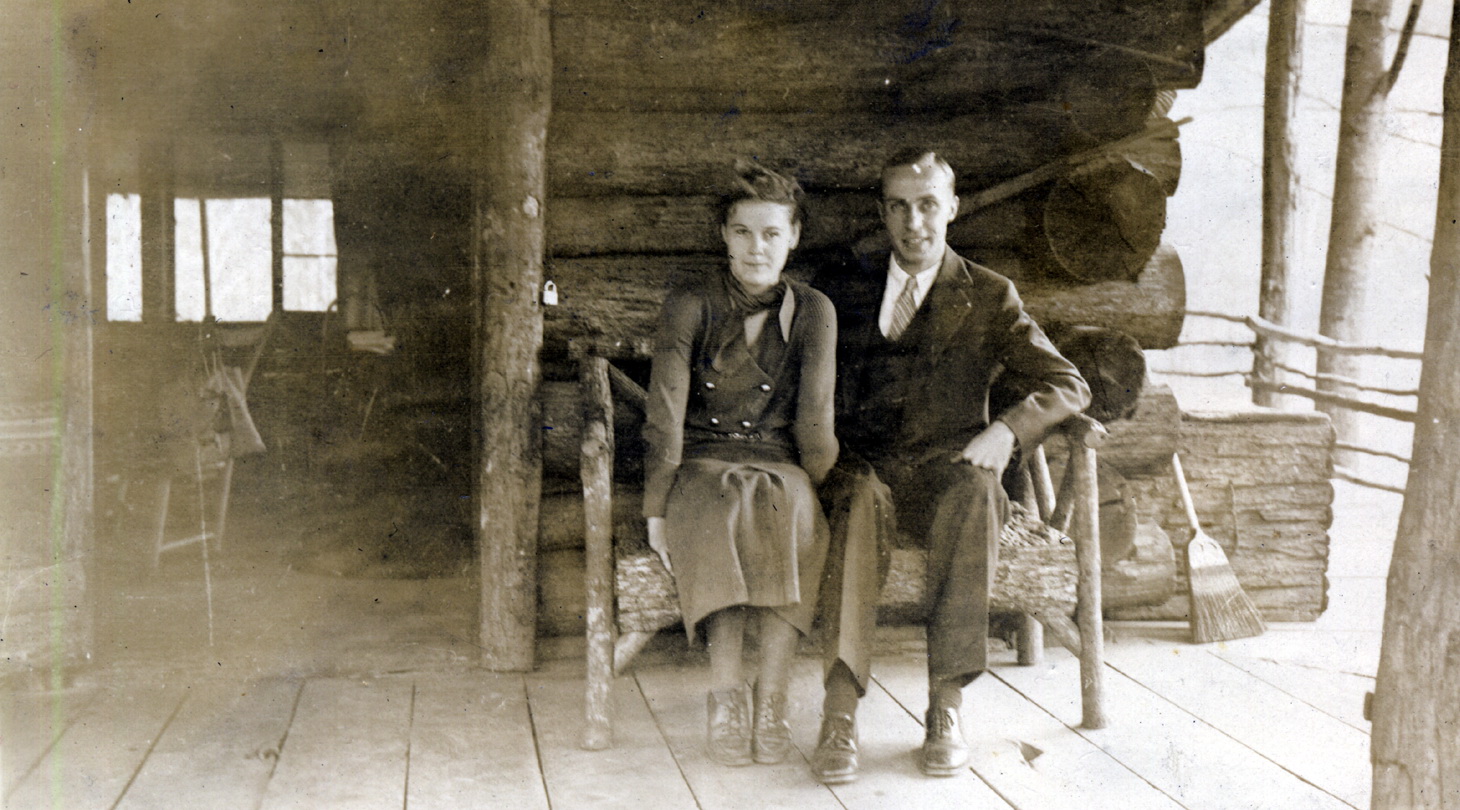 - Barbara and James L. Faulkner on Pole House porch. [X_100_workers_2648_mod.jpg]