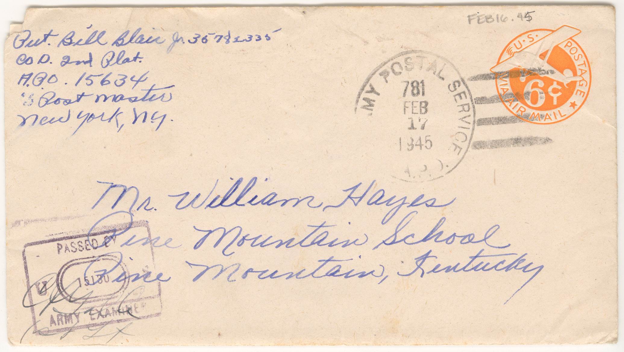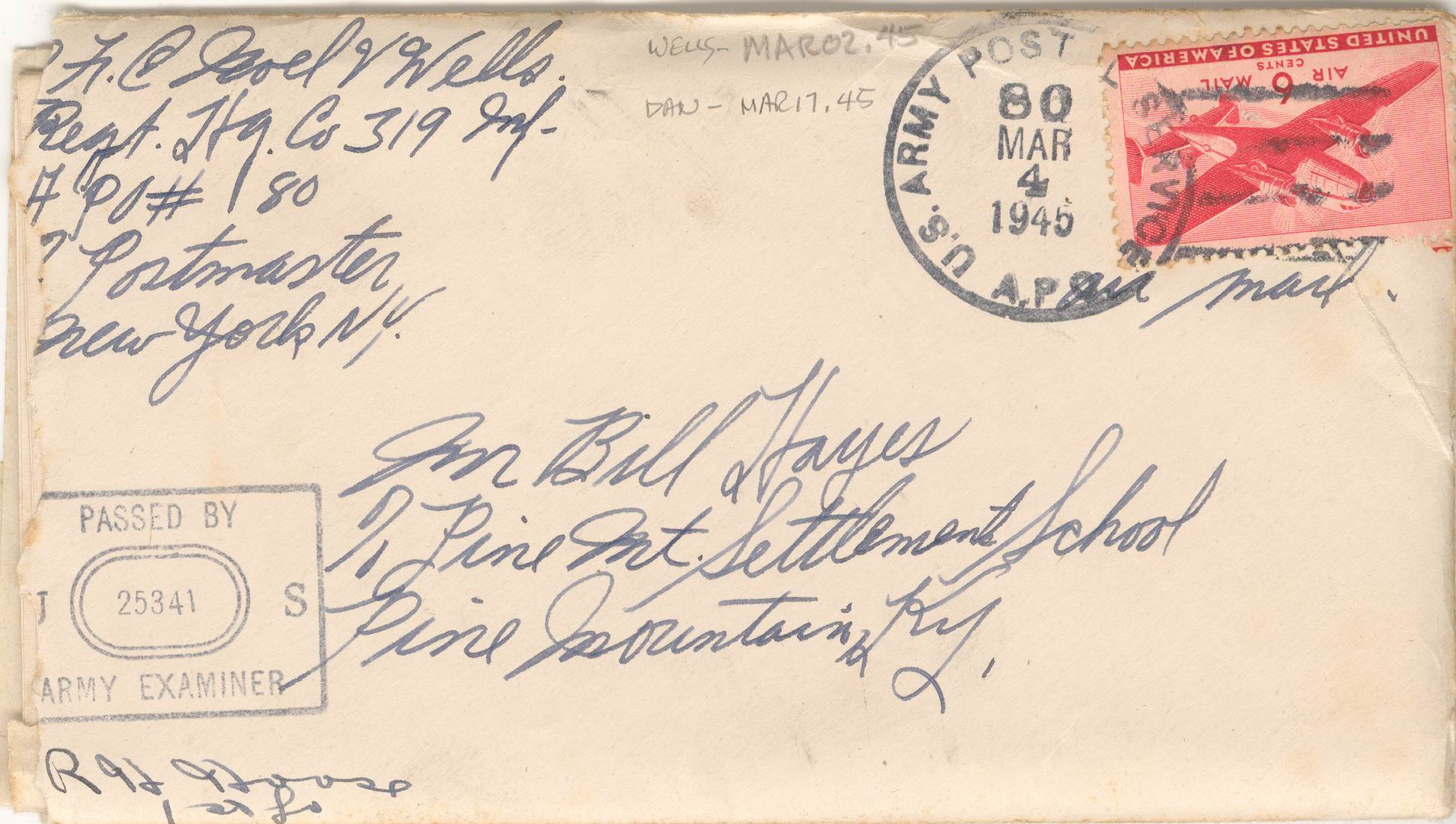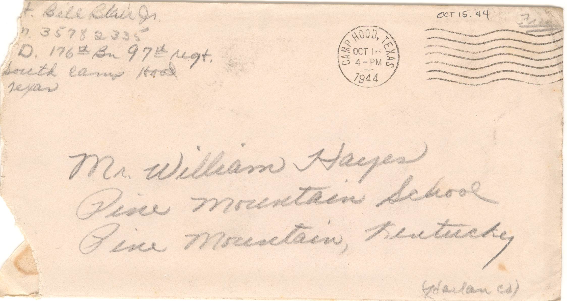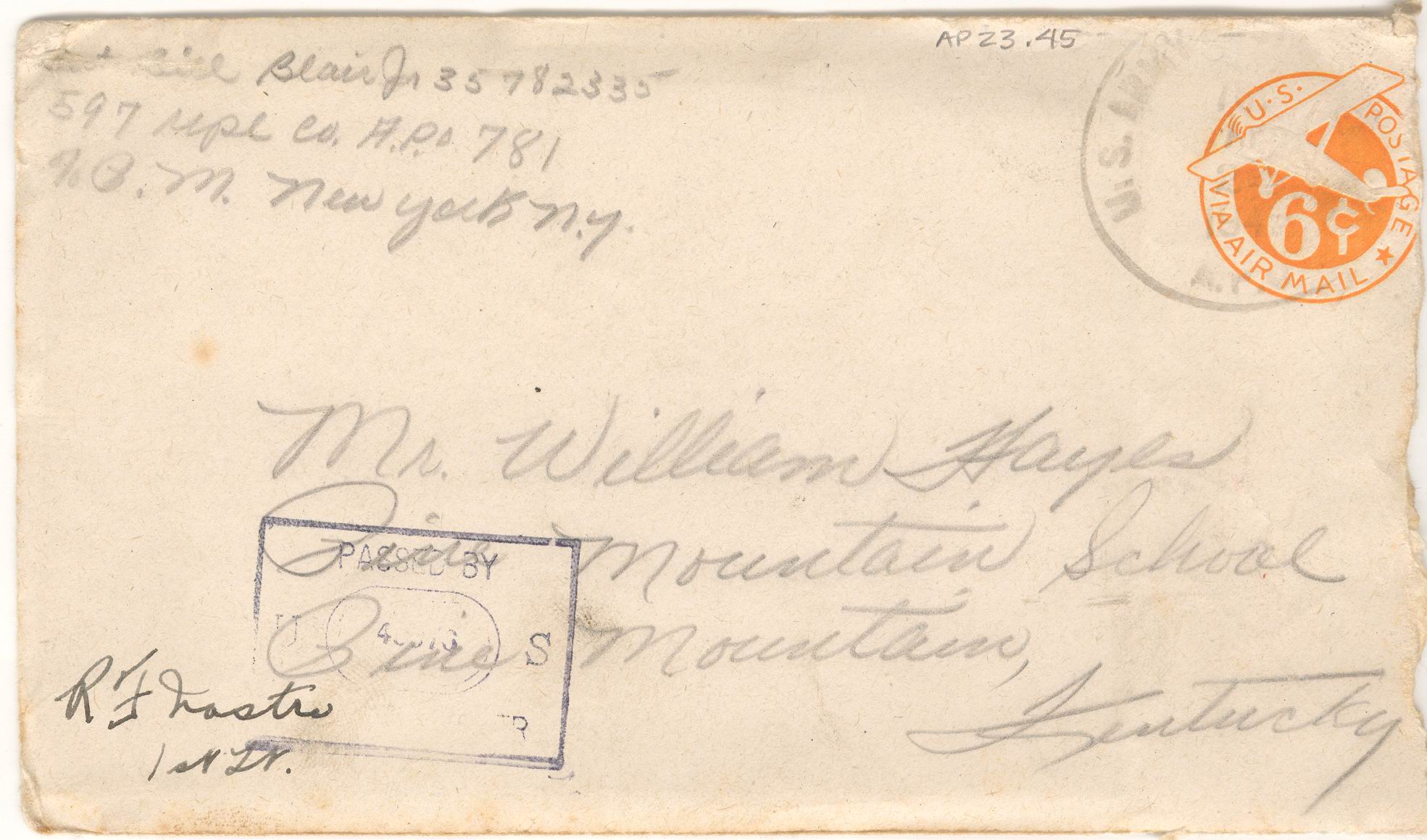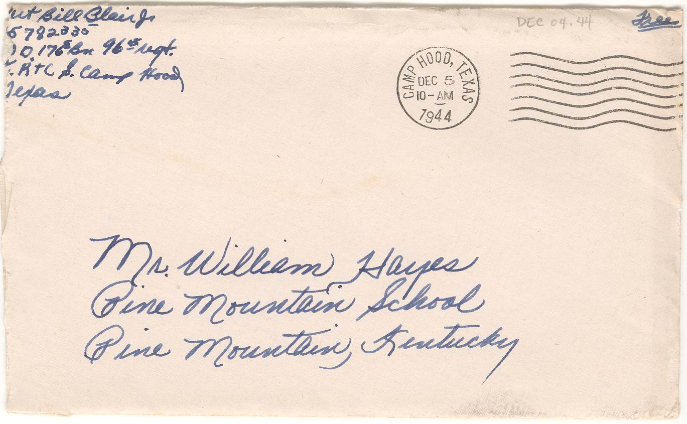 Two additional letters are included in the Blair letters that are not written by Blair but by classmates who shared the war experience. The two students are NOEL V. WELLS and “DAN” [BUCK JONES]. A note on the reverse of the Jones letter remembers that he was from Coxton, Kentucky, the mining town where Bill Hayes was from and was an usher at the wedding of Fern and Bill and a “swimming buddy” of Bill’s. [The note is in the hand of Fern Hayes, Bill Hayes’ wife.]