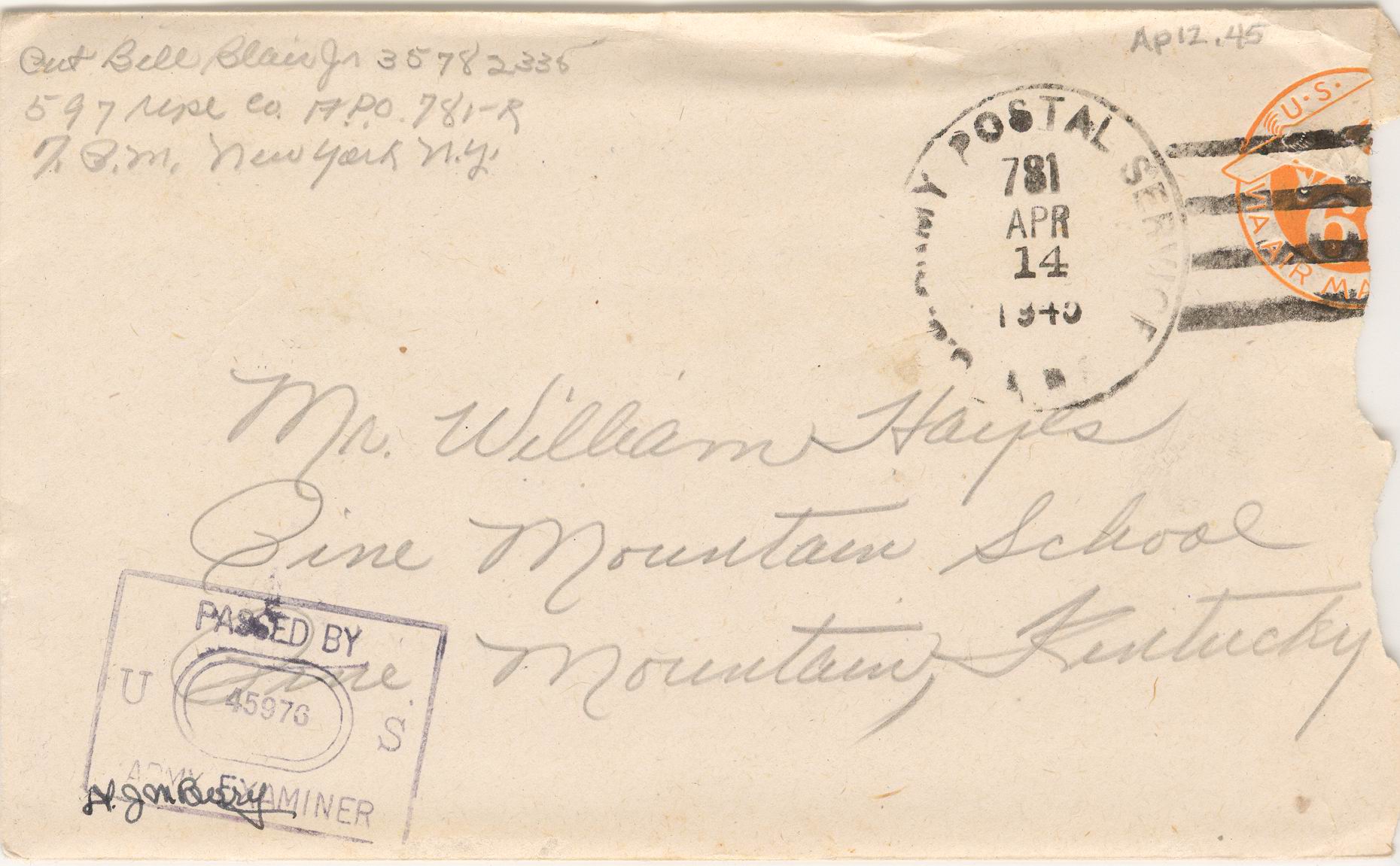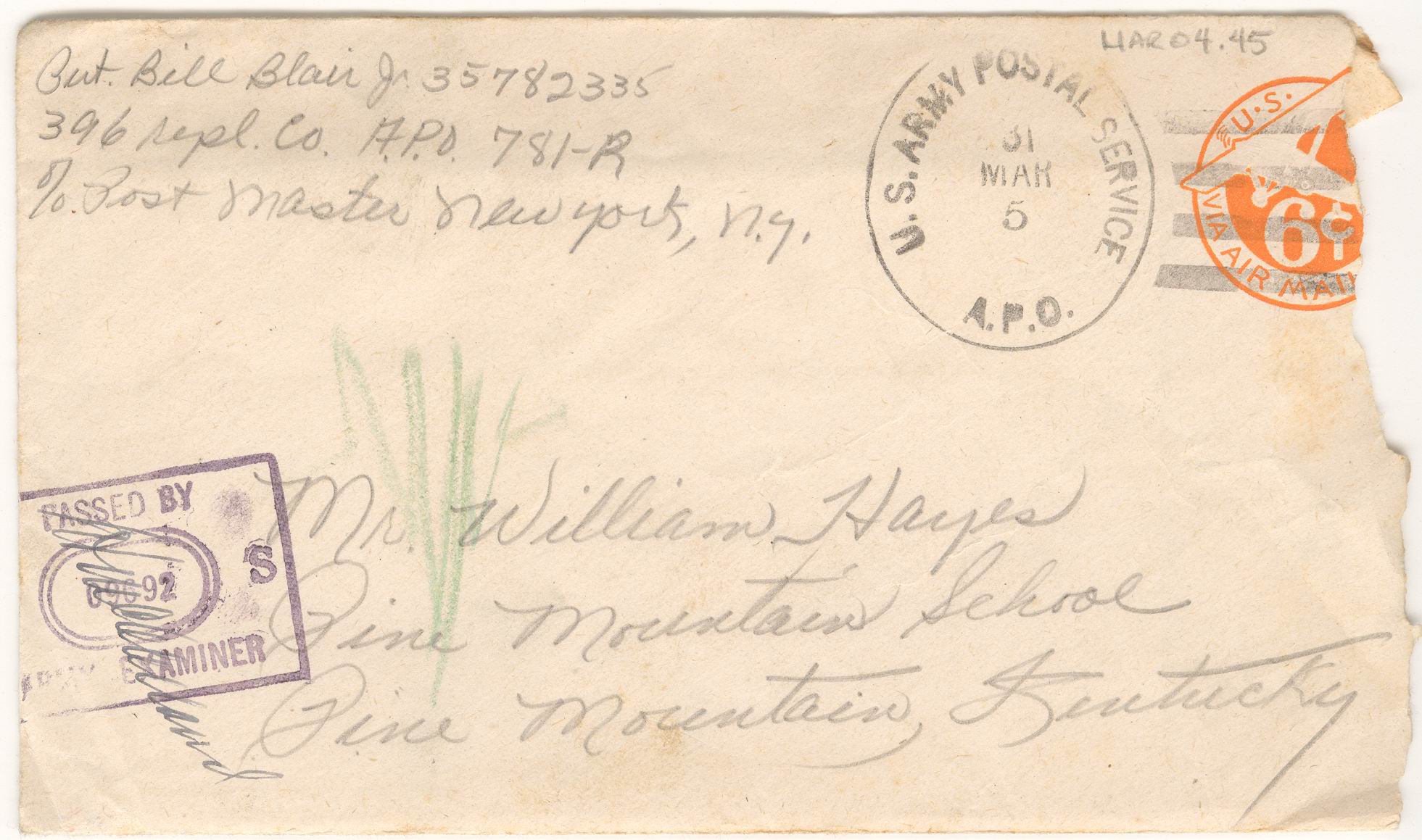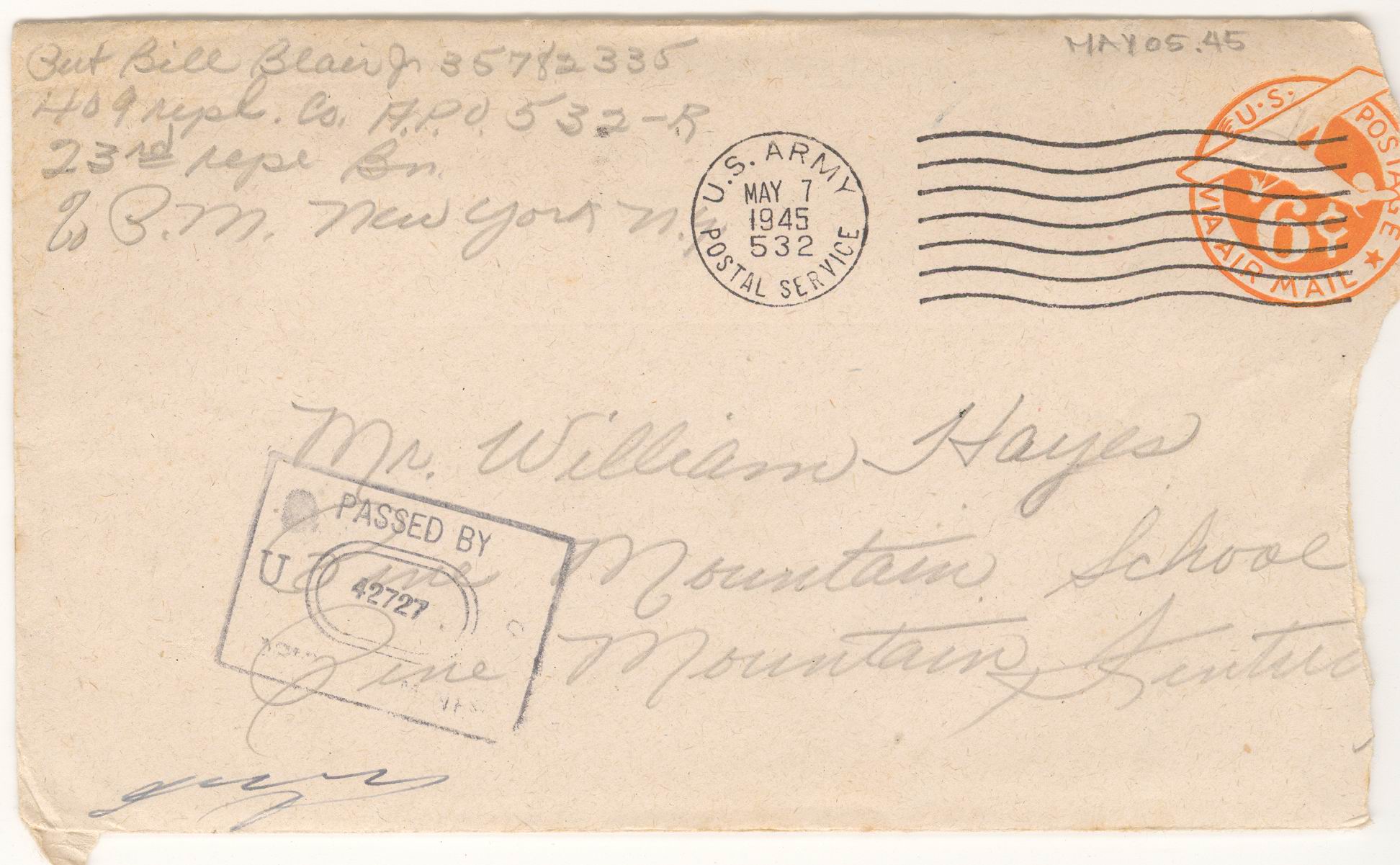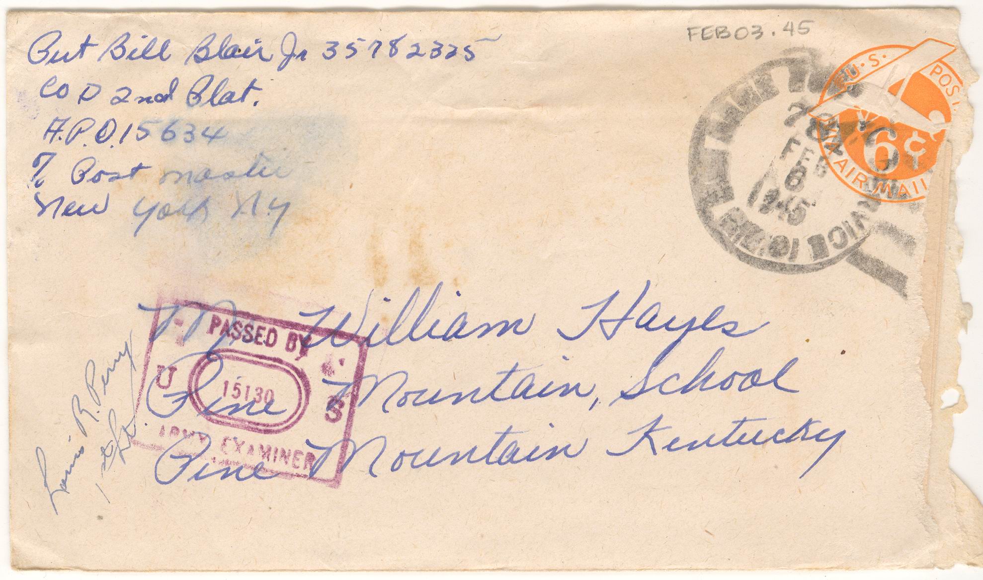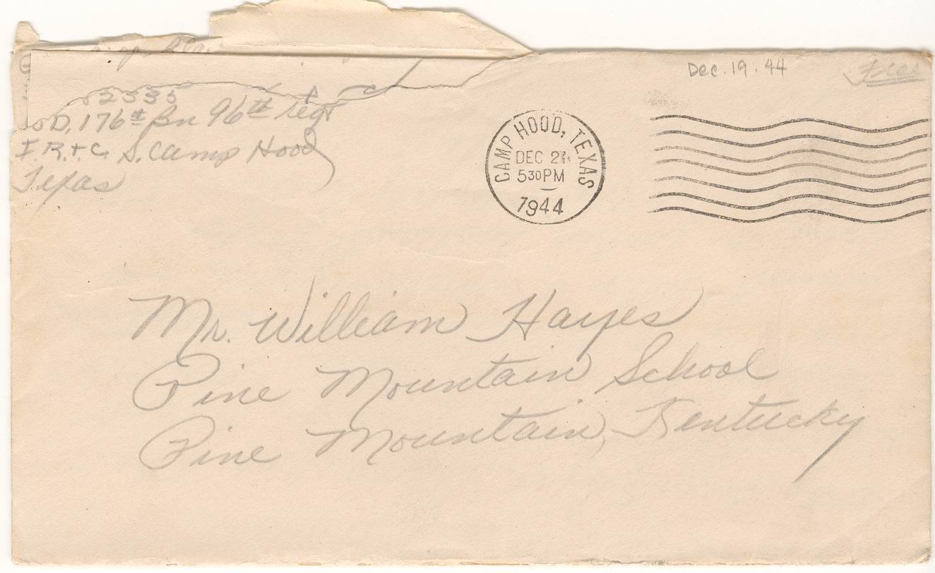 Two additional letters are included in the Blair letters that are not written by Blair but by classmates who shared the war experience. The two students are NOEL V. WELLS and “DAN” [BUCK JONES]. A note on the reverse of the Jones letter remembers that he was from Coxton, Kentucky, the mining town where Bill Hayes was from and was an usher at the wedding of Fern and Bill and a “swimming buddy” of Bill’s. [The note is in the hand of Fern Hayes, Bill Hayes’ wife.]