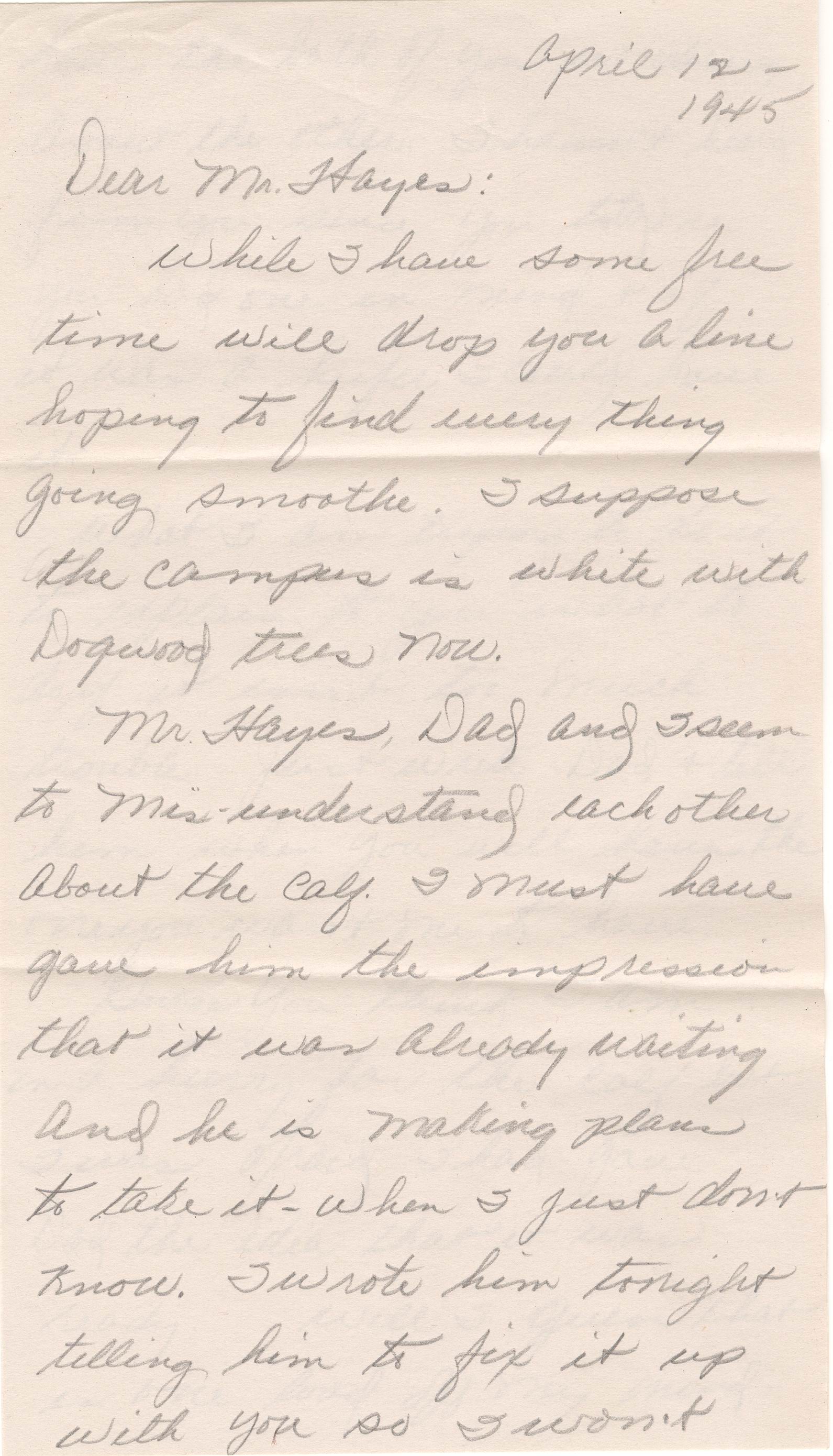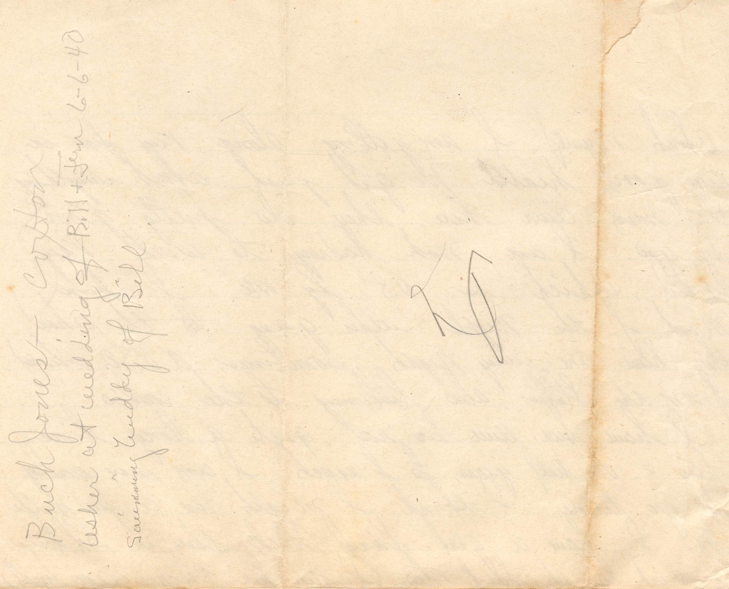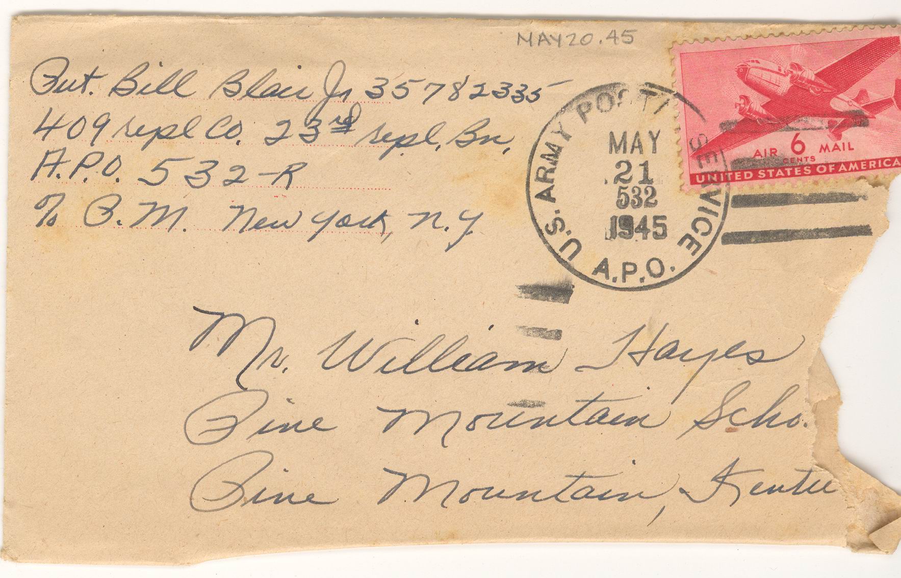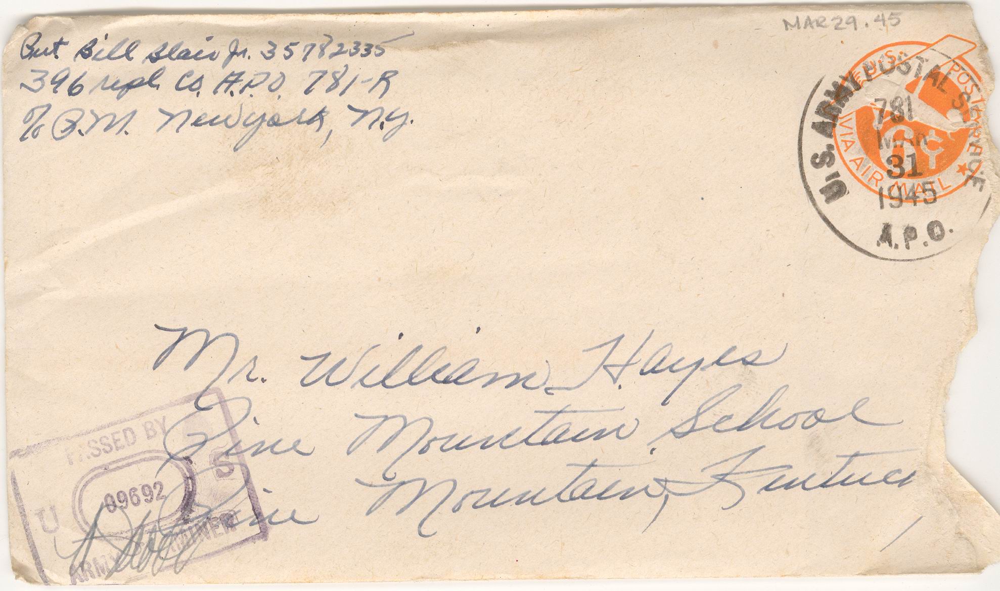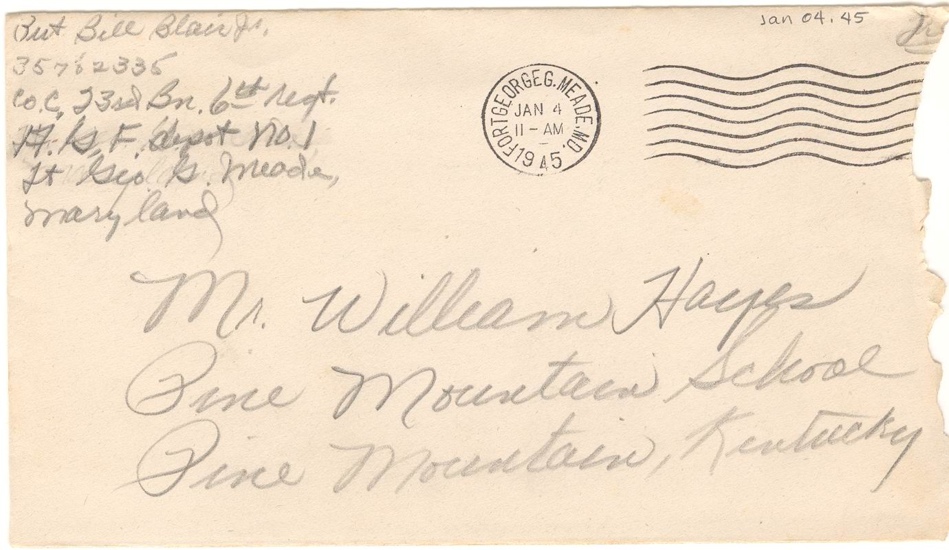 Two additional letters are included in the Blair letters that are not written by Blair but by classmates who shared the war experience. The two students are NOEL V. WELLS and “DAN” [BUCK JONES]. A note on the reverse of the Jones letter remembers that he was from Coxton, Kentucky, the mining town where Bill Hayes was from and was an usher at the wedding of Fern and Bill and a “swimming buddy” of Bill’s. [The note is in the hand of Fern Hayes, Bill Hayes’ wife.]