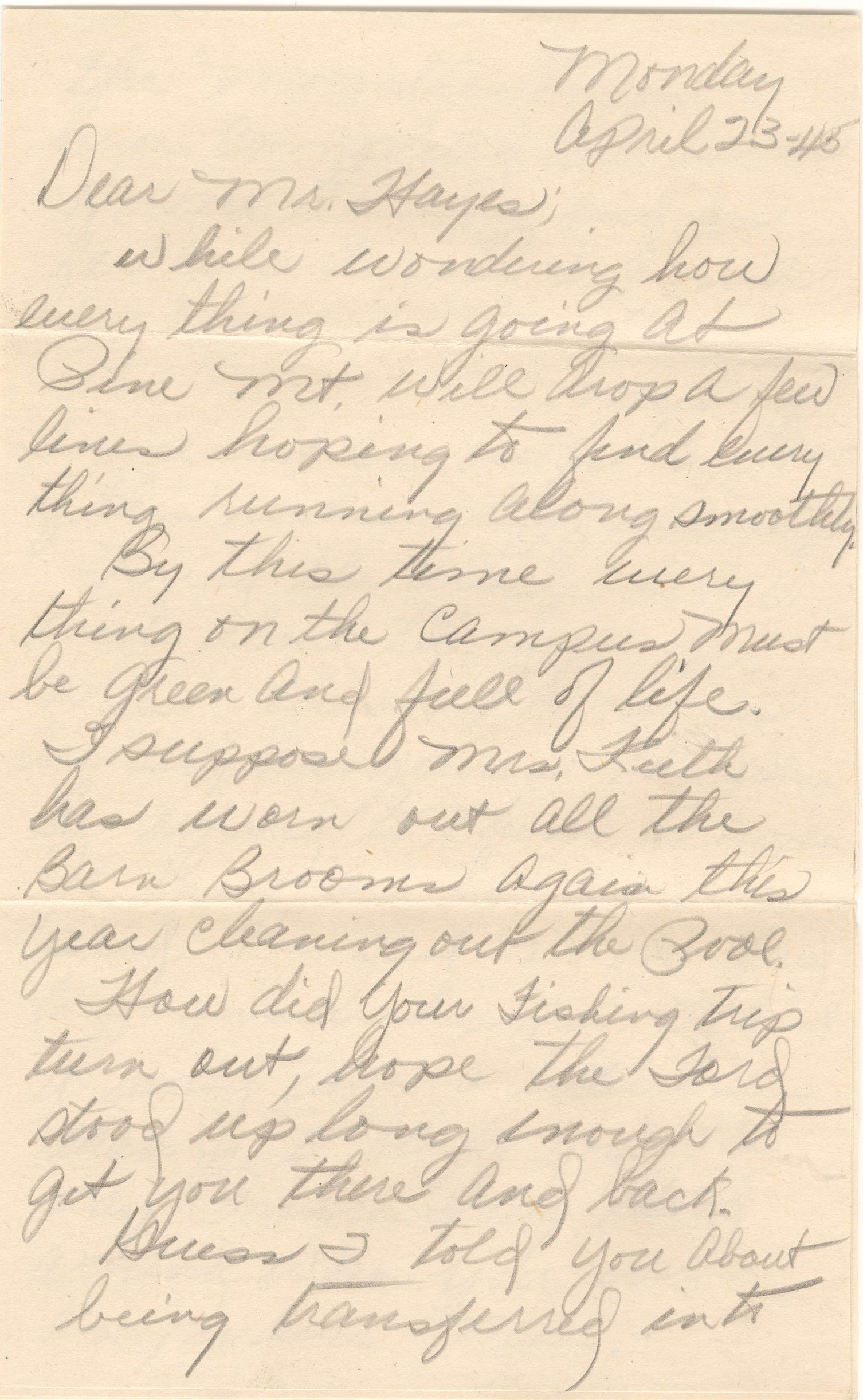 The letters also capture the difficult years of World War II and the pressure it placed on the School and on the families who had children attending Pine Mountain. It records the anxiety of young men going to war and the interruption in the educational processes for young men at the School as well as the interruption in their assistance of their families.