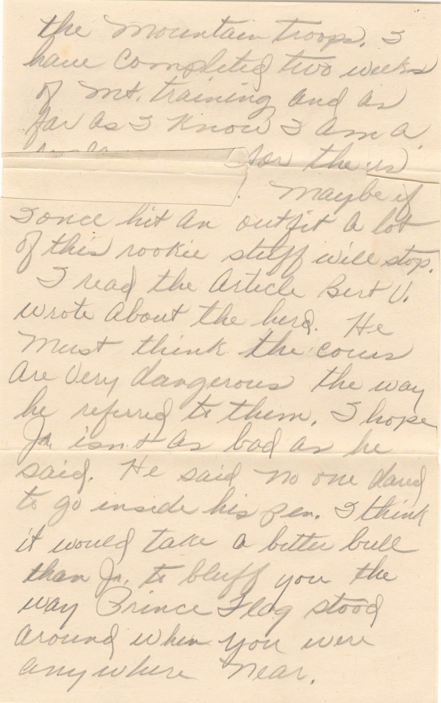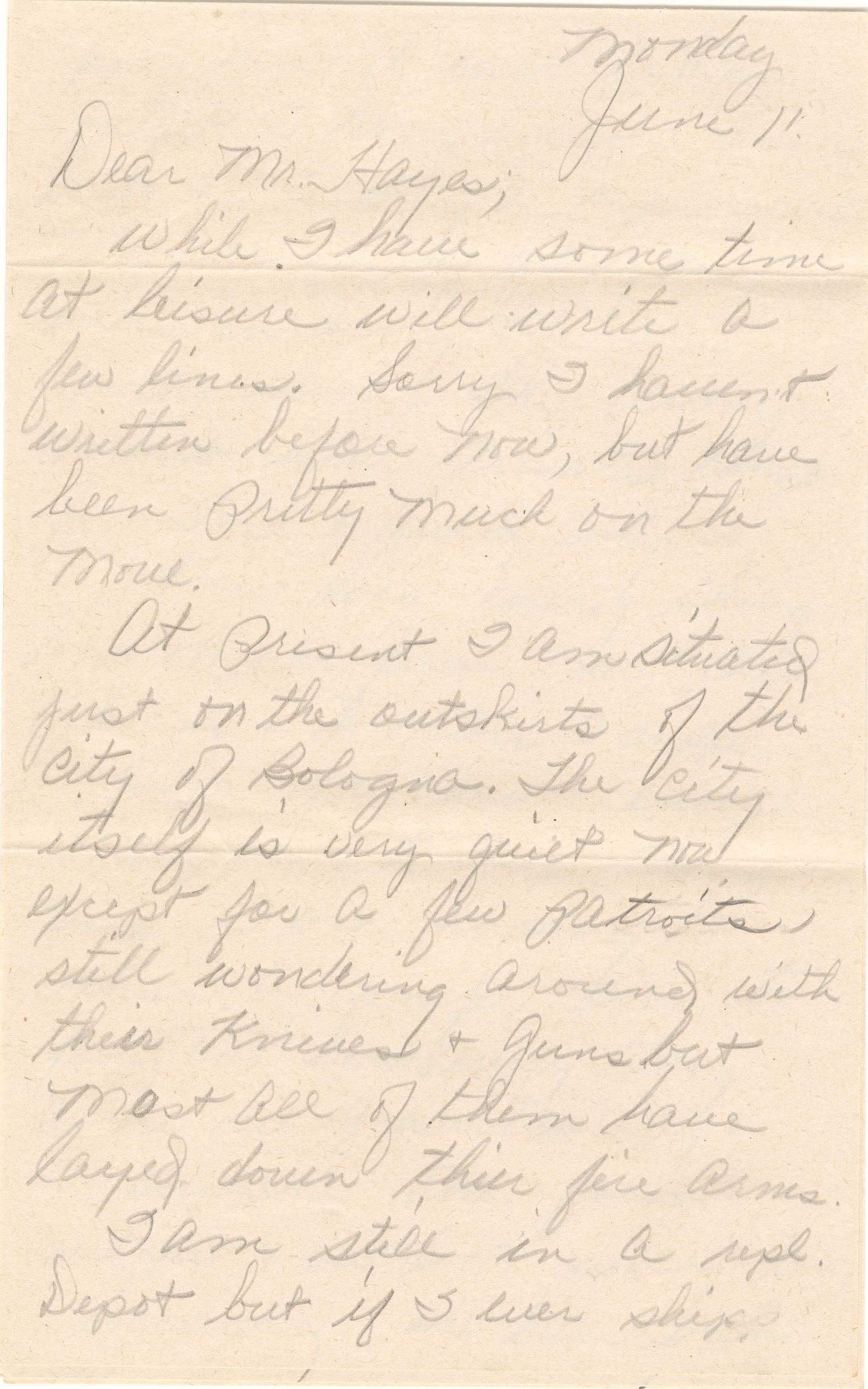 of the other well thought of places I can’t remember. Well I am going to write Paul [Paul Hayes] and Tinsey Jones [“Dan” Buck Jones] . So I thought I would let you know. I still exist in this war and haven’t forgotten you and the Boys of yesterday. Tell all Hello — and answer soon.