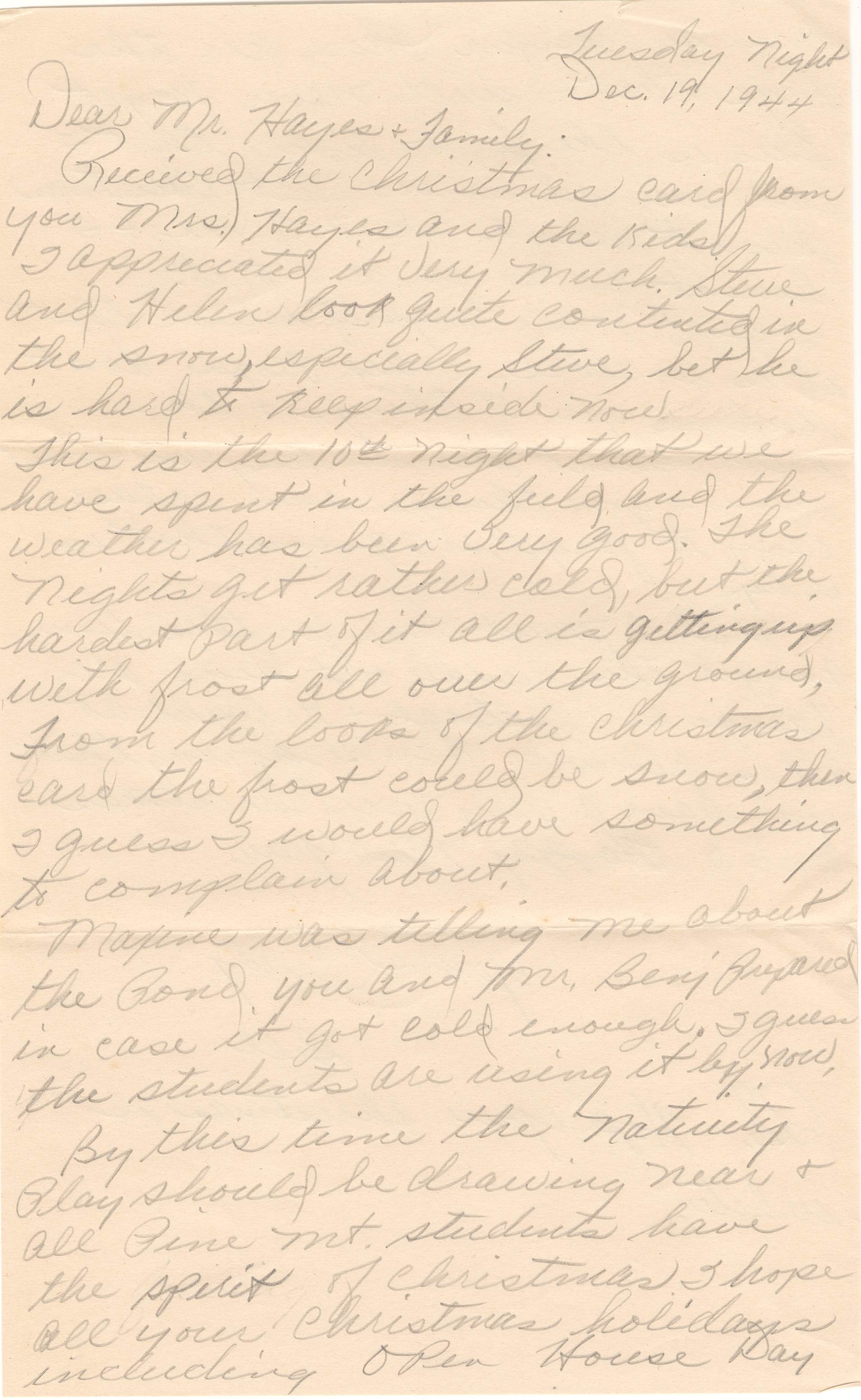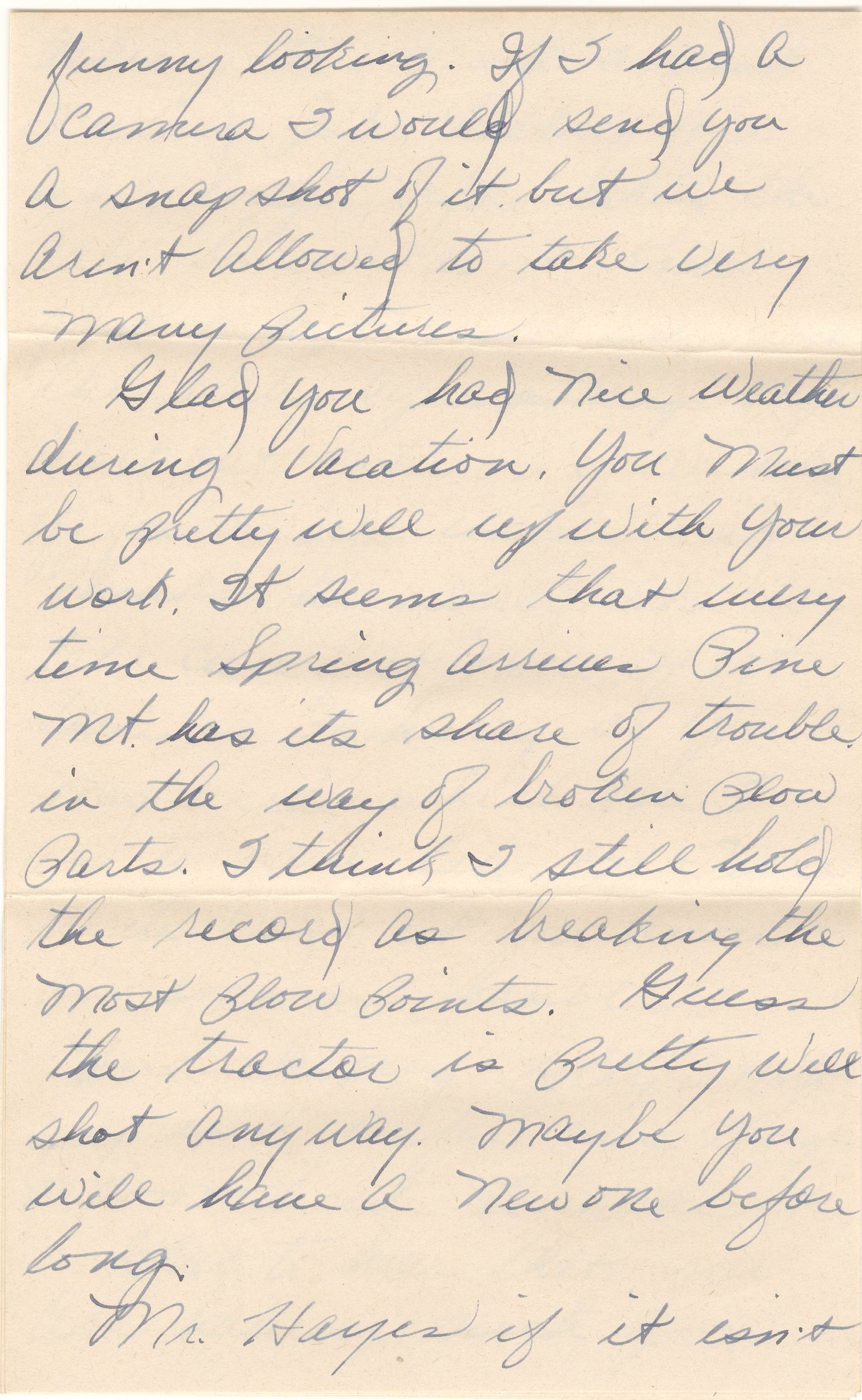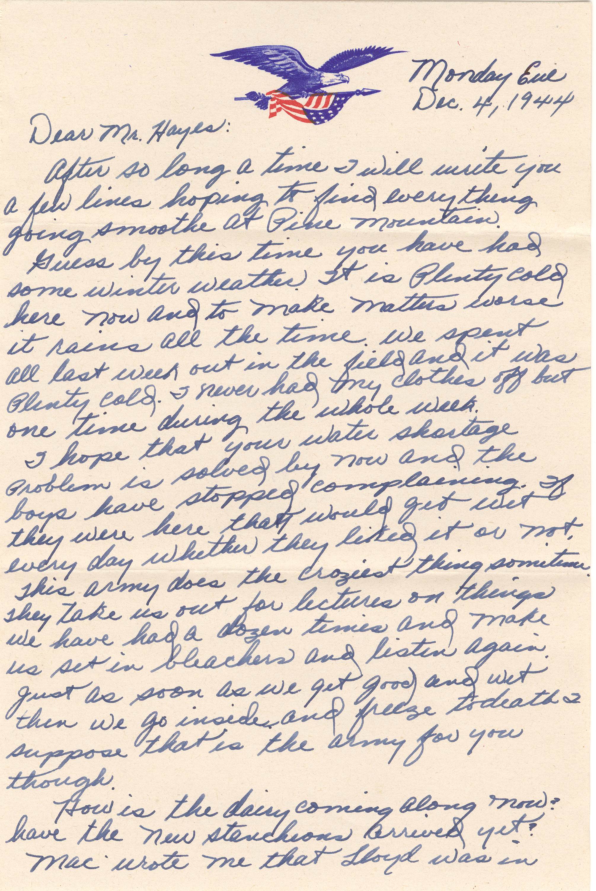 The letters of Bill Blair are addressed to William Hayes who was farm manager at Pine Mountain from 1937 until 1953. Hayes assumed the responsibilities for the farm shortly before his graduation from high school at Pine Mountain in 1937. Bill Blair was one of many students who worked on the farm crew at the School and under farmer Hayes. Bill Blair left in 1944 to join the war effort and was in training when he corresponded with Hayes. The letters contain much information about the farm program at the School, the disciplines learned in the program and the application of those disciplines in military service.