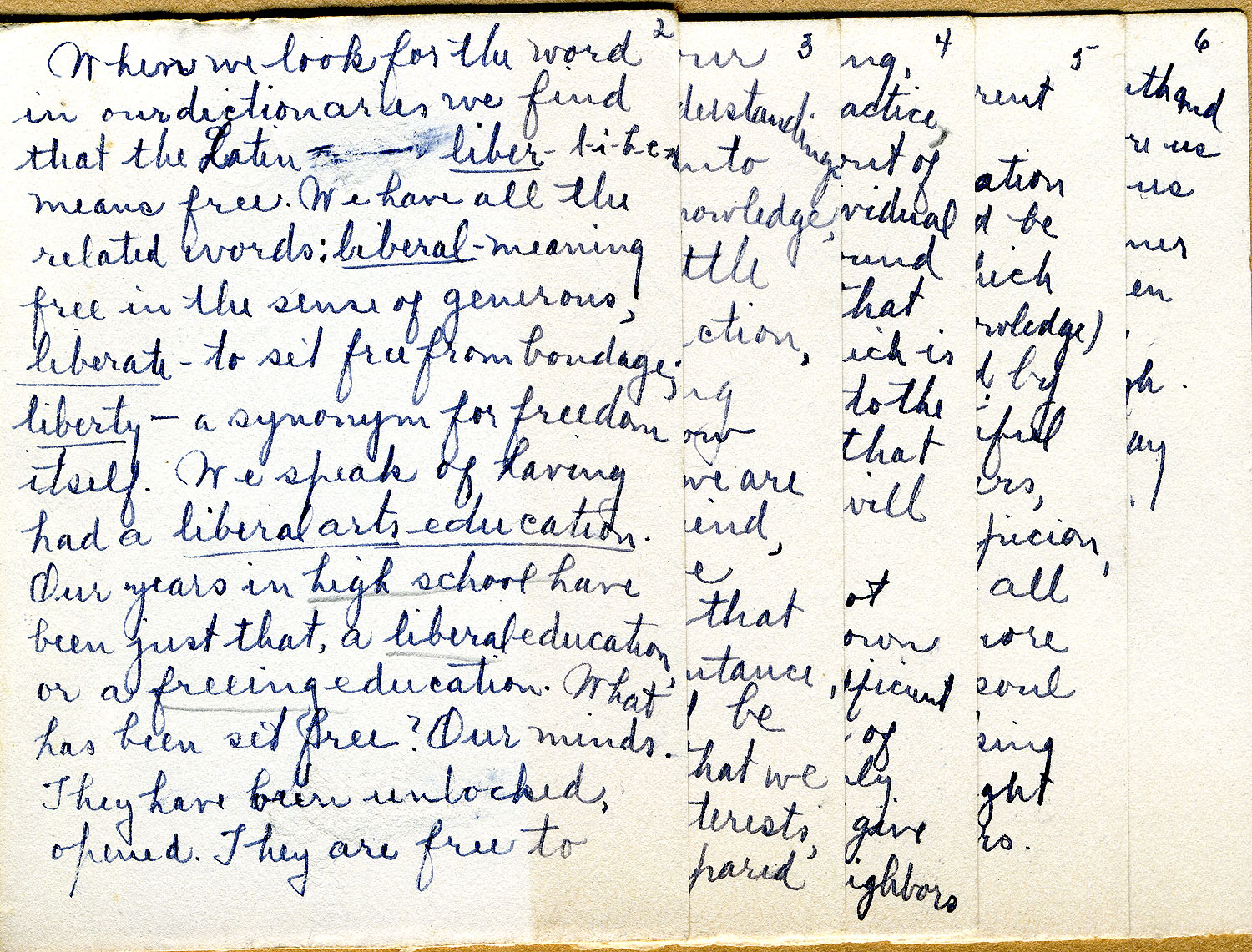 When we look for the word in our dictionaries we find that the Latin, “liber” l-i-b-e-r means free in the sense of generous, liberate – to set free from bondage, liberty — a synonym for freedom itself. We speak of having had a liberal arts education. Our years in high school have been just that, a liberal education or a freeing education. What has been set free? Our minds. They have been unlocked, opened. They are free to travel just as far as our sympathies and understandings reach. We have dipped into a number of fields of knowledge, perhaps we have had little more than an introduction, but we have a speaking acquaintance, we know just as surely as when we are presented to a new friend, that here or there we have found something that bears further acquaintance, something that must be cultivated. So it is that we all find our special interests, and abilities, and we are prepared to keep right on advancing, studying, putting into practice, working in school, or out of school to use that individual talent which we have found to be ours to the end that we create something which is our worthy contribution to the sum of good things that men have done and will do.
