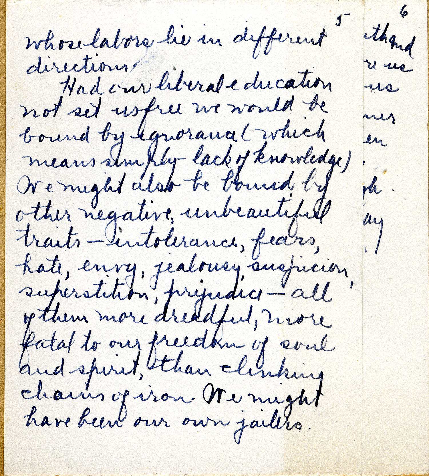 Had our liberal education not set us free we would be bound by ignorance (which means simply lack of knowledge). We might also be bound by other negative, unbeautiful traits — intolerance, fears, hate, envy, jealousy, suspicion, superstition, prejudice — all of them more dreadful, more fatal to our freedom of soul and spirit, than clinking chains of iron. We might have been our own jailers.