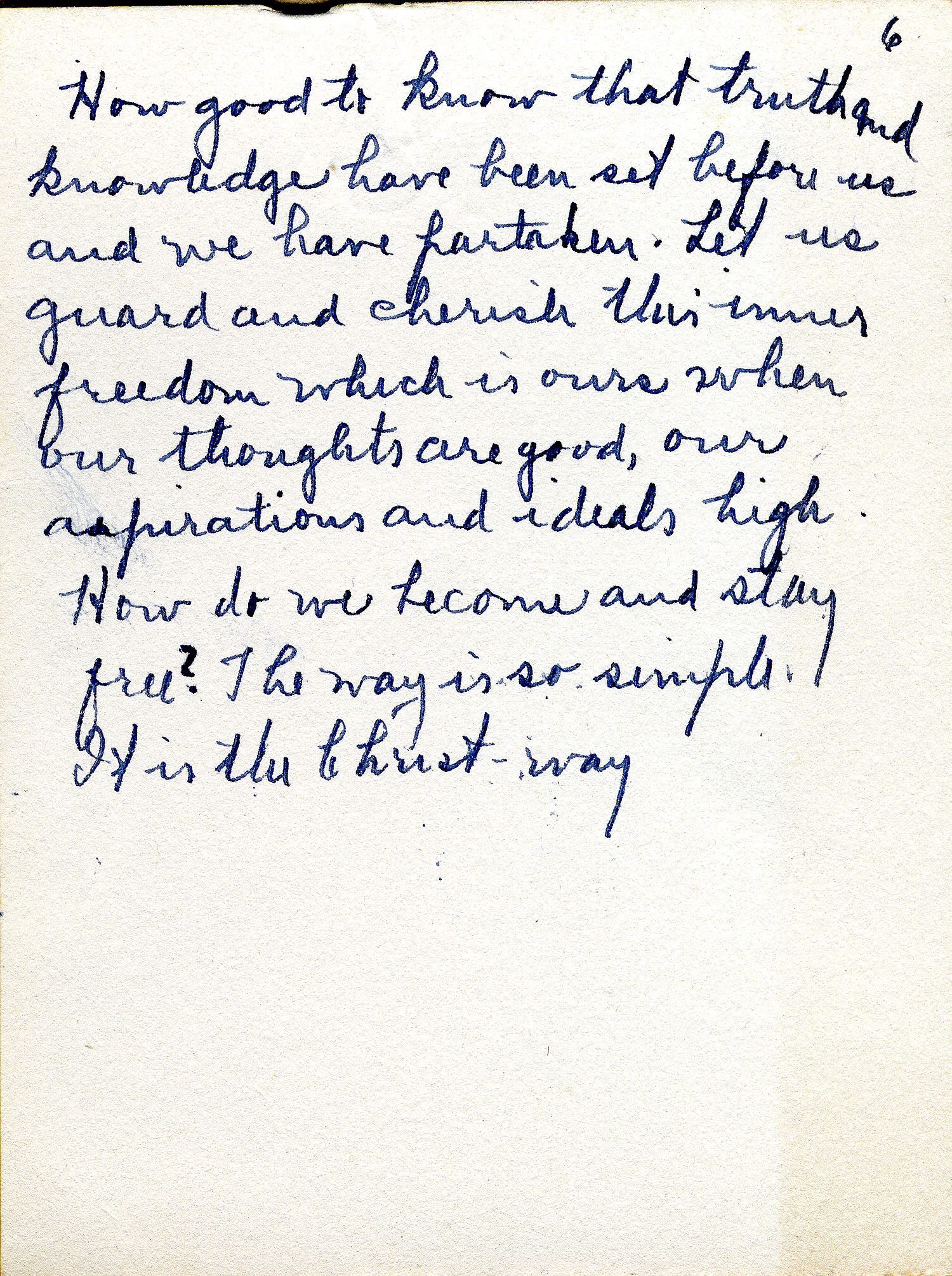 How good to know that truth and knowledge have been set before us and we have partaken. Let us guard and cherish this inner freedom which is ours when our thoughts are good, our aspirations and ideals high. How do we become and stay free? The way is so simple. It is the Christ – way.