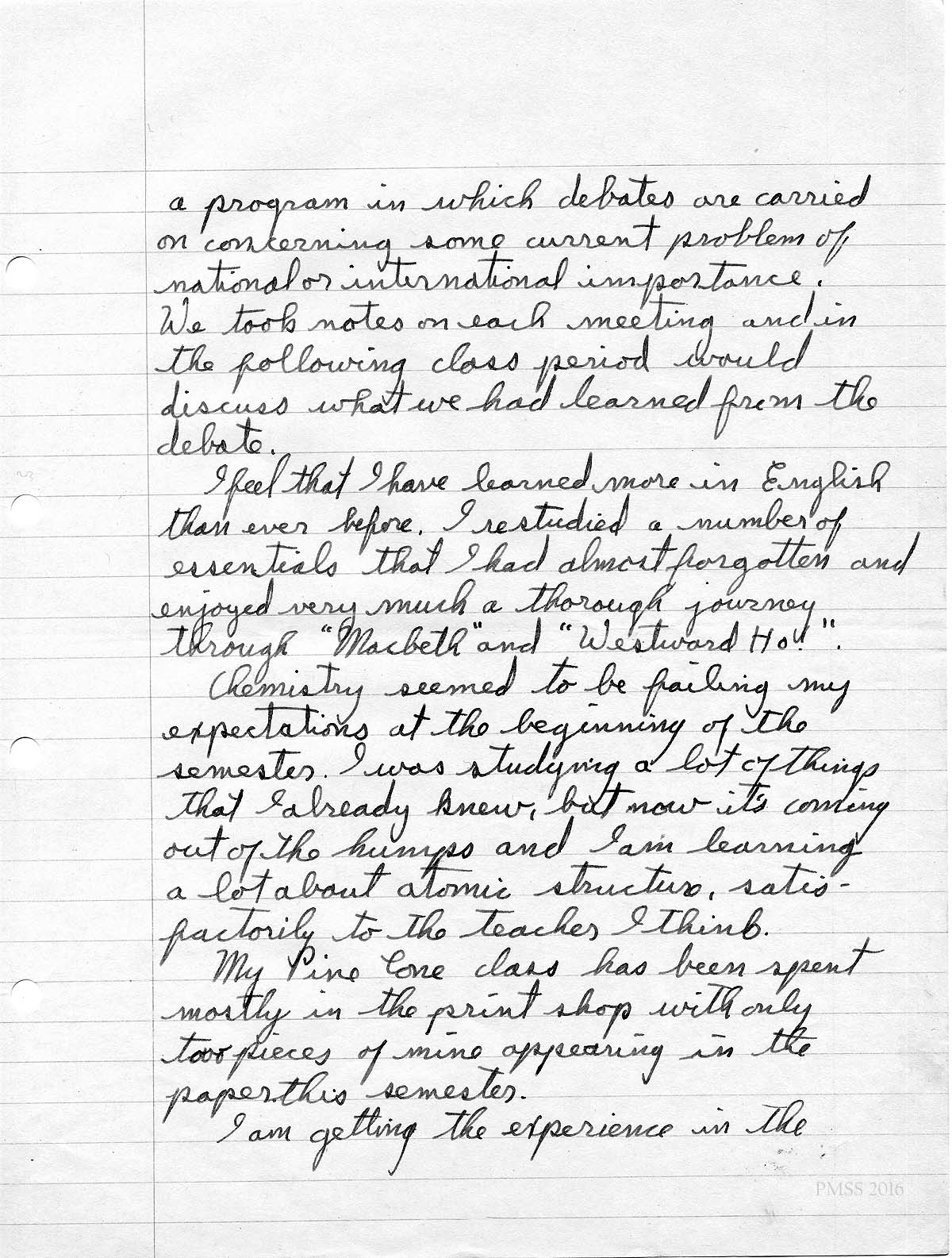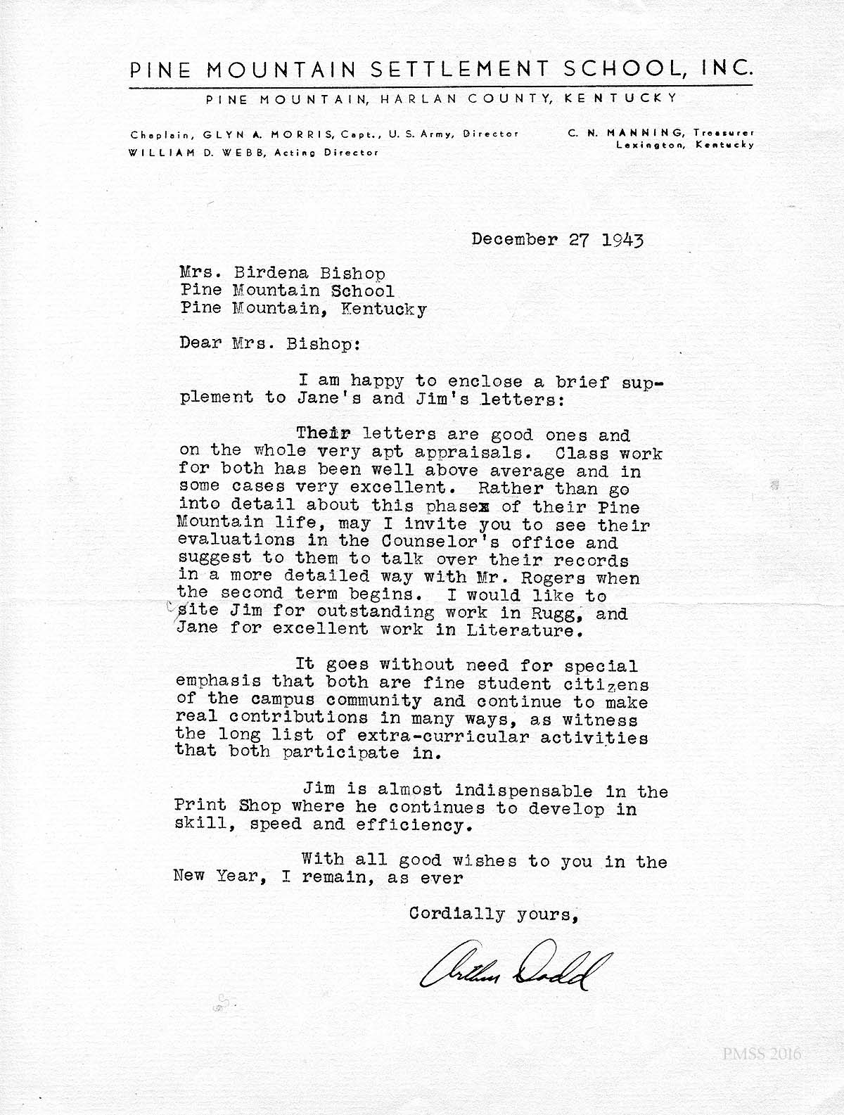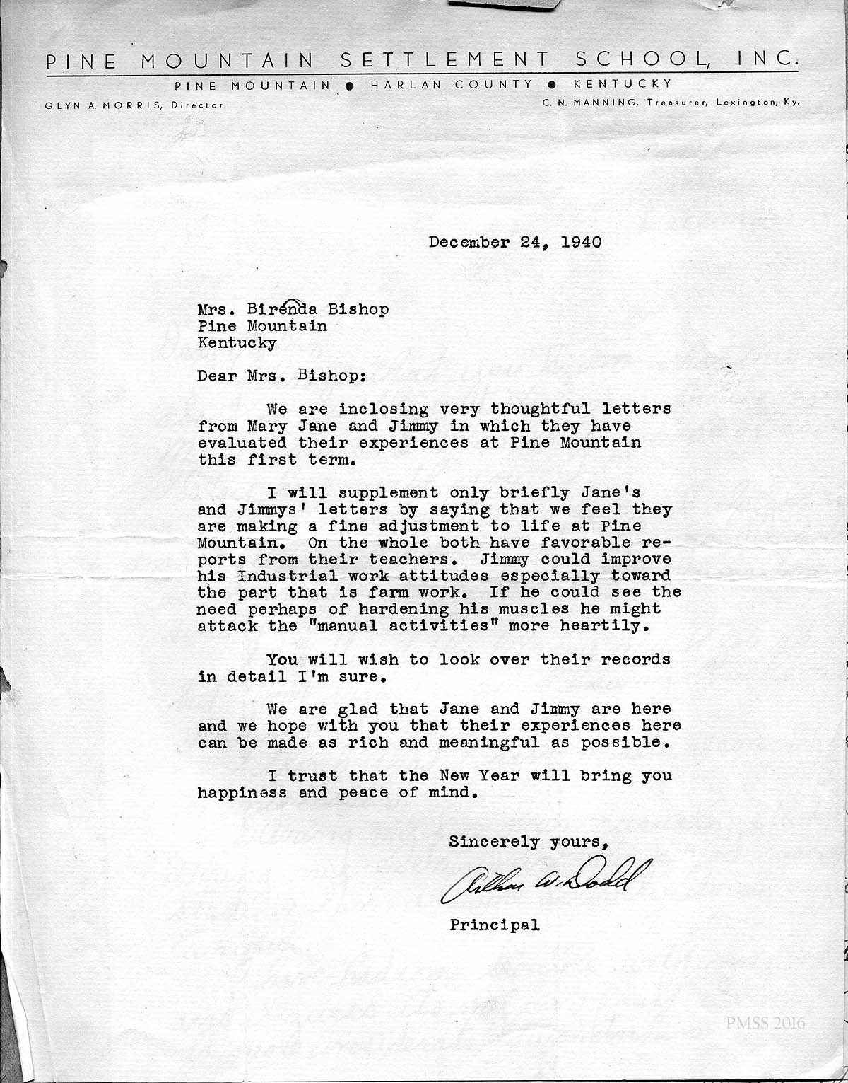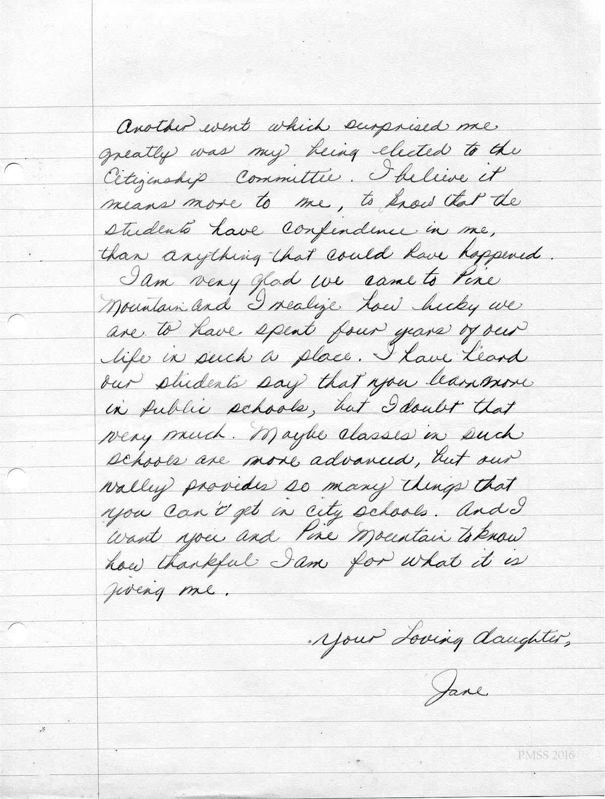 While at Pine Mountain all students in the program were required to write a self-report to be sent to parents. It was to reflect how the student saw their progress for the year. The following letters were written by Mary Jane and James Bishop to their mother Birdena Bishop. They were saved by Birdena in her Scrapbook assembled with highlights of her years at Pine Mountian (1940 – 1944) . The reports of her children represent the years of 1940-1943.