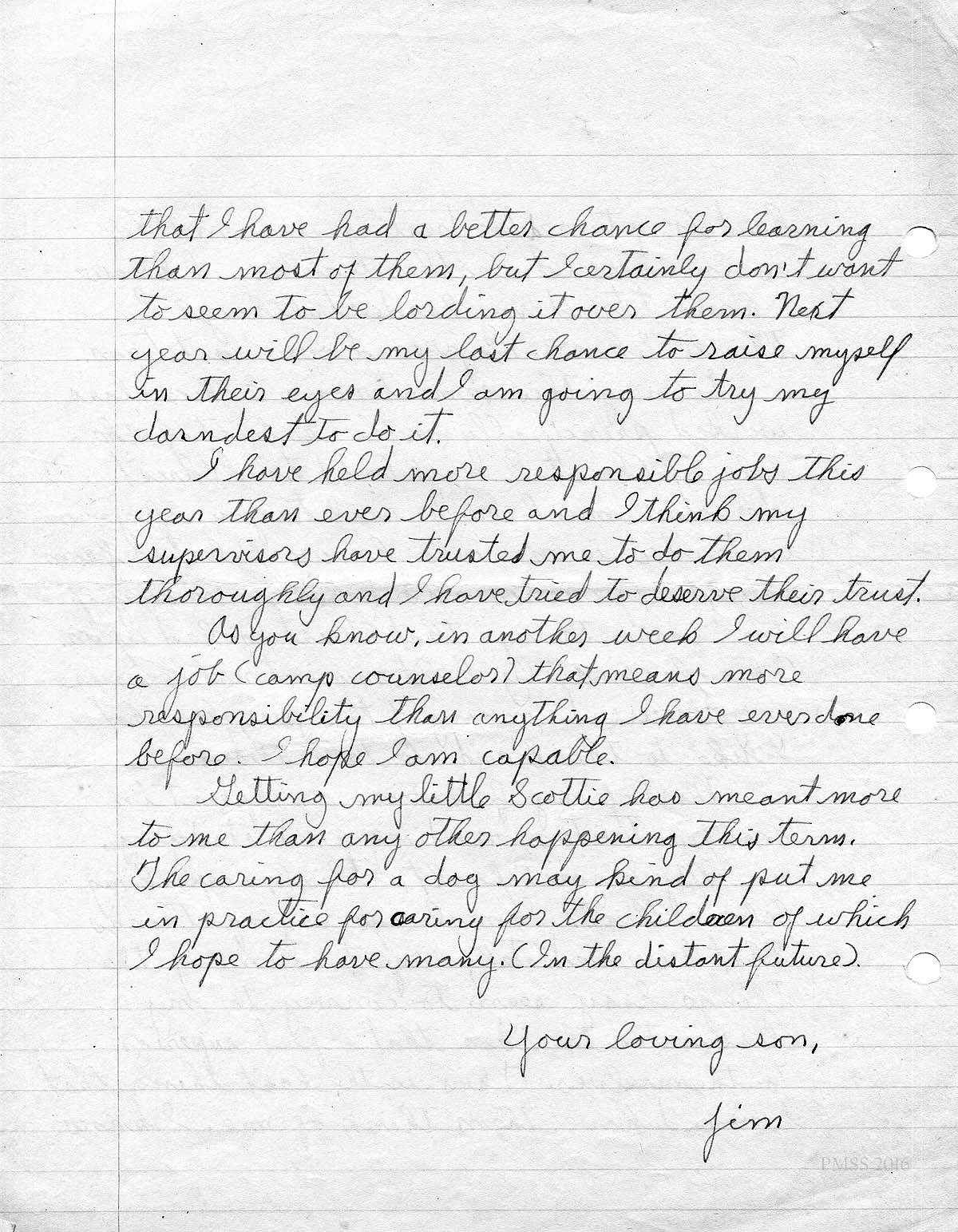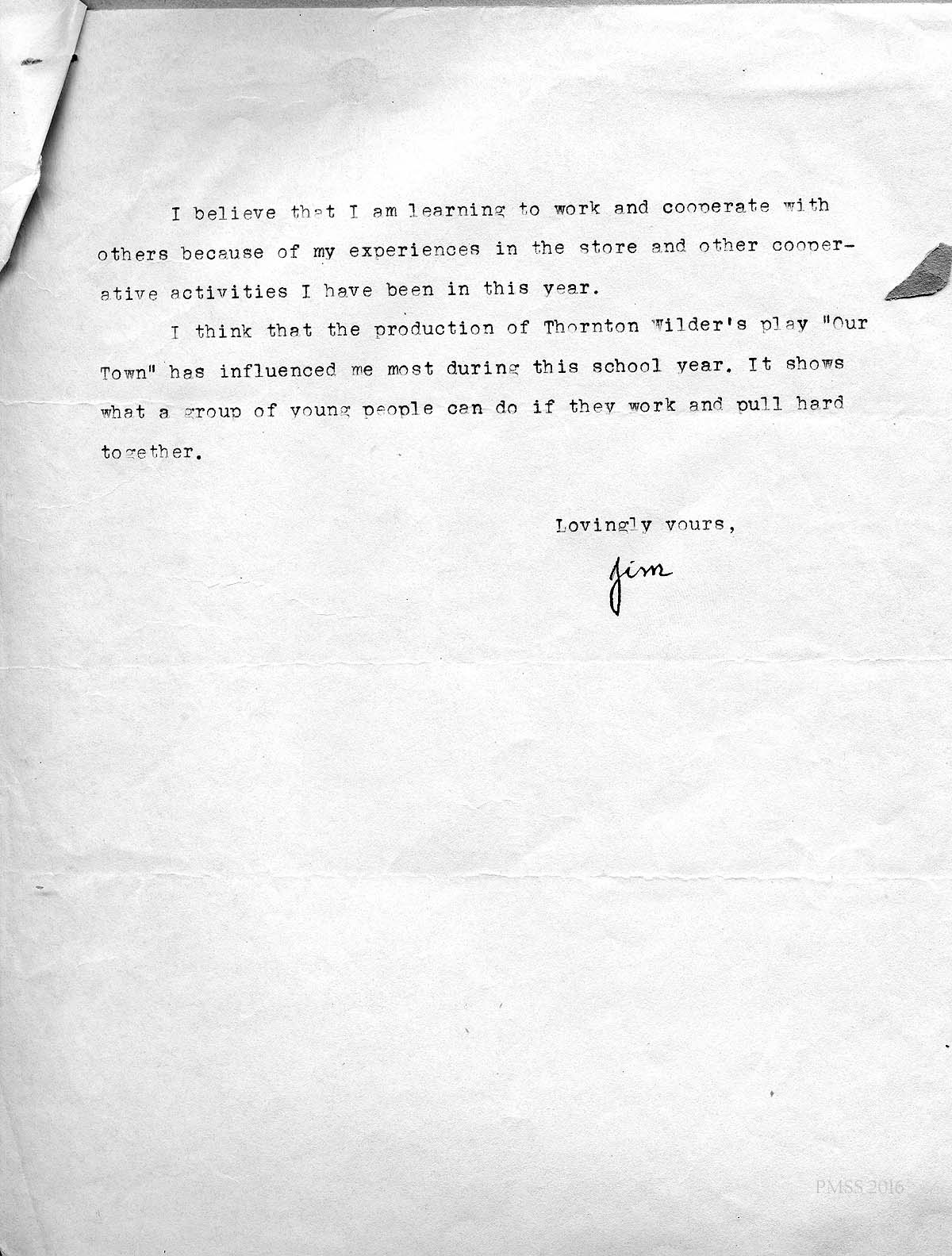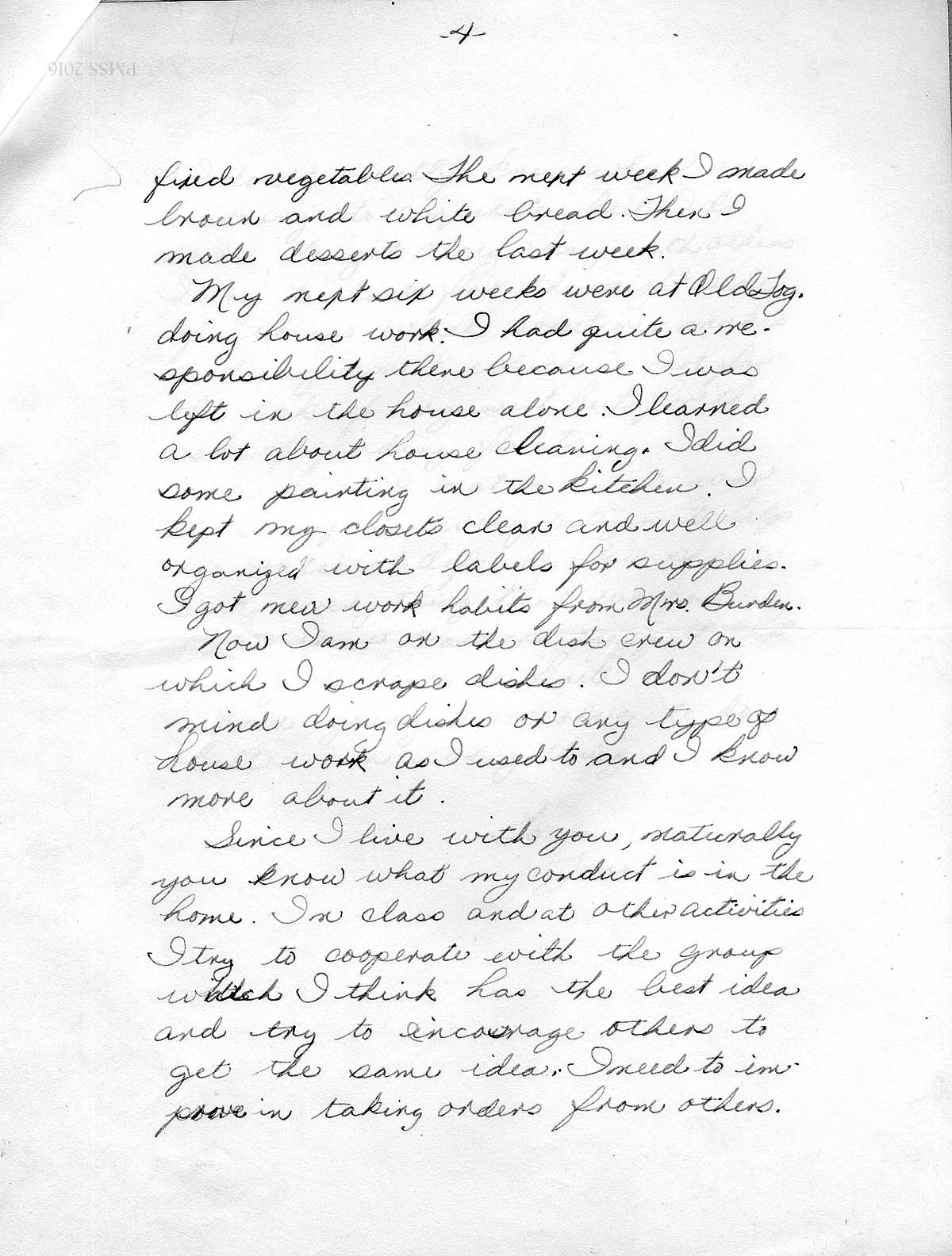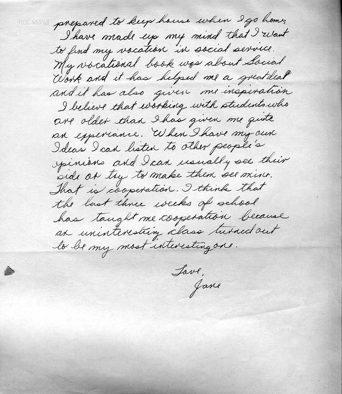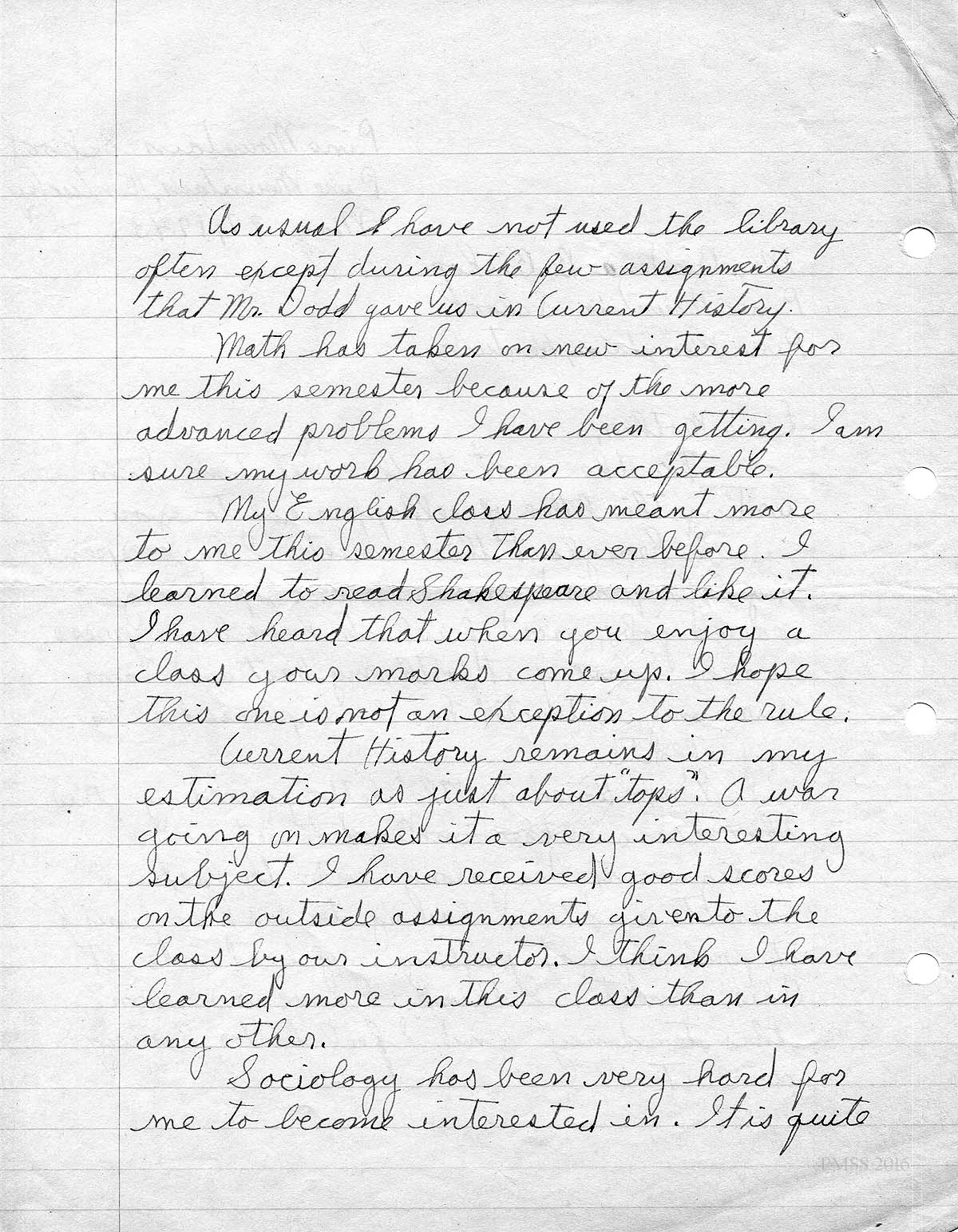 While at Pine Mountain all students in the program were required to write a self-report to be sent to parents. It was to reflect how the student saw their progress for the year. The following letters were written by Mary Jane and James Bishop to their mother Birdena Bishop. They were saved by Birdena in her Scrapbook assembled with highlights of her years at Pine Mountian (1940 – 1944) . The reports of her children represent the years of 1940-1943.