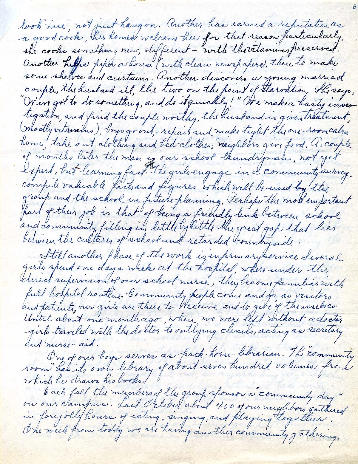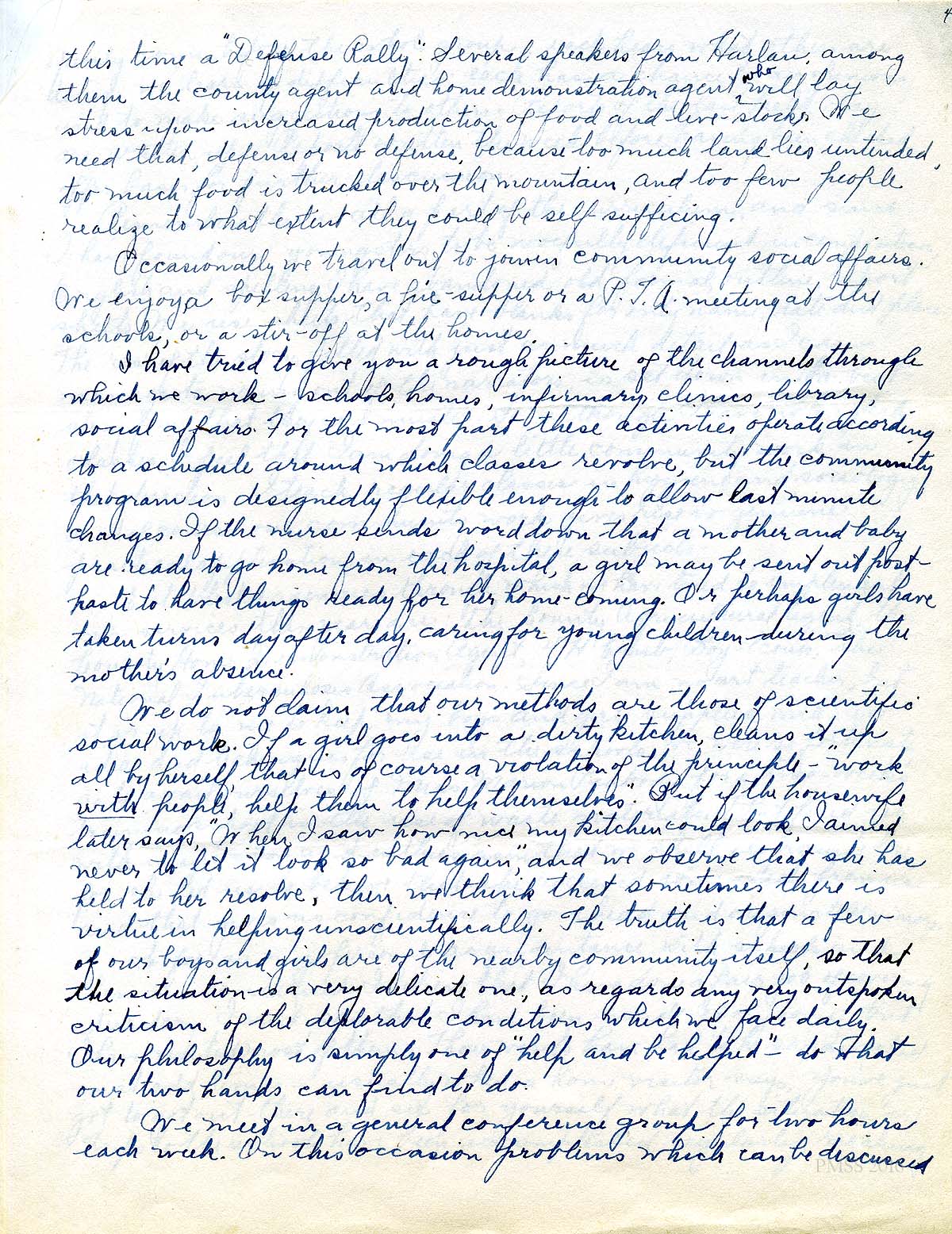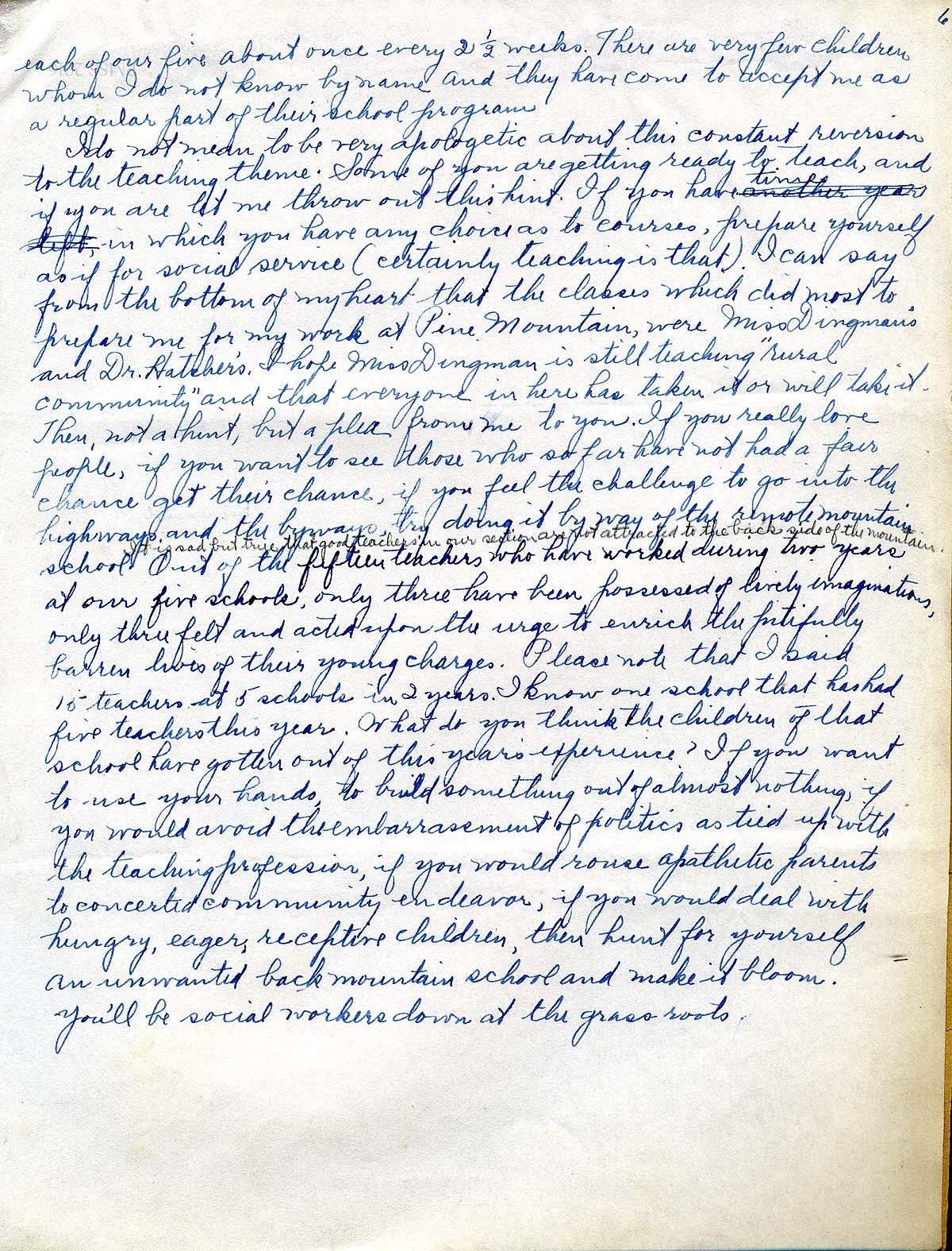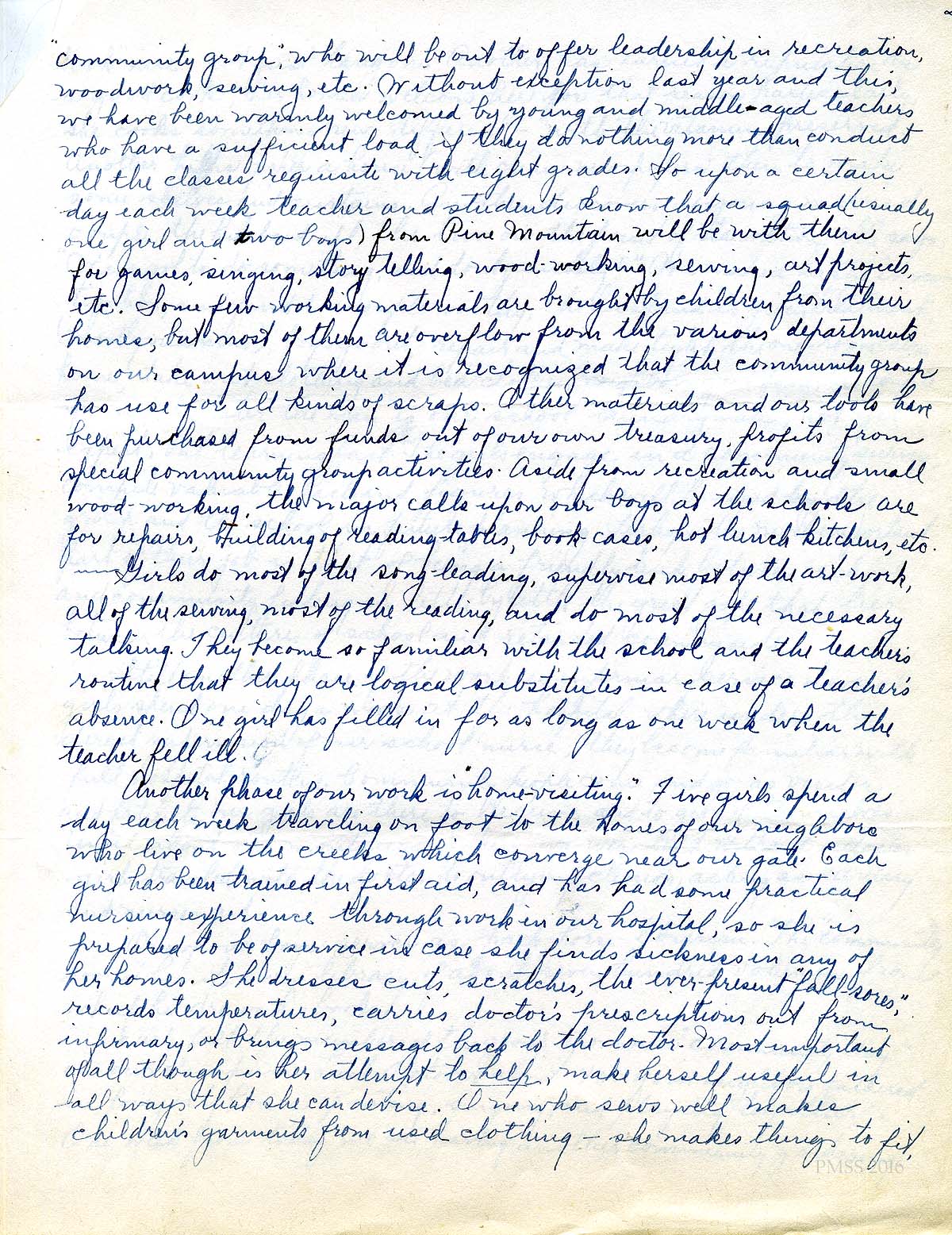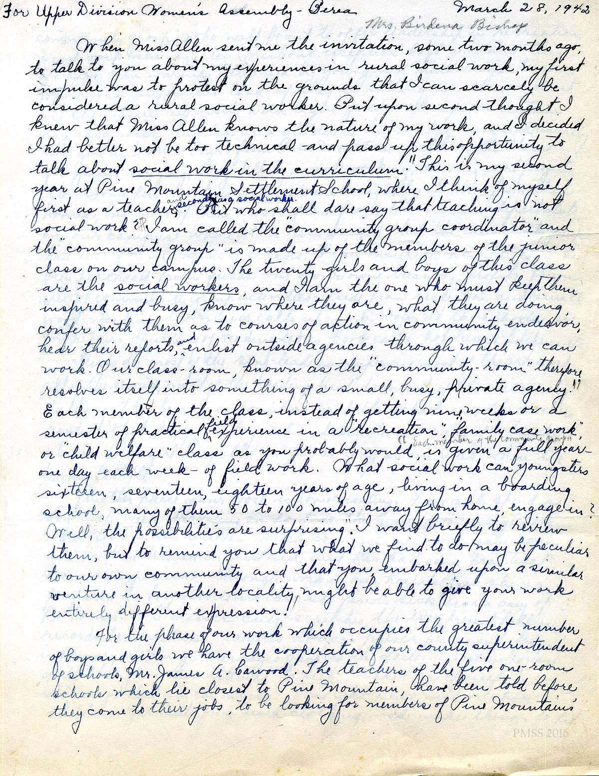 The Birdena Bishop talk to the Women’s Assembly of Berea College on March 28, 1943 was on the invitation of Miss Allen, the Dean of Women at the college. Given in the second year of her employment at Pine Mountain, the talk centered on her work at the School as a teacher. She reflects on how her social work degree is used in her teaching and in her community work with the students, particularly “home-visiting.” pack library and infirmary work all of which was part of the curriculum under the direction of Glyn Morris and Arthur Dodd. She also describes the school work during war-time.