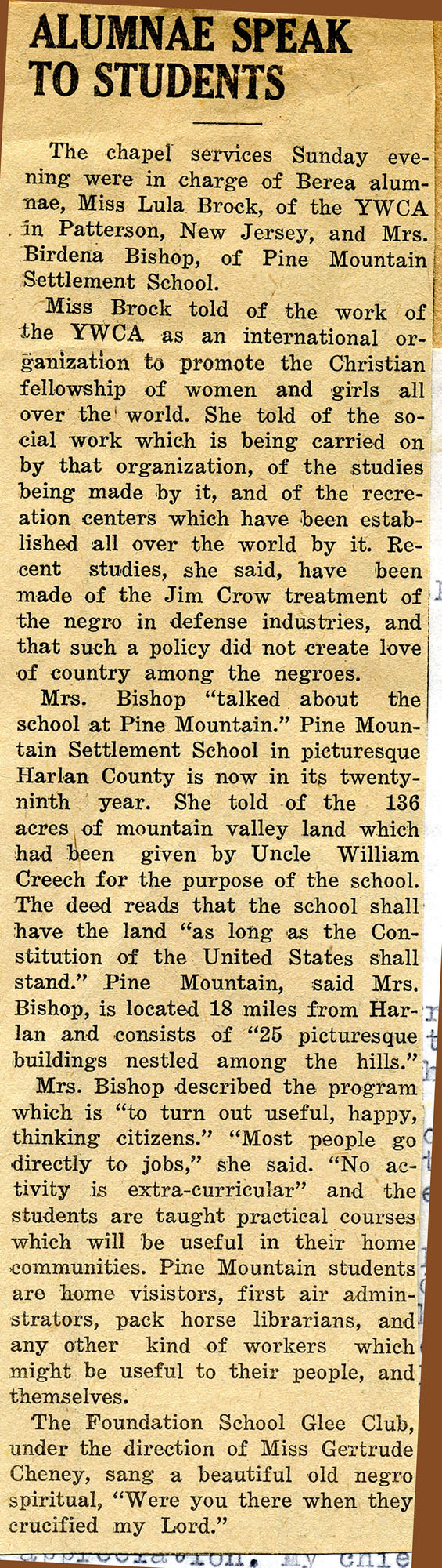 BIRDENA BISHOP – Women’s Assembly Talk, Berea College, March 28, 1942