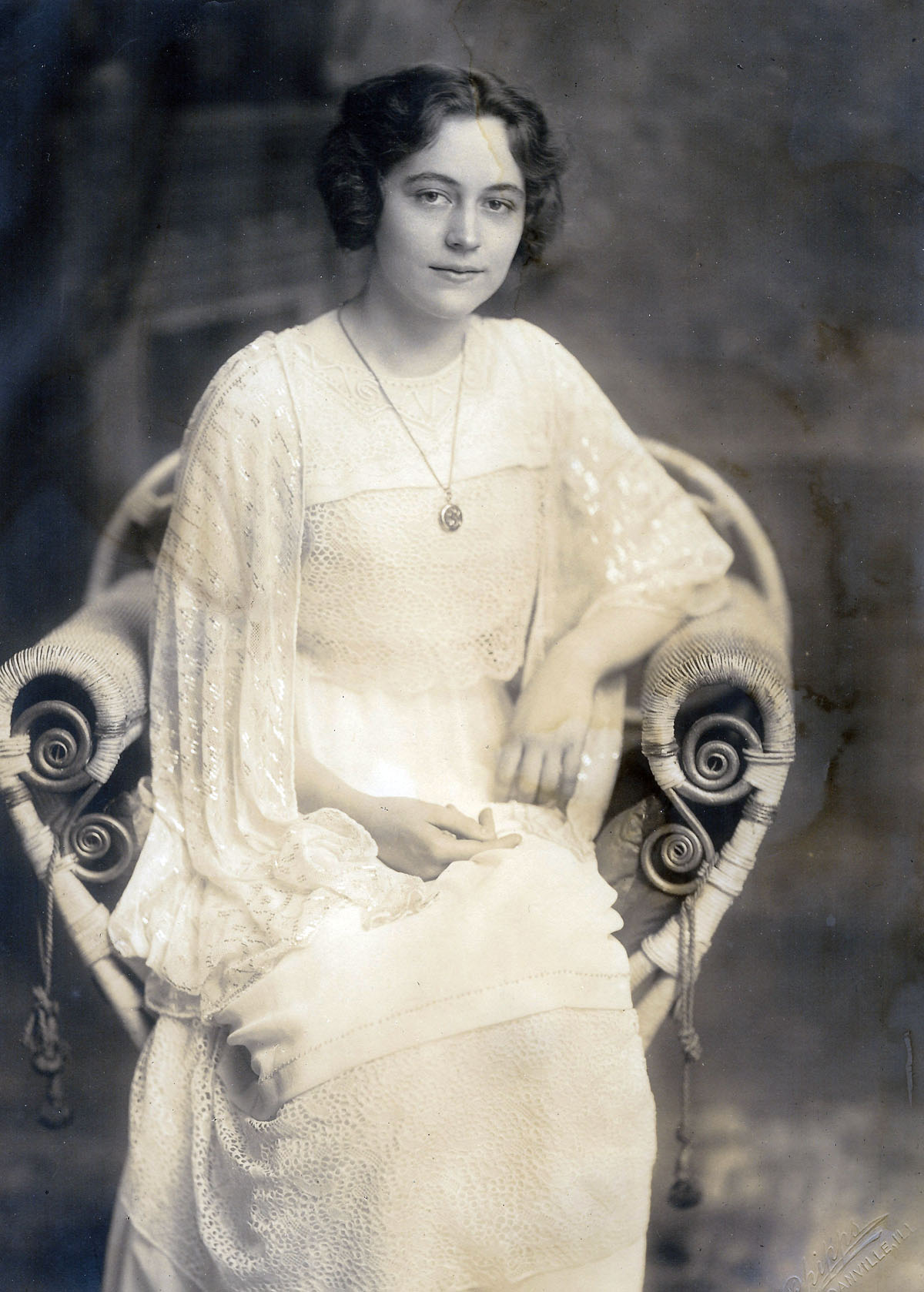 - January 1918; at William & Anna Cathcart’s, 303 South Gray Street, Sidell, Illinois; Celia Cathcart in wedding gown. [1918-01-00-cathcart-celia-wedding]