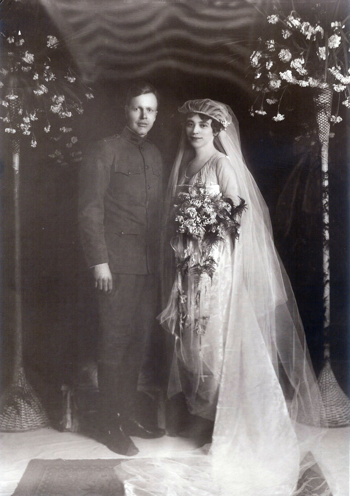- 16 January 1918; at Methodist Episcopal Church, Sidell, Illinois; wedding of Celia Cathcart & Caryl Holton; Celia & Caryl; Caryl in military uniform. [1918-01-16-cathcart-celia-holton-caryl-wedding]