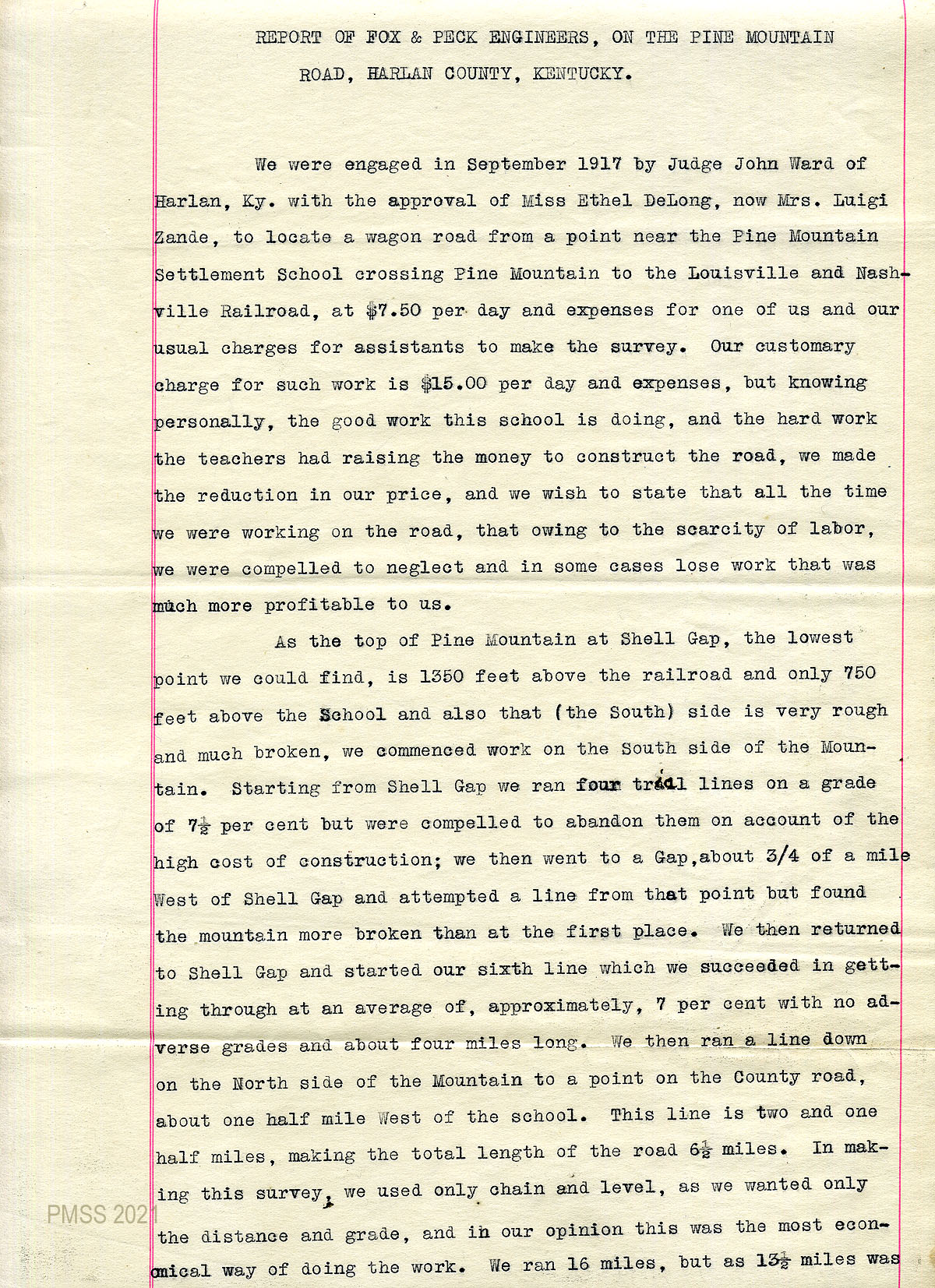 1919_03_31 March 31, 1919. Page 1 of a carbon copy of a three-page report from Fox, titled “Report of Fox & Peck Engineers, on the Pine mountain Road, Harlan County, Kentucky.” Fox covers the history of Fox & Peck’s association with the road construction beginning September 1917. Describes the road’s location and charges for the survey, which have been reduced due to his personal knowledge of “the good work this school is doing” and the hard work of the teachers’ fundraising. He describes the difficulties of their survey work.