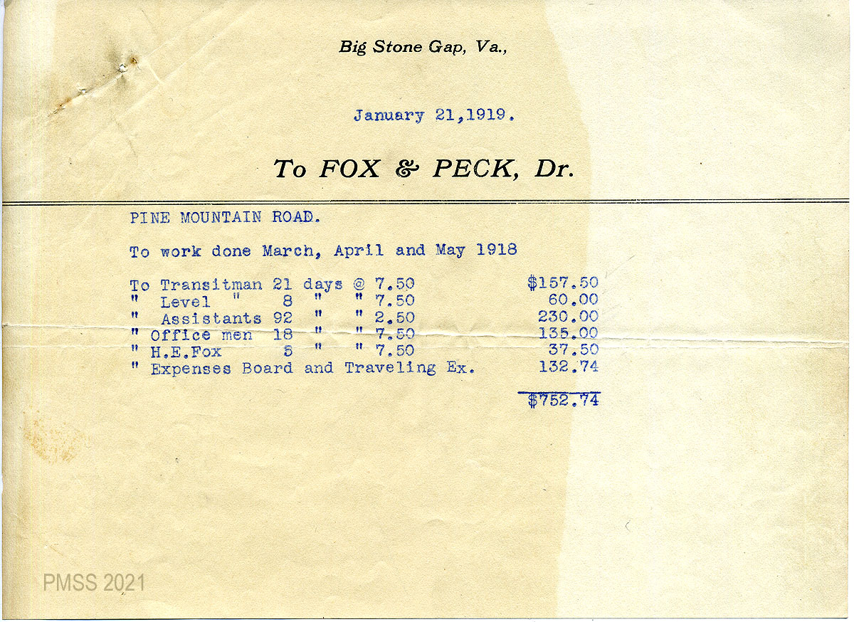 1919_01_21 (054) January 21, 1919. First page of a two-page invoice from Fox & Peck, Big Stone Gap, VA, for “Pine Mountain Road…work done March April and May 1918,” totaling $752.74.