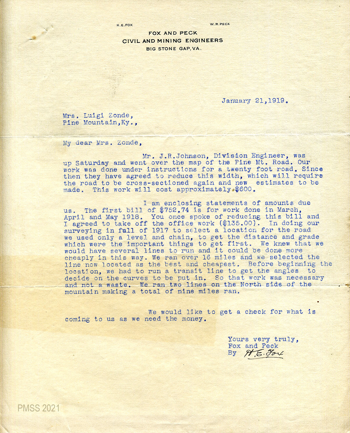 1919_01_21 January 21, 1919. To Ethel de Long Zande from Horace E. Fox of Fox & Peck, Civil and Mining Engineers, Big Stone Gap, VA. State Division Engineer J.R. Johnson told Fox that the officials agreed to reduce the road width from the original 20 feet. The new plans will cost approximately $600. He encloses statements of the amounts PMSS owes the engineers (reduced by removing the cost of the office work). He describes the surveying done in fall 1917.