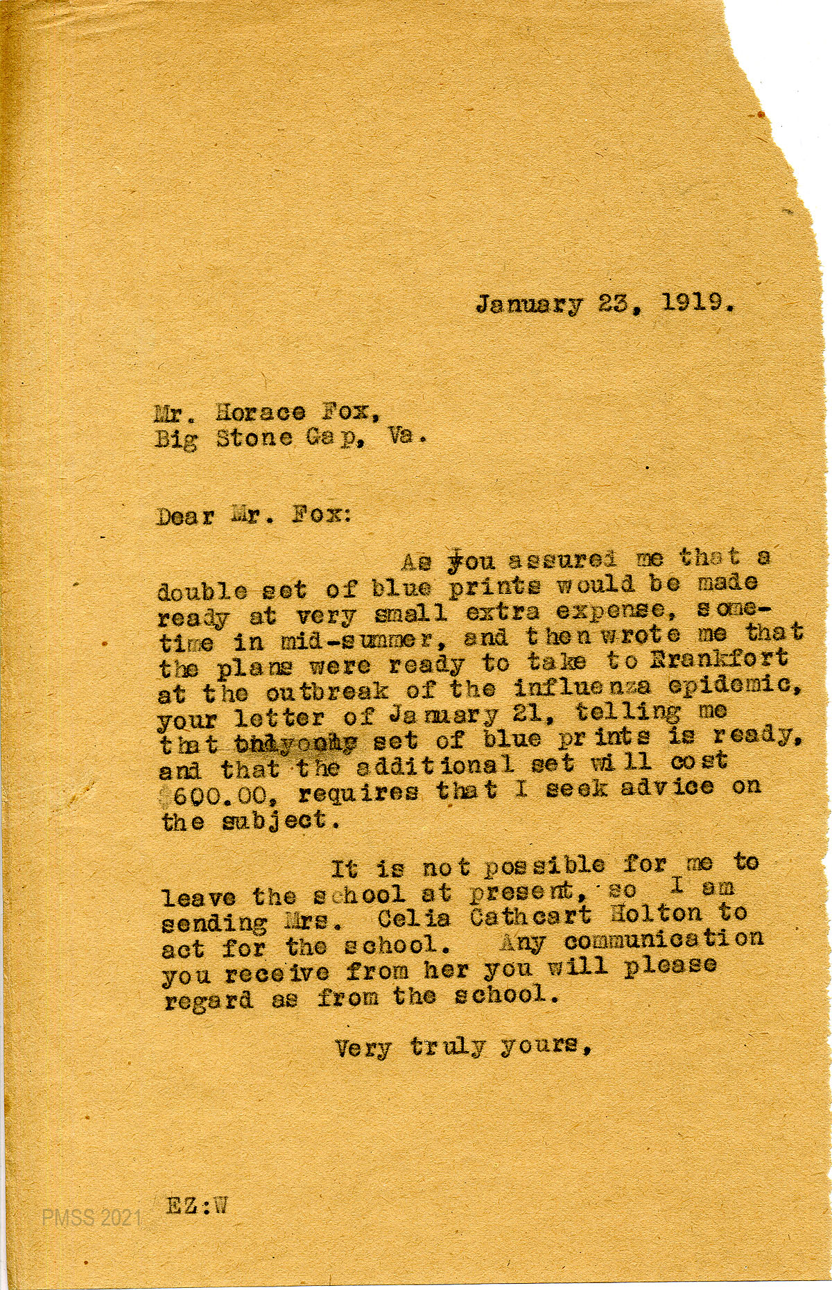 1919_01_23 (057) January 23, 1919. To Fox from EZ (Zande), who questions the cost of an additional set of blueprints and will need to seek advice. She has assigned Mrs. Celia Cathcart Holton to represent the School.
