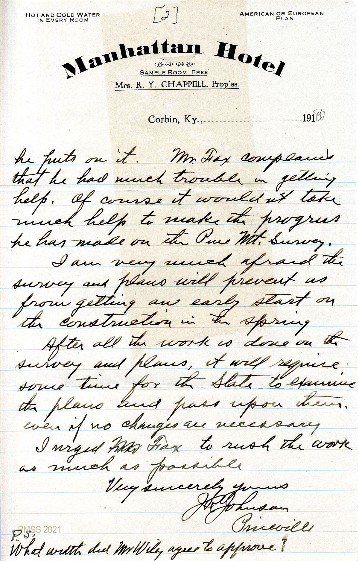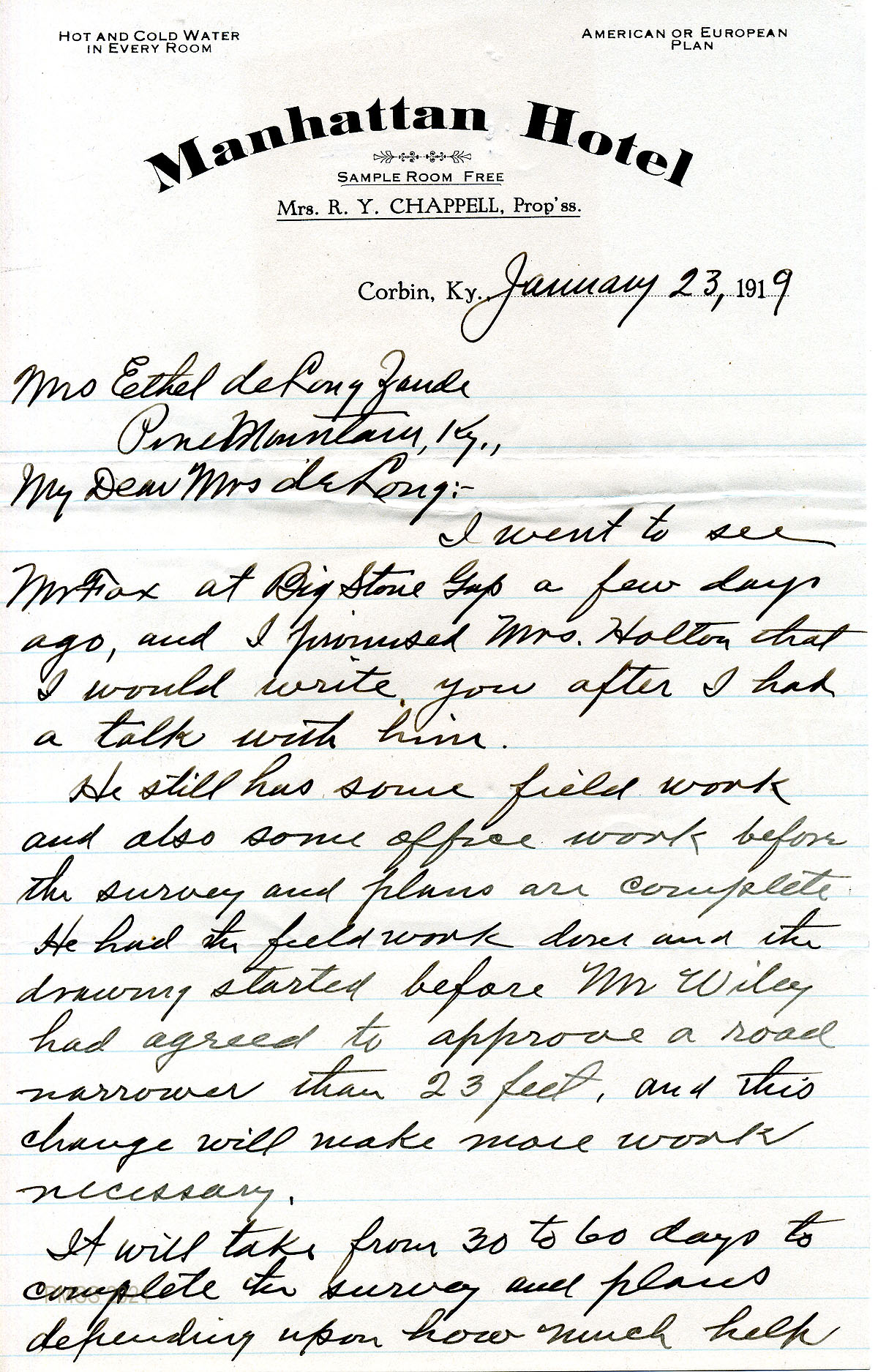 1919_01_23 (058) January 23, 1919. Page 1 of a two-page handwritten letter to Zande from J.R. Johnson, Pineville, KY, on letterhead for Manhattan Hotel, updating Zande on Mr. Fox’s work, which will now be increased since Mr. Wiley agreed to approve a road narrower than 23 feet. It will take from 30 to 60 days to complete the survey and plans….”