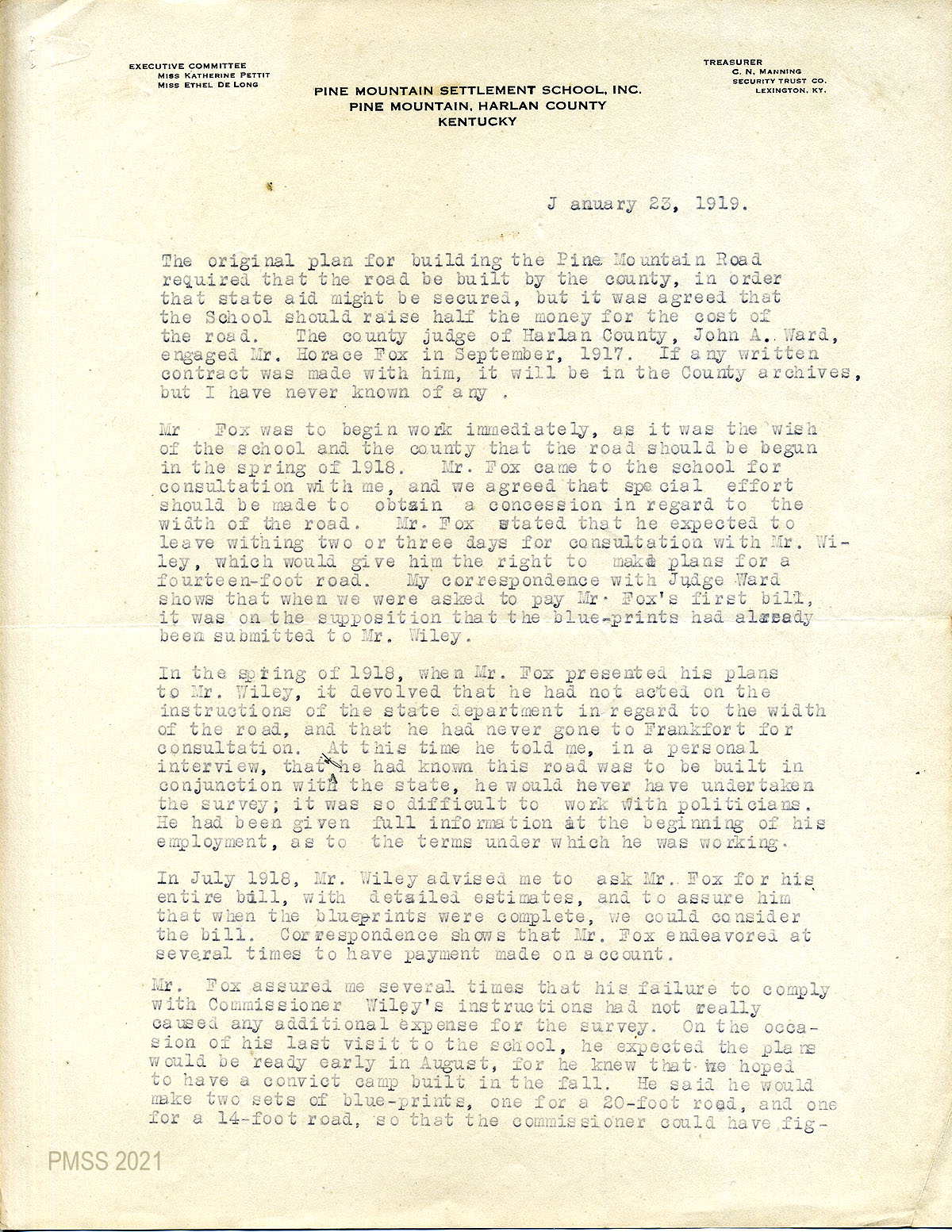 1919_01_23 (060) January 23, 1919. Page 1 of a two-page statement by Zande concerning the “Pine Mountain Road.” Zande explains the original plan to finance the construction and original agreements made with Horace Fox, Engineer (who was engaged in 1917 by Harlan County judge, John A. Ward). She describes Fox’s “failure to comply with Commissioner Wiley’s instructions.”