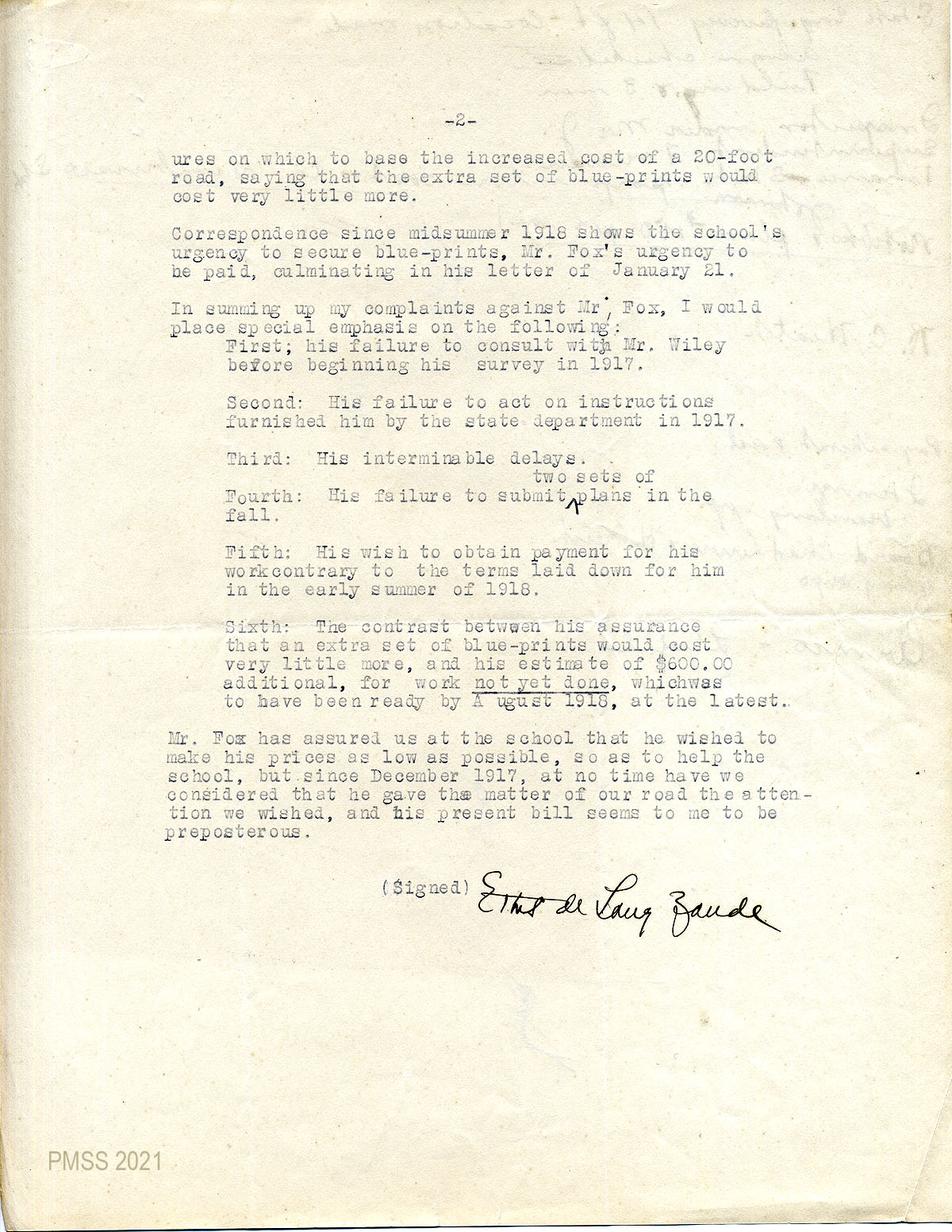 1919_01_23a (061) Page 2. Zande lists her “complaints against Mr. Fox,” including the “preposterous” charge for an extra set of blueprints.