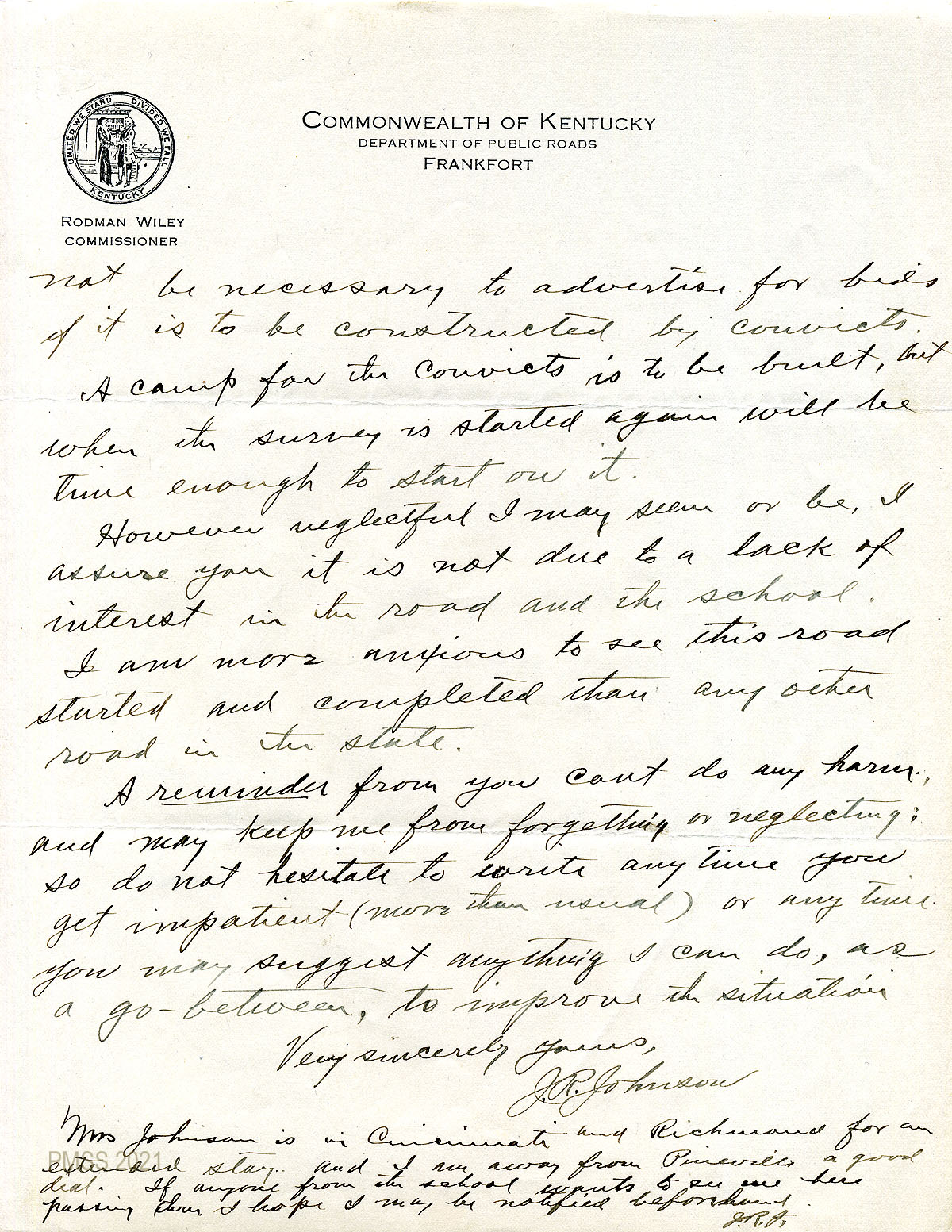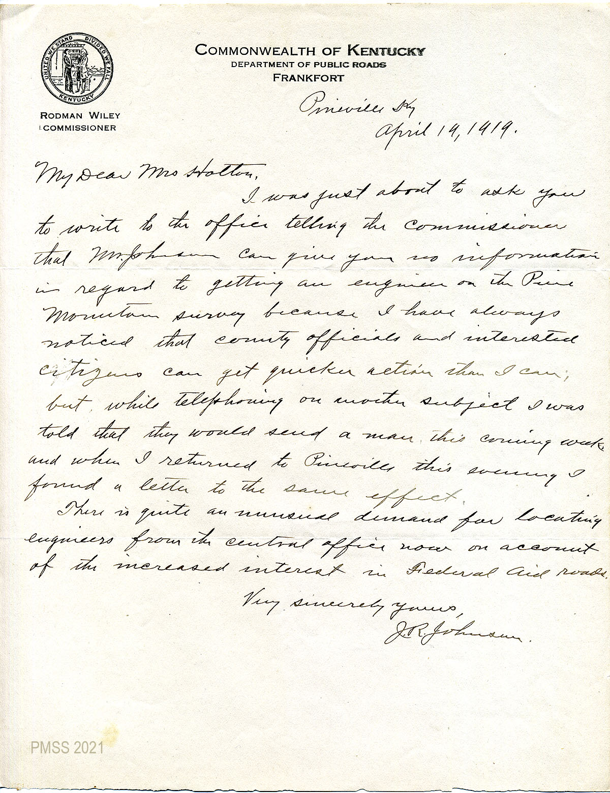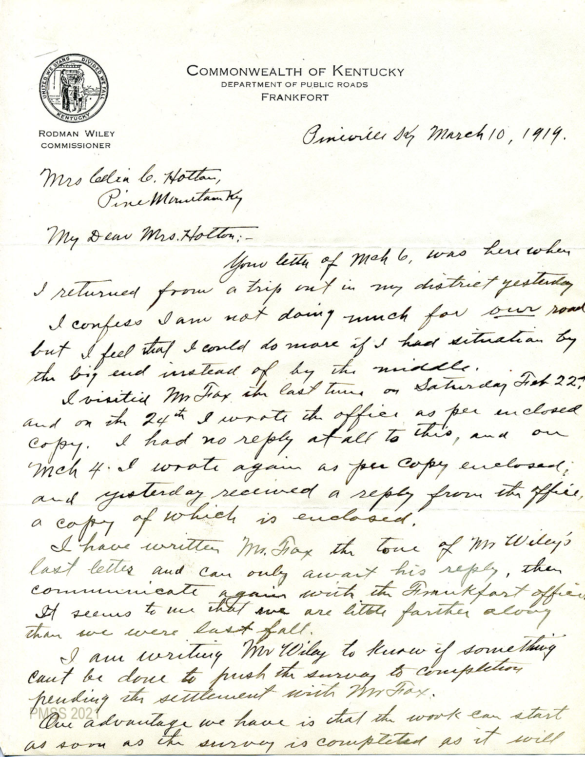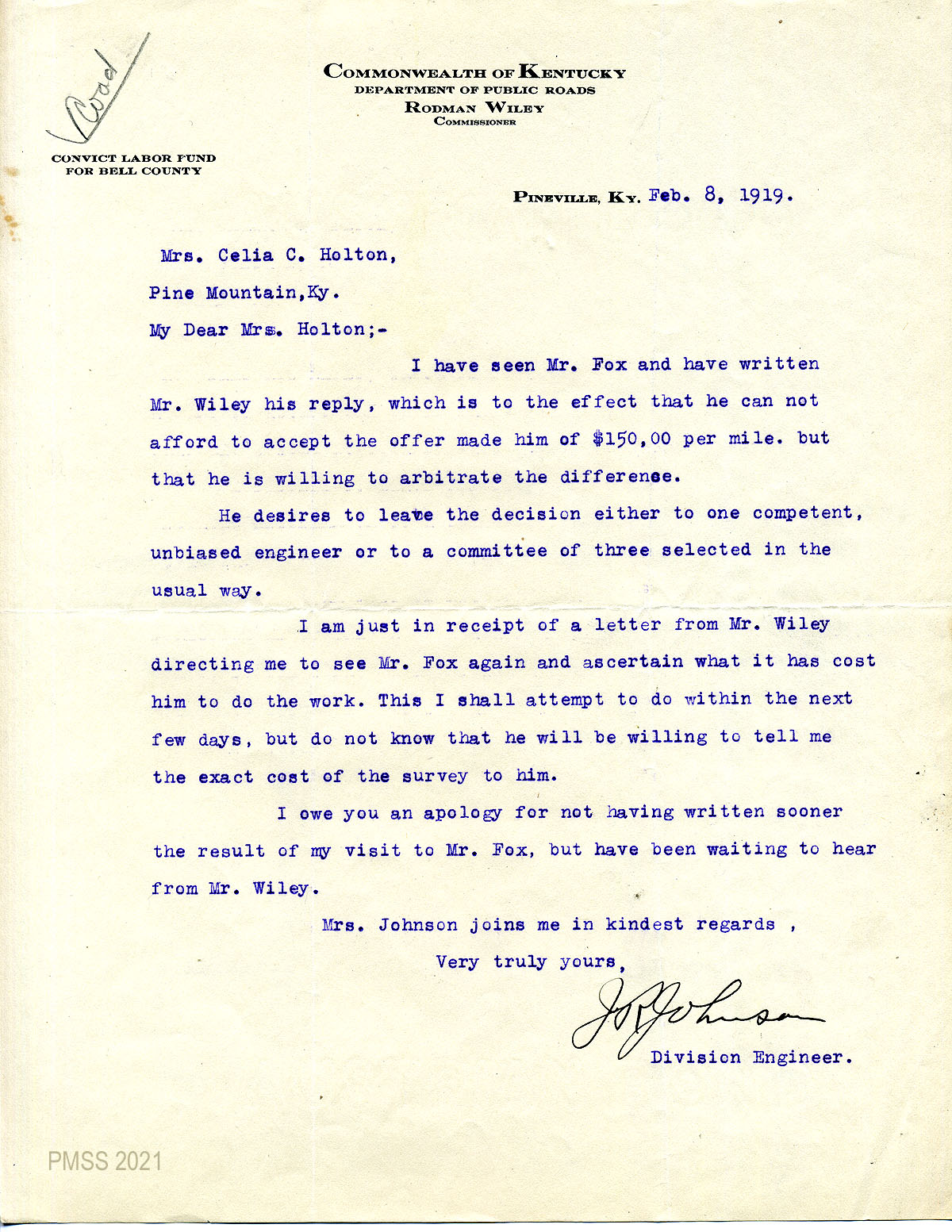 1919_02_08 February 8, 1919. To Mrs. (Celia Cathcart) Holton from J.R. Johnson, Division Engineer, Convict Labor Fund for Bell County, Kentucky Department of Public Roads. Johnson met with Fox and informed Wiley that Fox “can not afford to accept the offer made (to) him of $150.00 per mile but that he is willing to arbitrate the difference.” Wiley had directed Johnson to try to find out from Fox the cost of Fox’s survey.