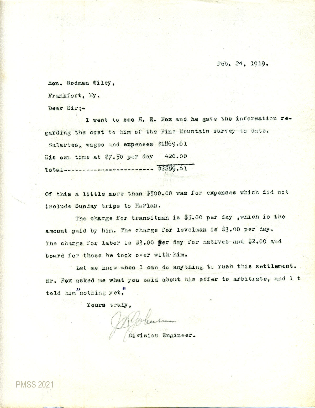 1919_02_24 February 24, 1919. Carbon copy of letter to Wiley from Johnson, reporting on his meeting with Fox, who estimates that the cost to him of the Pine Mountain survey to date is $2289.61. Johnson provides a breakdown of the charges.
