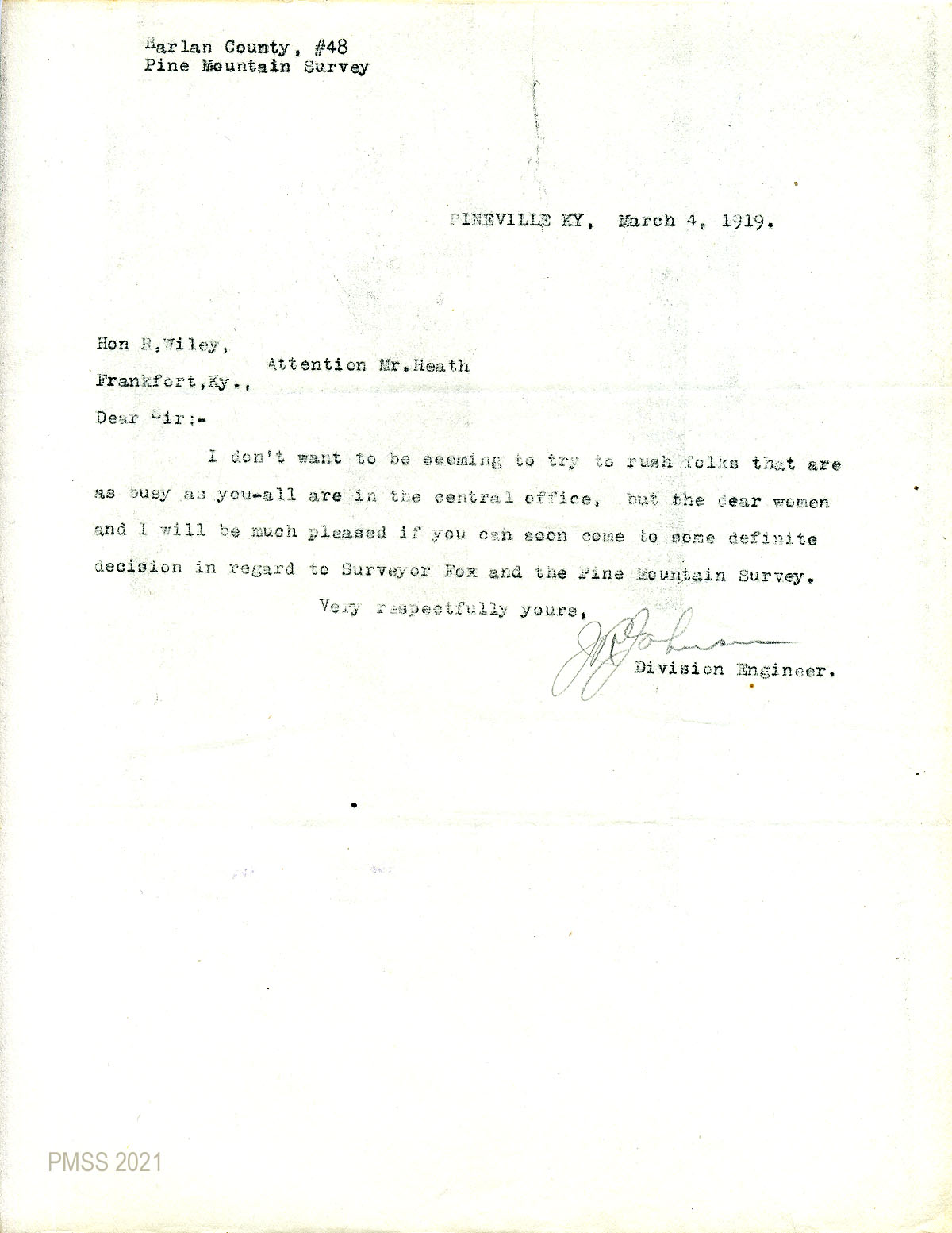 1919_03_04 March 4, 1919. To Hon. R. Wiley, Attention Mr. Heath from Johnson. “I don’t want to be seeming to try to rush folks that are as busy as you-all are in the central office, but the dear women and I will be much pleased if you can soon come to some definite decision in regard to Surveyor Fox and the Pine Mountain Survey.”