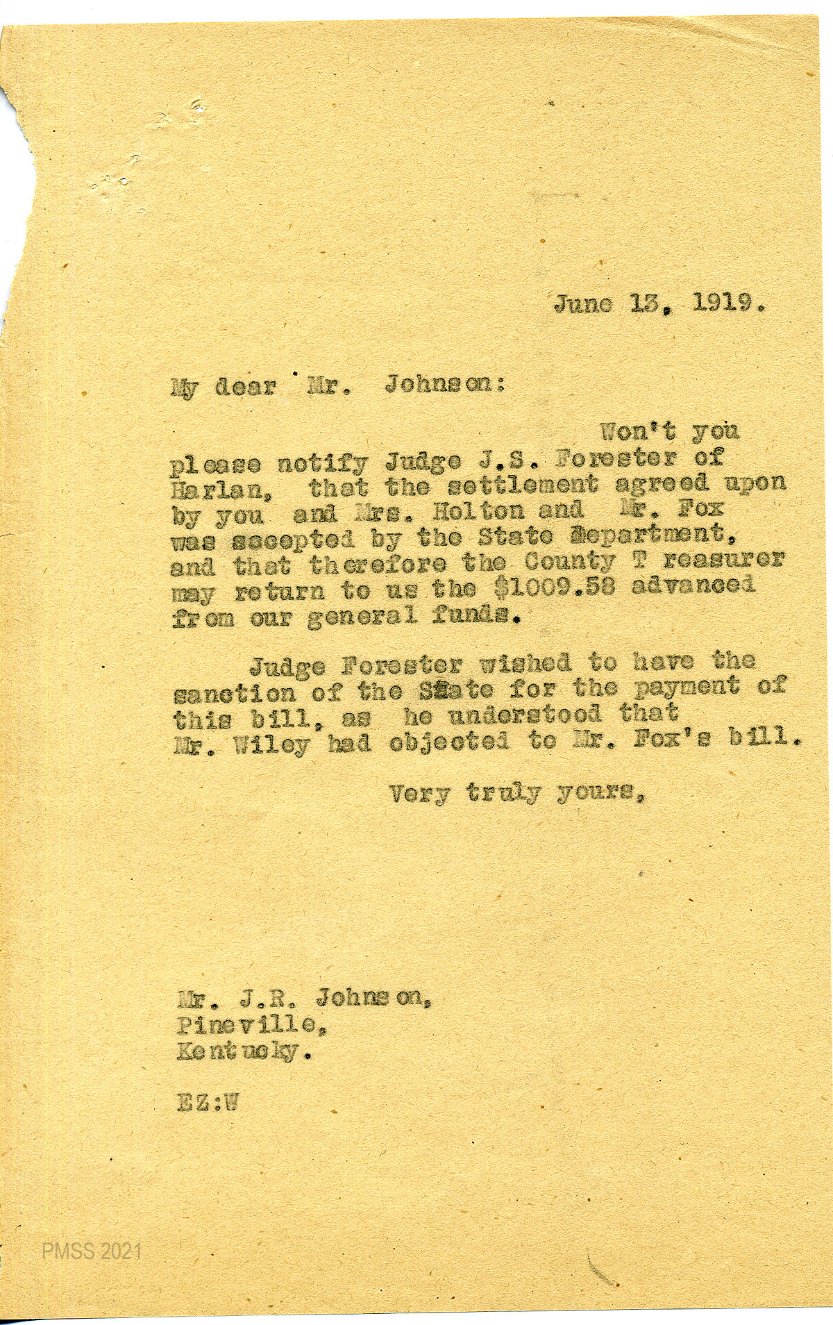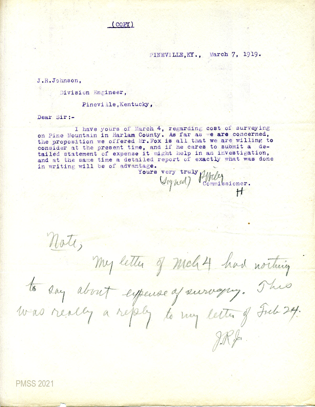 1919_03_07 March 7, 1919. A copy of a letter to Johnson from Wiley, Pineville, KY. “…[T]he proposition we offered Mr. Fox is all that we are willing to consider….” unless he submits a detailed expense statement. (Handwritten note at bottom of page from Johnson, clarifying that Wiley’s letter was a reply to Johnson’s letter of February 24.)