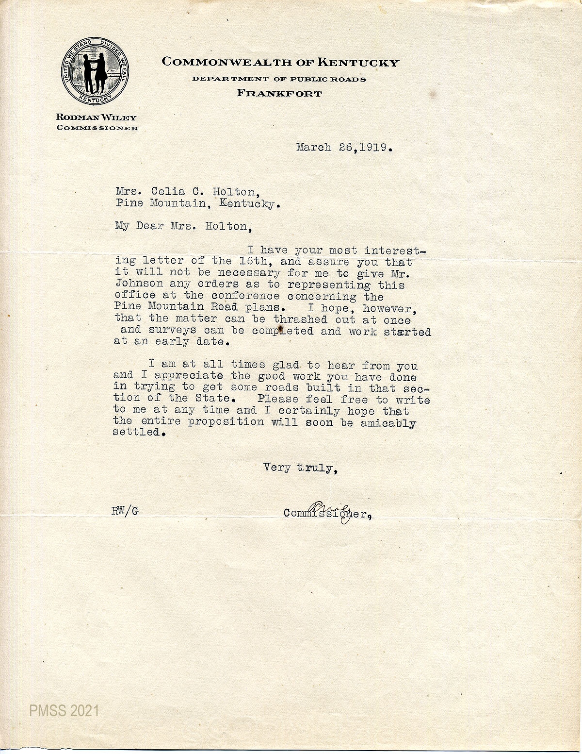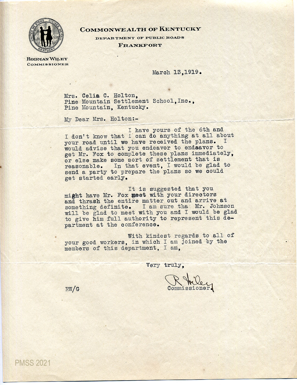 1919_03_13 March 13. 1919. To Holton from Wiley, responding to her March 6 letter. Wiley cannot do anything about the Road until he has received the plans and advises that Holton gets Fox to complete them as soon as possible “or else make some sort of settlement that is reasonable.” It is suggested that Fox meet with the PMSS directors and Mr. Johnson.