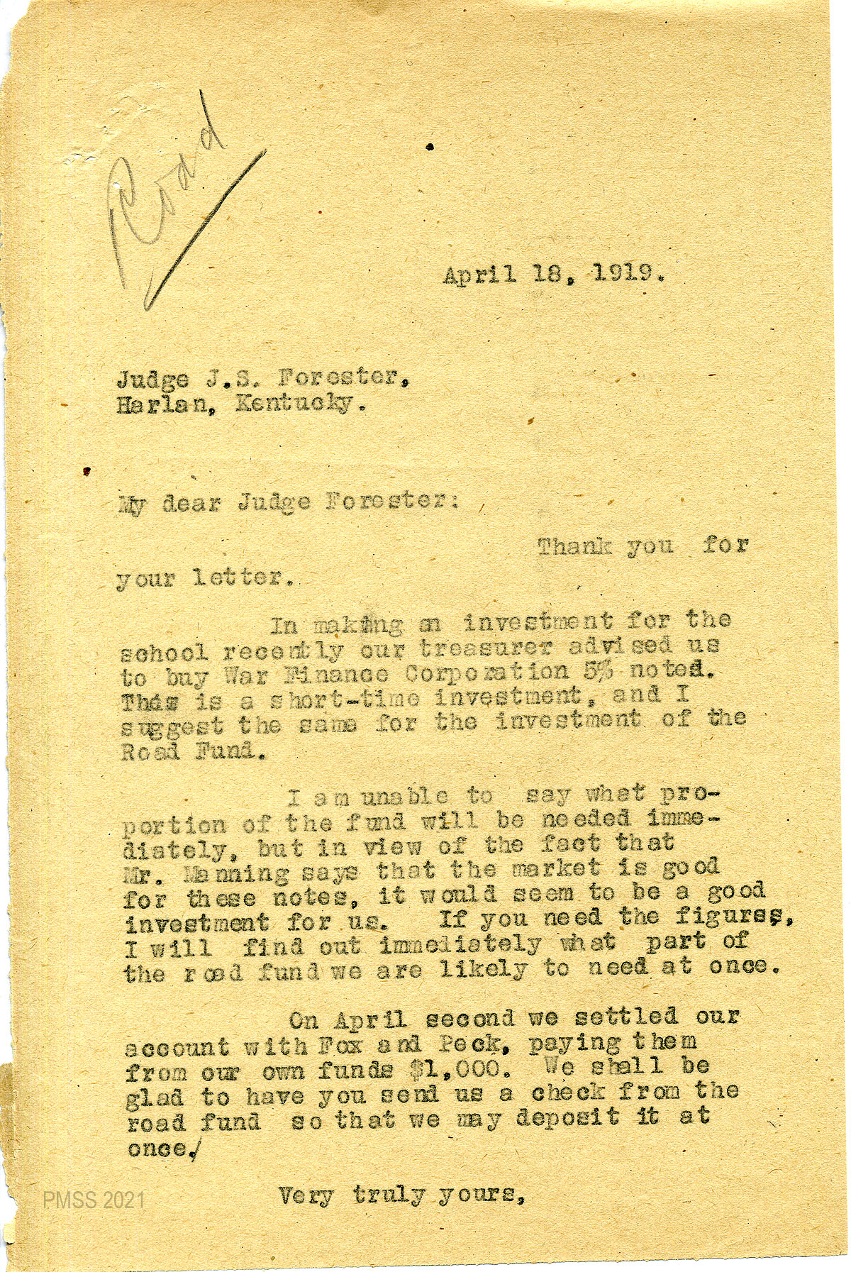 1919_04_18 April 18, 1919. To Judge J.S. Forester from (unsigned, possibly Zande). Mr. (Charles N.) Manning, PMSS Board Treasurer, recently advised buying War Finance Corporation 5% notes as a short-time investment for the School. Zande would like to do the same for the investment of the Road Fund. Also, on April 2, PMSS settled their account with Fox & Peck, paying $1000.