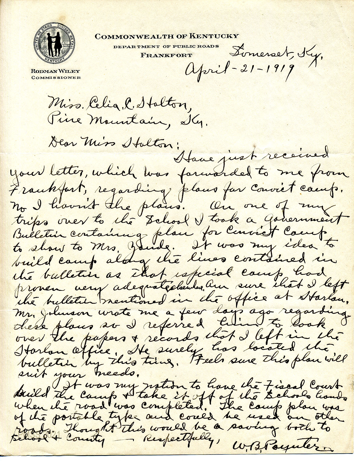 1919_04_21 (076) April 21, 1919. Handwritten letter to Holton from W.B. Paynter (Road Engineer), on letterhead for Kentucky Department of Public Roads, Frankfort, KY. He refers Holton to a government bulletin containing plans for a convict camp that he showed Mrs. Zande. “It was my notion to have the Fiscal Court build the camp & take it off of the School’s hands when the road was completed. The camp plan was of the portable type and could be used on other roads….”