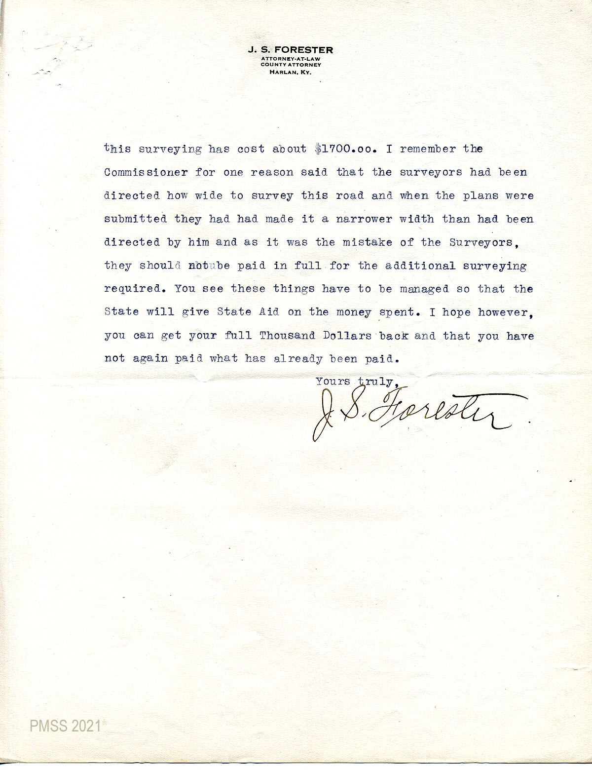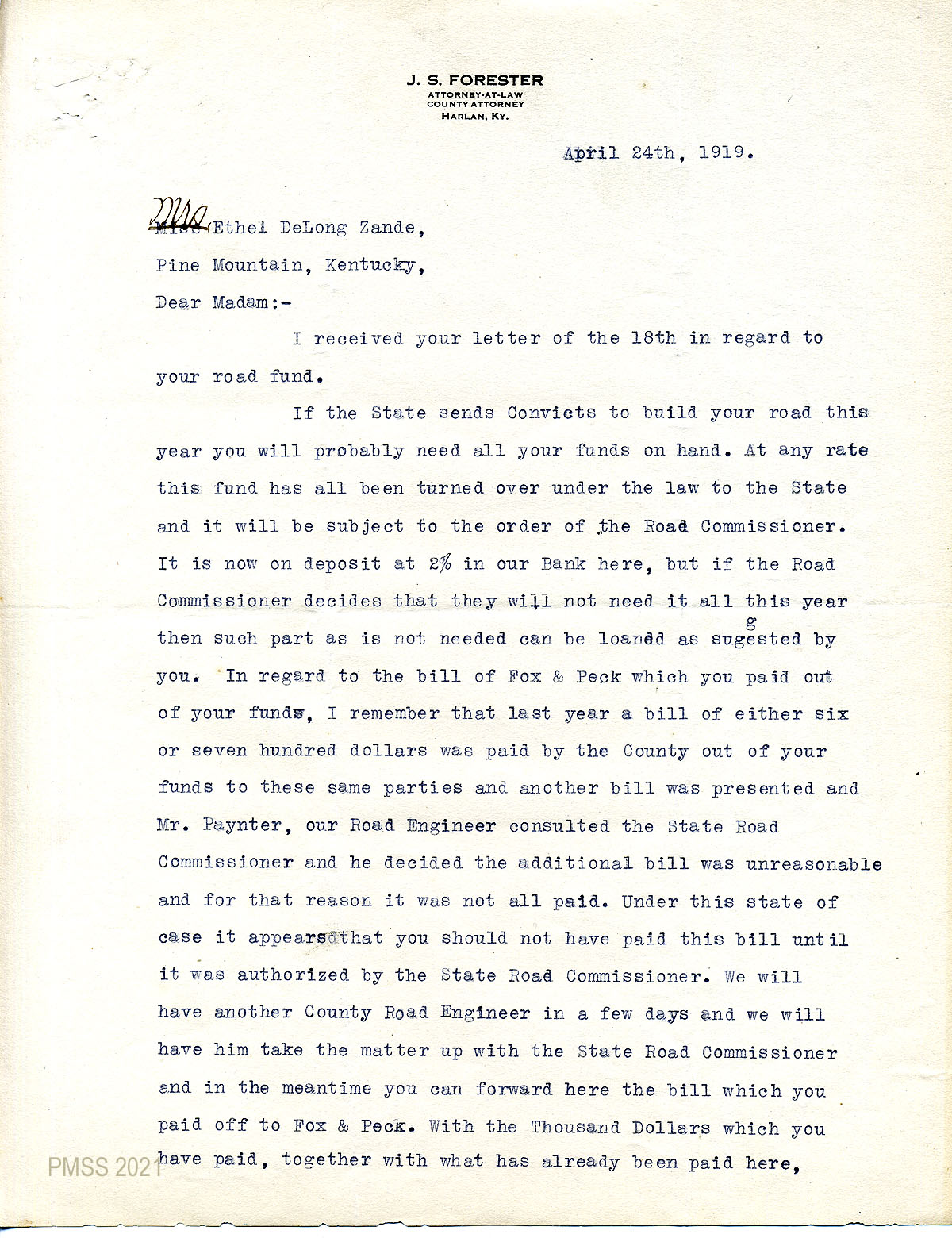 1919_04_24 April 24, 1919. Two-page letter to Zande from J.S. Forester, County Attorney, Harlan, KY, responding to her April 18th letter regarding the Road Fund. (Page 1) The fund has been turned over to the State and is subject to the order of the Road Commissioner. It is on deposit at 2% in the bank in Harlan. Another county road engineer will take up the matter with the State Road Commissioner concerning Fox & Peck’s bill, which, he states, Zande should not have paid.