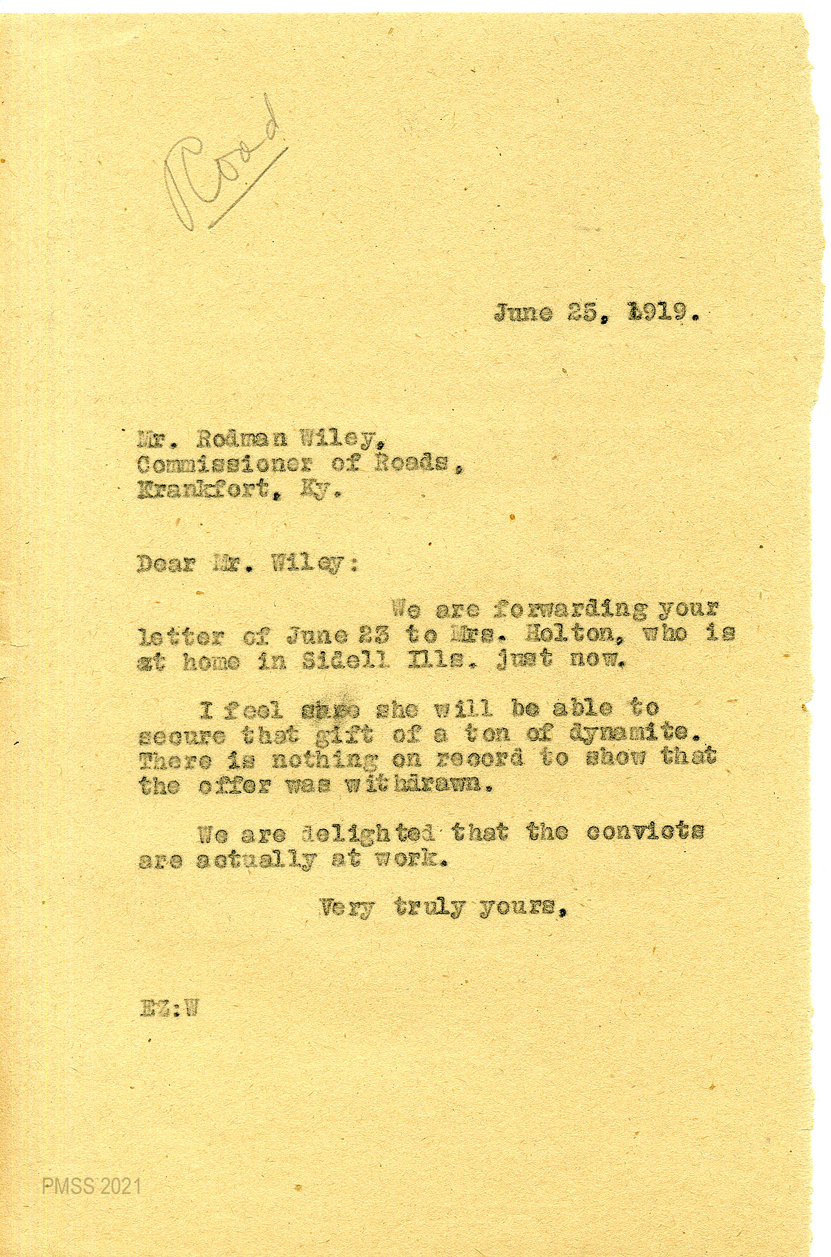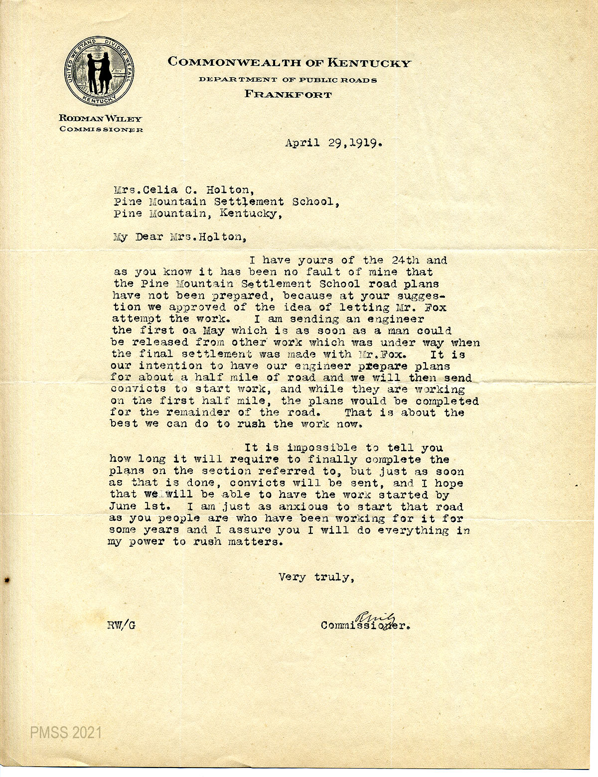 1919_04_29 April 29, 1919. To Holton from Wiley, responding to her April 24 letter. He will be sending an engineer on May 1st to prepare plans “for about a half mile of road and we will then send convicts to start work, and while they are working on the first half mile, the plans would be completed for the remainder of the road.” He hopes work can start by June 1st.