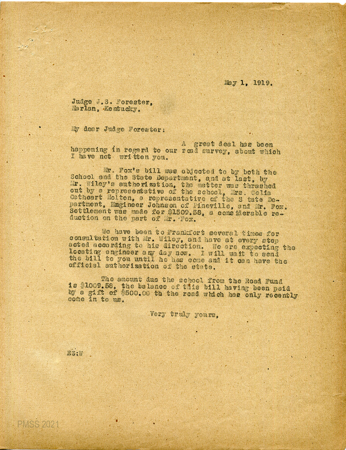 1919_05_01 May 1, 1919. To Forester from EZ (Zande), updating him on the road survey. She explained the objection to Mr. Fox’s bill by both the School and the State Department, a meeting with Fox, and a settlement of $1509.58. She assures Forester that the School has acted according to Wiley’s direction. A $500 gift has just come to PMSS for the Road. Therefore, the amount owed to the school from the Road Fund is $1009.58.