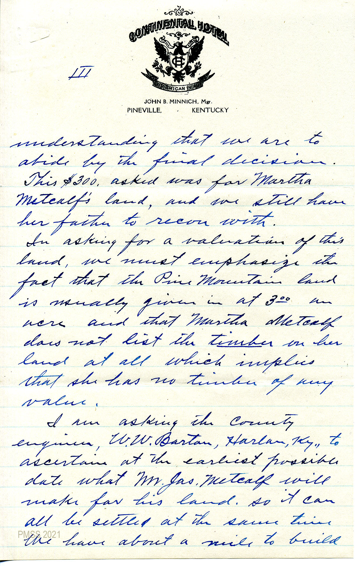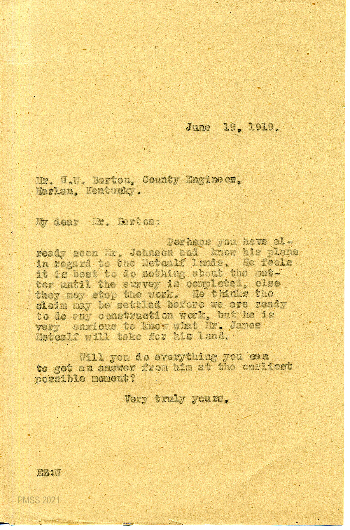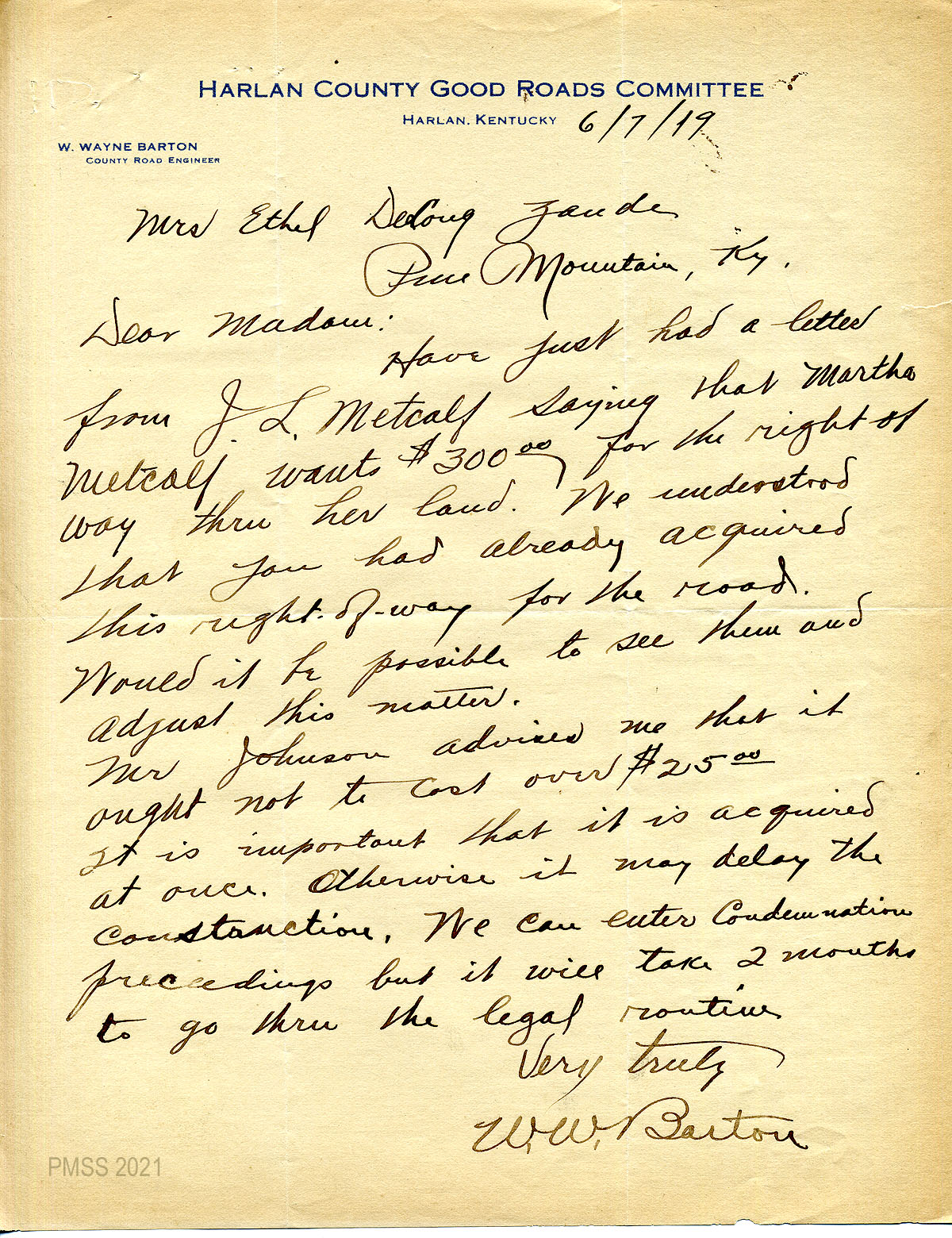 1919_06_07 June 7, 1919. Handwritten letter to Zande from W. Wayne Barton, County Road Engineer, on letterhead for Harlan County Good Roads Committee, Harlan, KY. Barton received a “letter from J. (James) L. Metcalf saying that Martha Metcalf wants $300.00 for the right-of-way through her land.” He asks Zande to “see them and adjust this matter. Mr. Johnson advises me that it ought not to cost over $25.00…..”