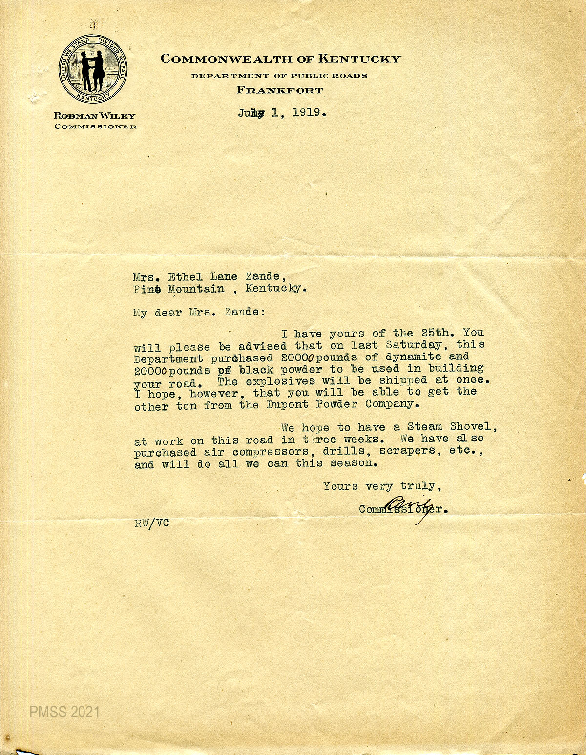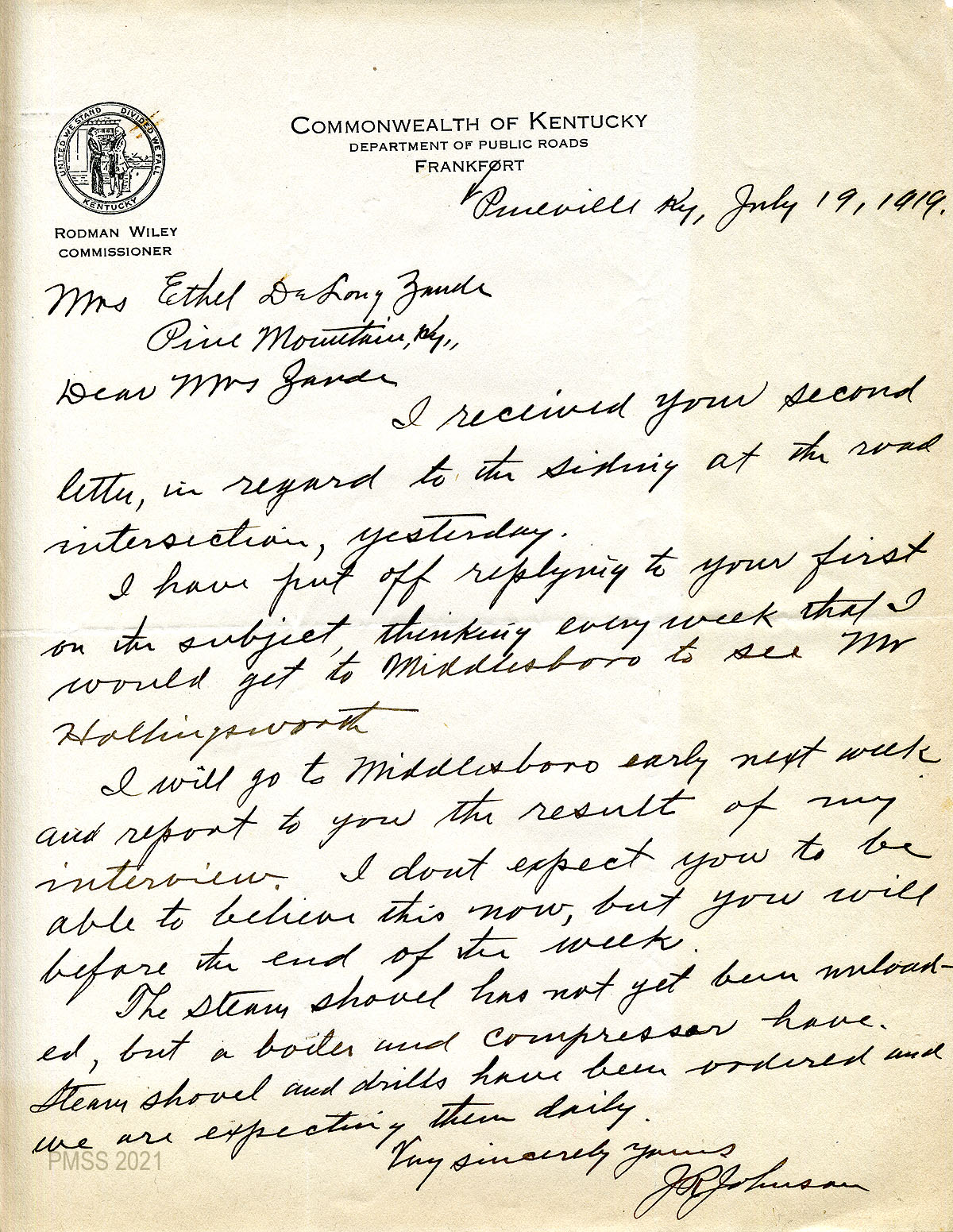 TAGS: Celia Cathcart Holton, Ethel de Long Zande, Laden Trail road, Kentucky Department of Public Roads, road engineers, land surveys, blueprints, convict labor, convict camps, Louisville & Nashville (L&N) Railroad, Federal Aid, Fiscal Court, Road Fund, Harlan County Good Roads Committee, James Metcalf, county attorneys, gift of dynamite, Dupont Powder Company, Kentenia Catron Corporation, contributions
