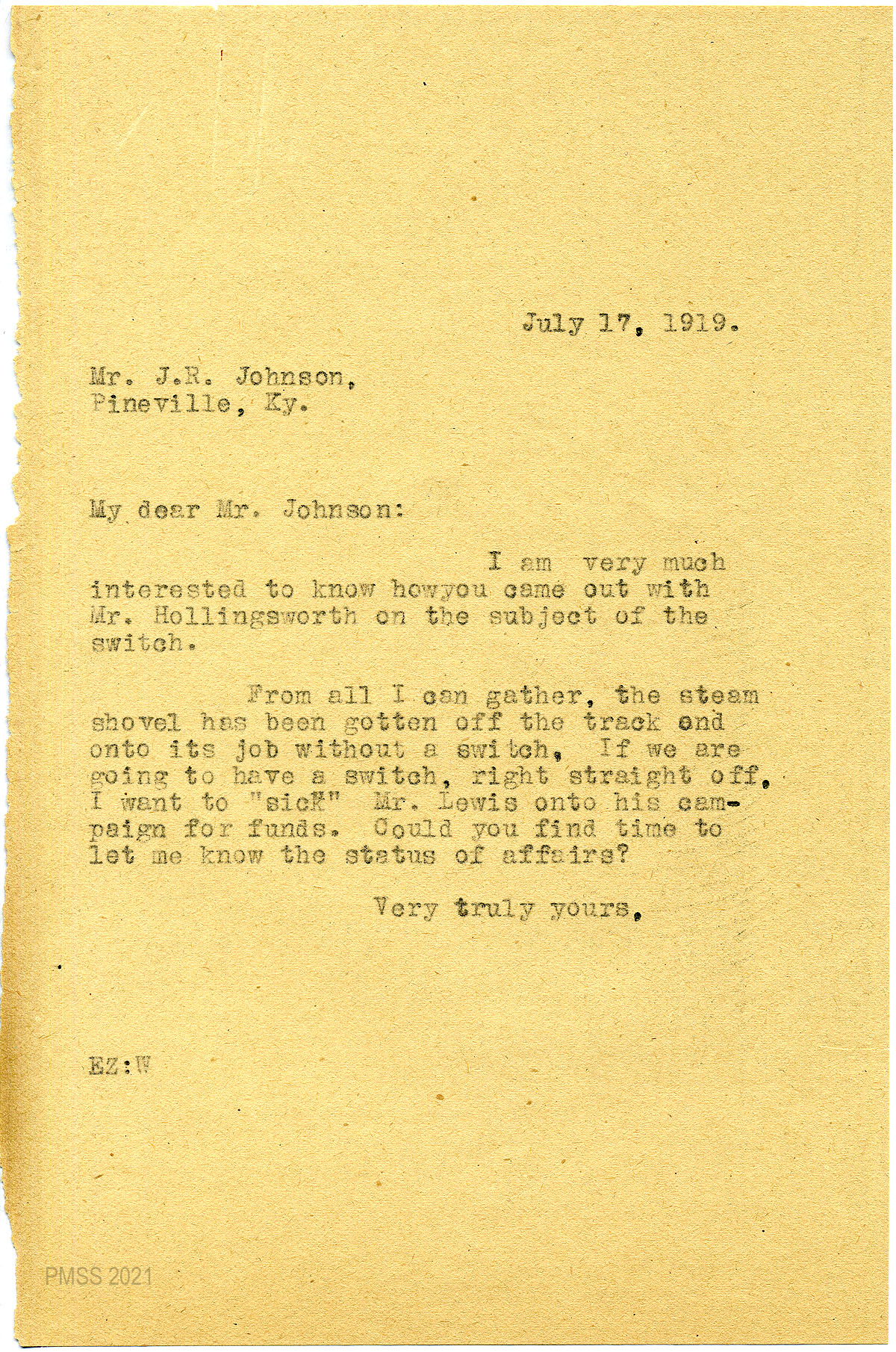 1919_07_19 July 19, 1919. Handwritten letter to Zande from Johnson, who plans to see Hollingsworth in Middlesboro (sic) about the siding at the road intersection. He also reports that “the steam shovel has not yet been unloaded, but a boiler and compressor have. The steam shovel and drills have been ordered.”