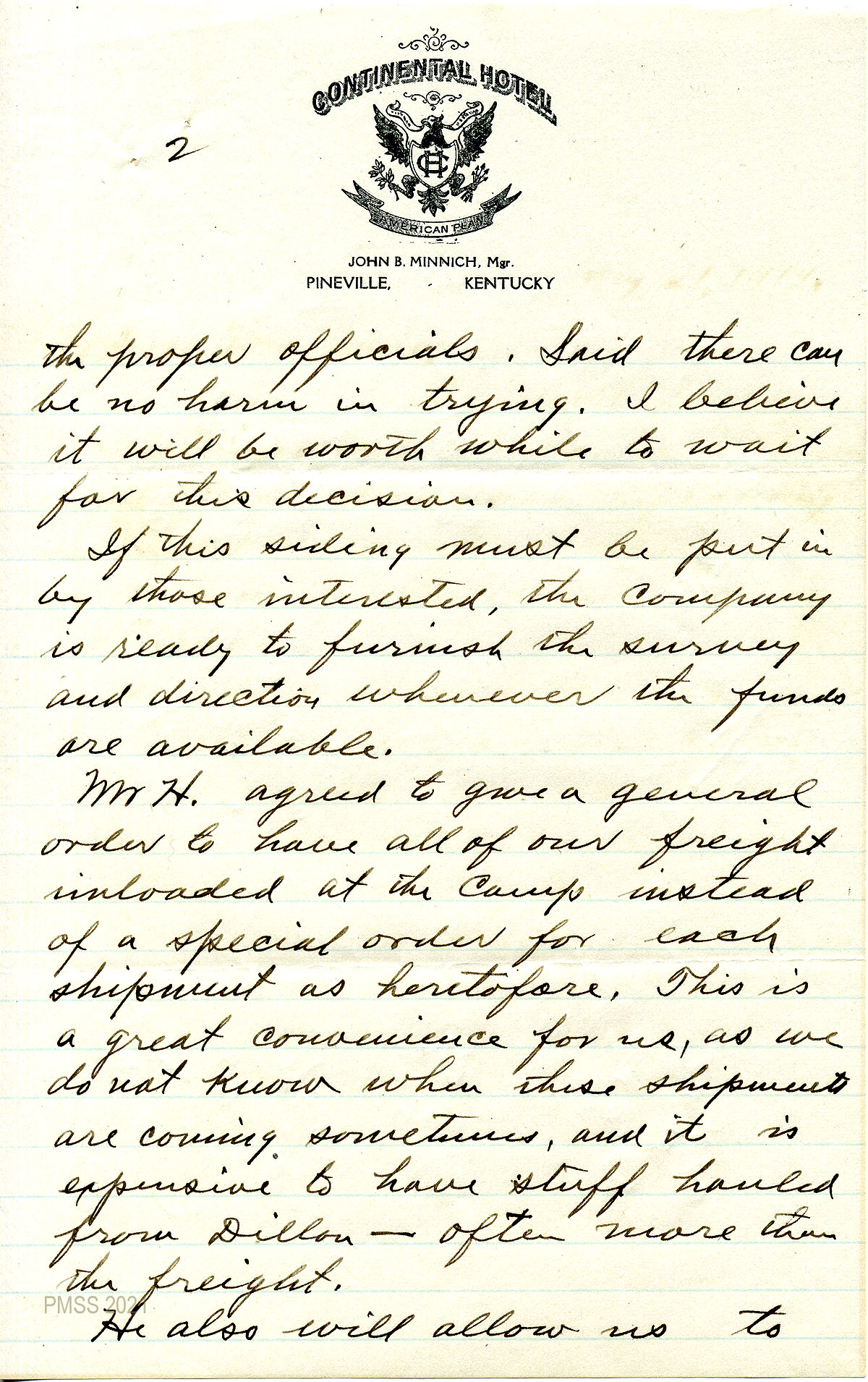 1919_07_21a (098) Page 2. Hollingsworth said he will try other officials. Hollingsworth “agreed to give a general order to have all of our freight unloaded at the camp instead of a special order for each shipment as heretofore.” Johnson explains that this is more convenient and less expensive.
