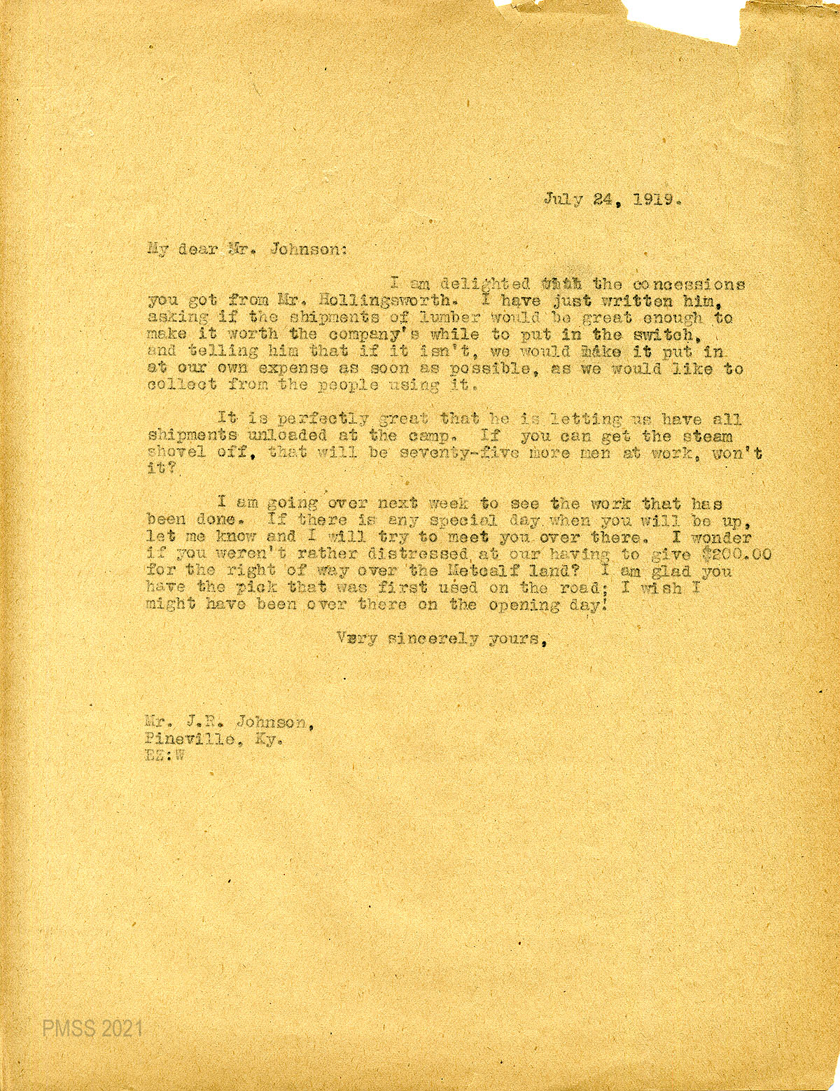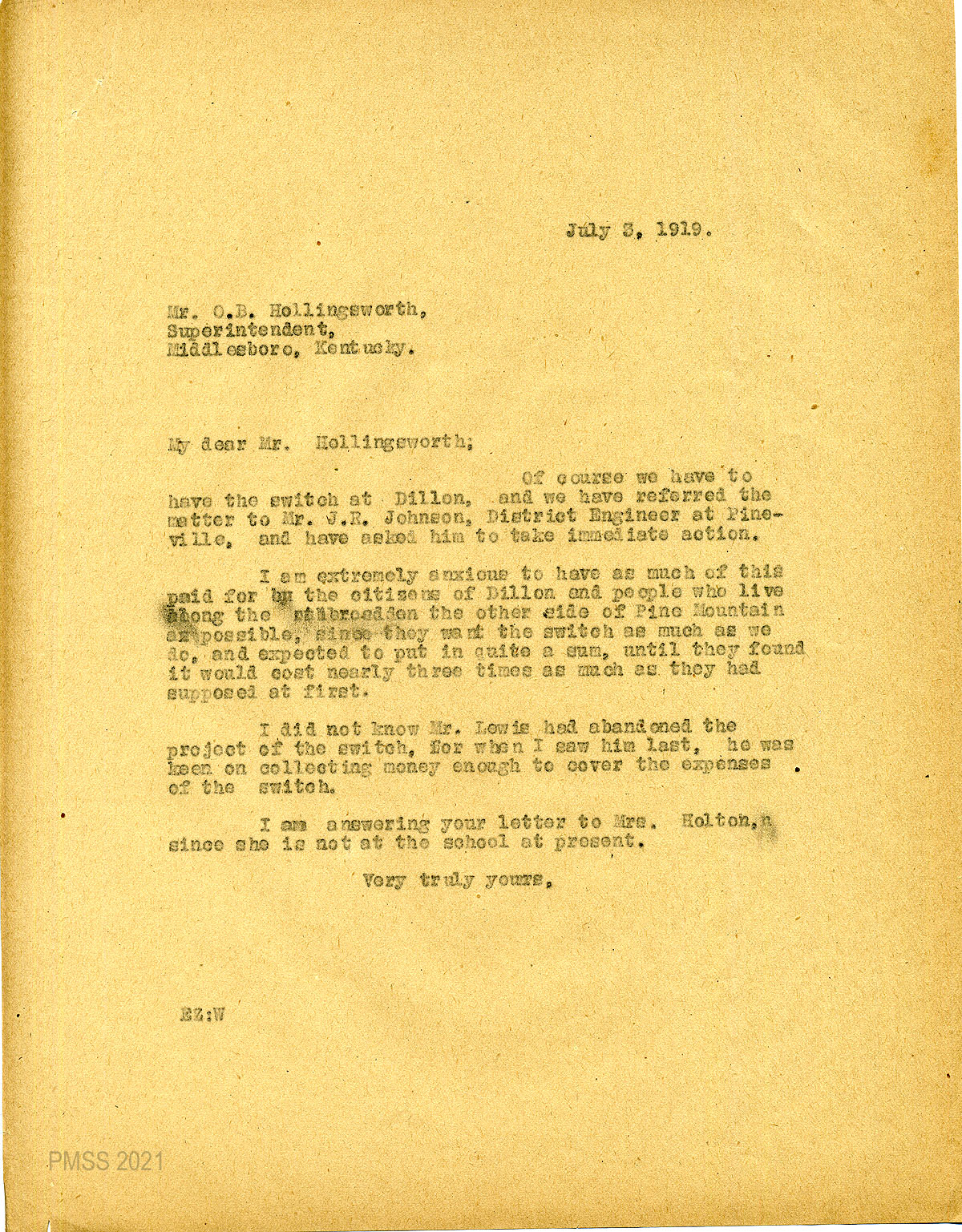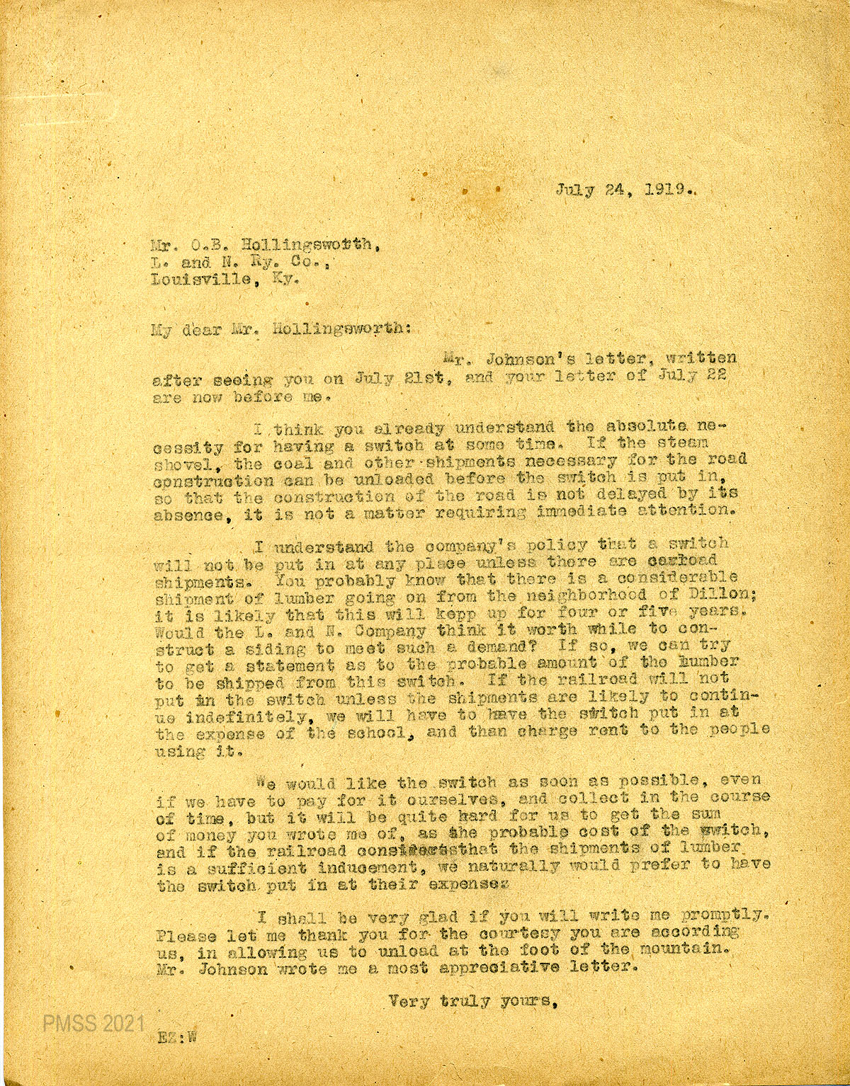 1919_07_24 (261) July 24, 1919. To Hollingsworth from EZ (Zande), asking if L&N Railroad would pay for the switch if it is used for shipping lumber from Dillon, which is likely to continue for four or five years. She thanks him for “allowing us to unload at the foot of the mountain.”