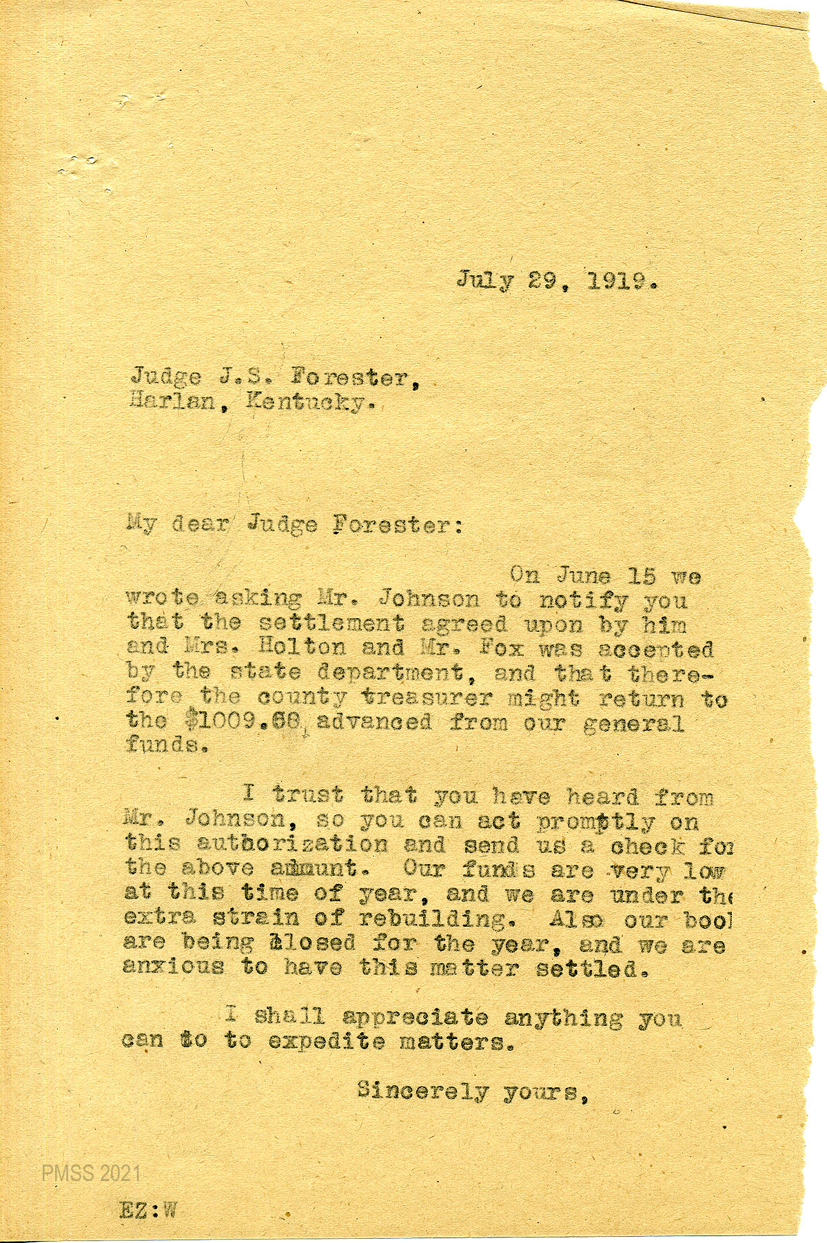 1919_06_13 June 13, 1919. To Johnson from EZ (Zande), asking him to notify Forester that the settlement with Fox was accepted by the State Department. Therefore, the County Treasurer may return $1009.58 to PMSS “advance from our general funds.”