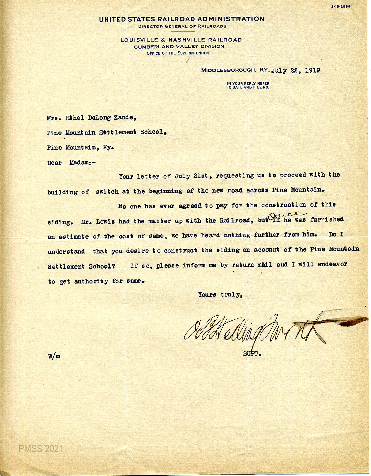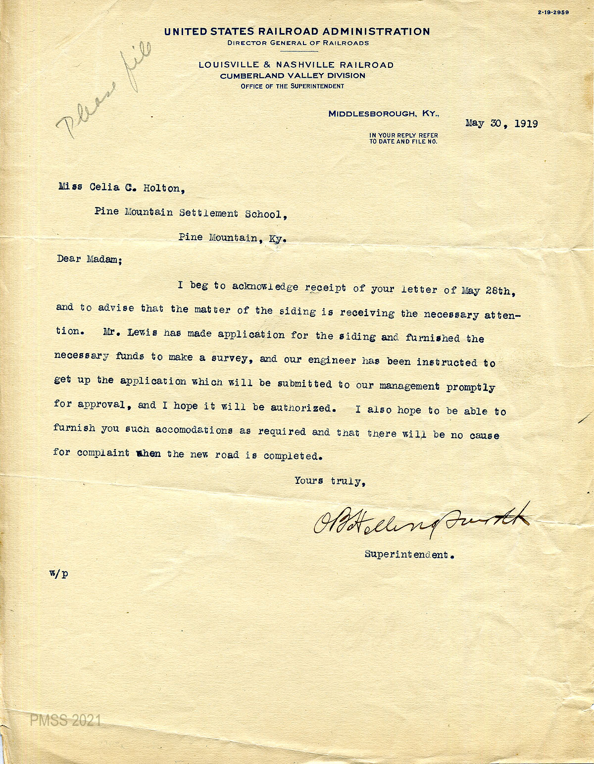 1919_03_20 March 20, 1919. To Holton from O.B. Hollingsworth on letterhead for “U.S. Railroad Administration, Director General of Railroads, Louisville & Nashville Railroad, Cumberland Valley Division, Office of the Superintendent, Middlesborough, KY.” Hollingsworth responds to Holton’s May 16 letter “with reference to siding at the end of the Pine Mountain road, as well as stop at the same place for our passenger trains.” He has received authority to relocate the PMSS depot at Chad to the end of the Road without charge to the School. He is corresponding with Mr. Lewis about the siding; asks when the Road is expected to be completed.