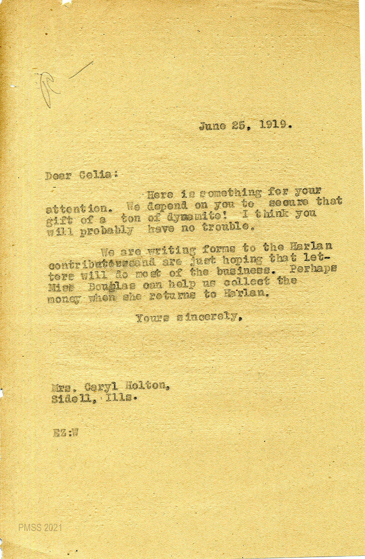 1919_06_25 (327) June 25, 1919. To Holton at her home at Sidell, IL, from EZ (Zande), reminding her to get the dynamite gift. Zande is writing to Harlan contributors, with the hope that Miss Douglas can help.
