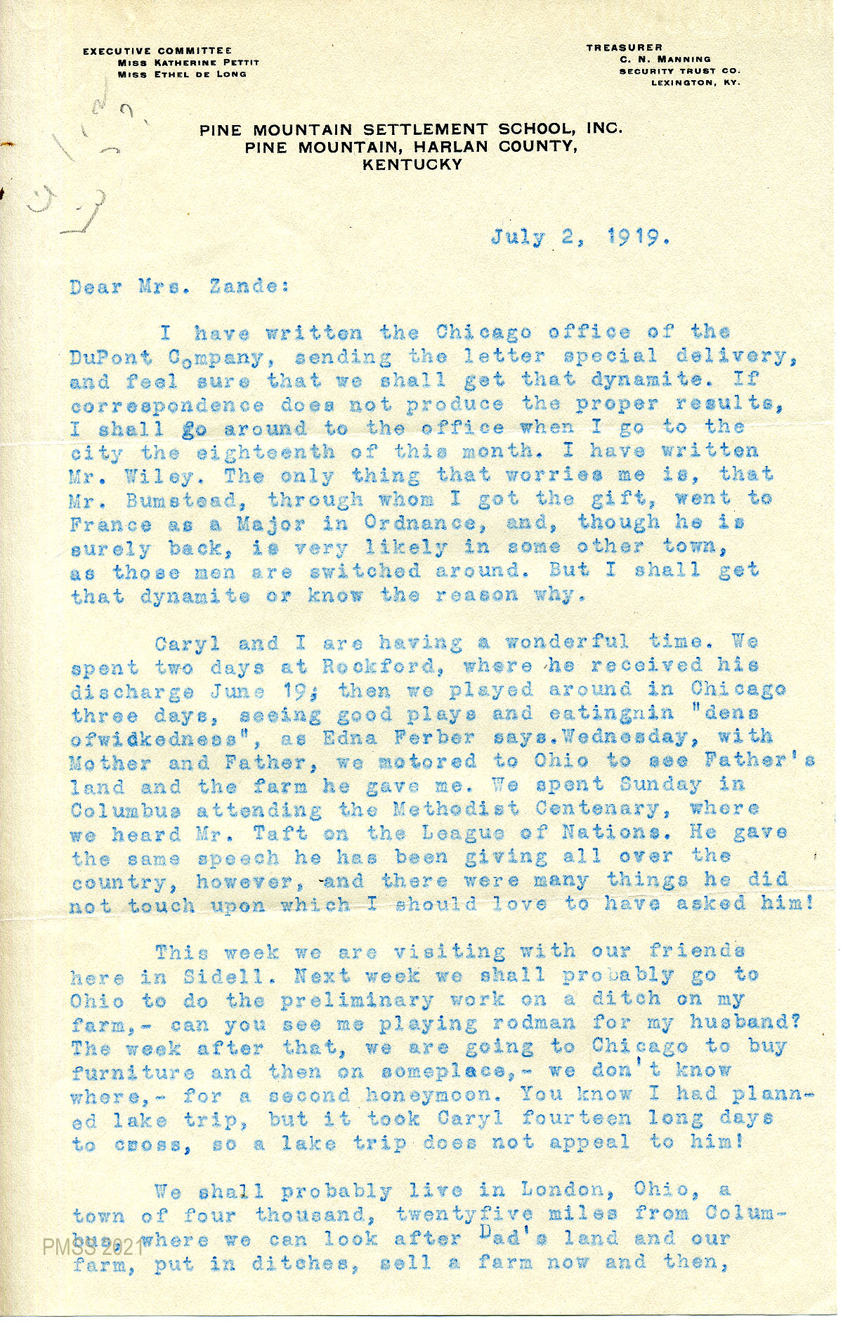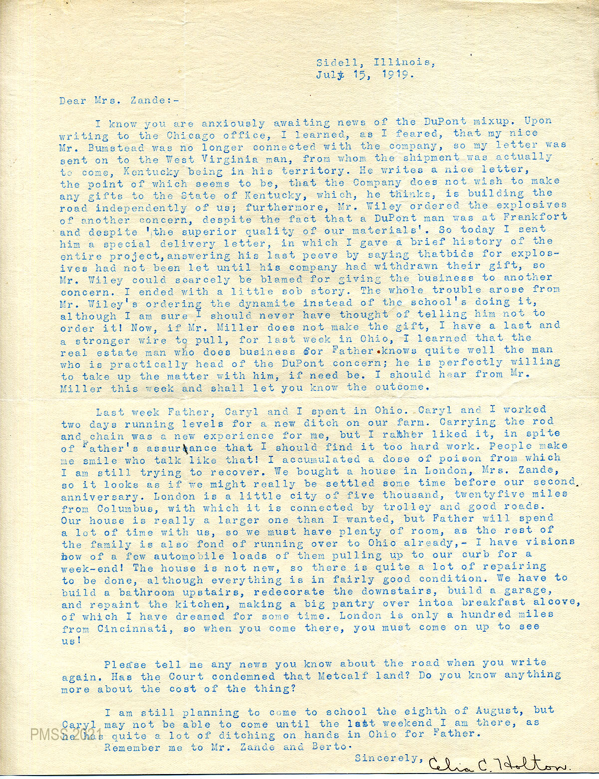 1919_07_15 July 15, 1919. To Zande from Holton with news about the “DuPont mixup.” Mr. Miller of West Virginia, who was to ship the dynamite, wrote to Holton that his Company does not wish to make gifts to the State of Kentucky, “which, he thinks, is building the road independently of us” and other complaints. Holton wrote to him about the history of the Road project and addressed his complaints. If Miller doesn’t make the gift, Holton has another contact at the company that she can try. She then describes her activities in Ohio with her father and Caryl and the house they bought in London, Ohio. She plans to come to PMSS on August 8.