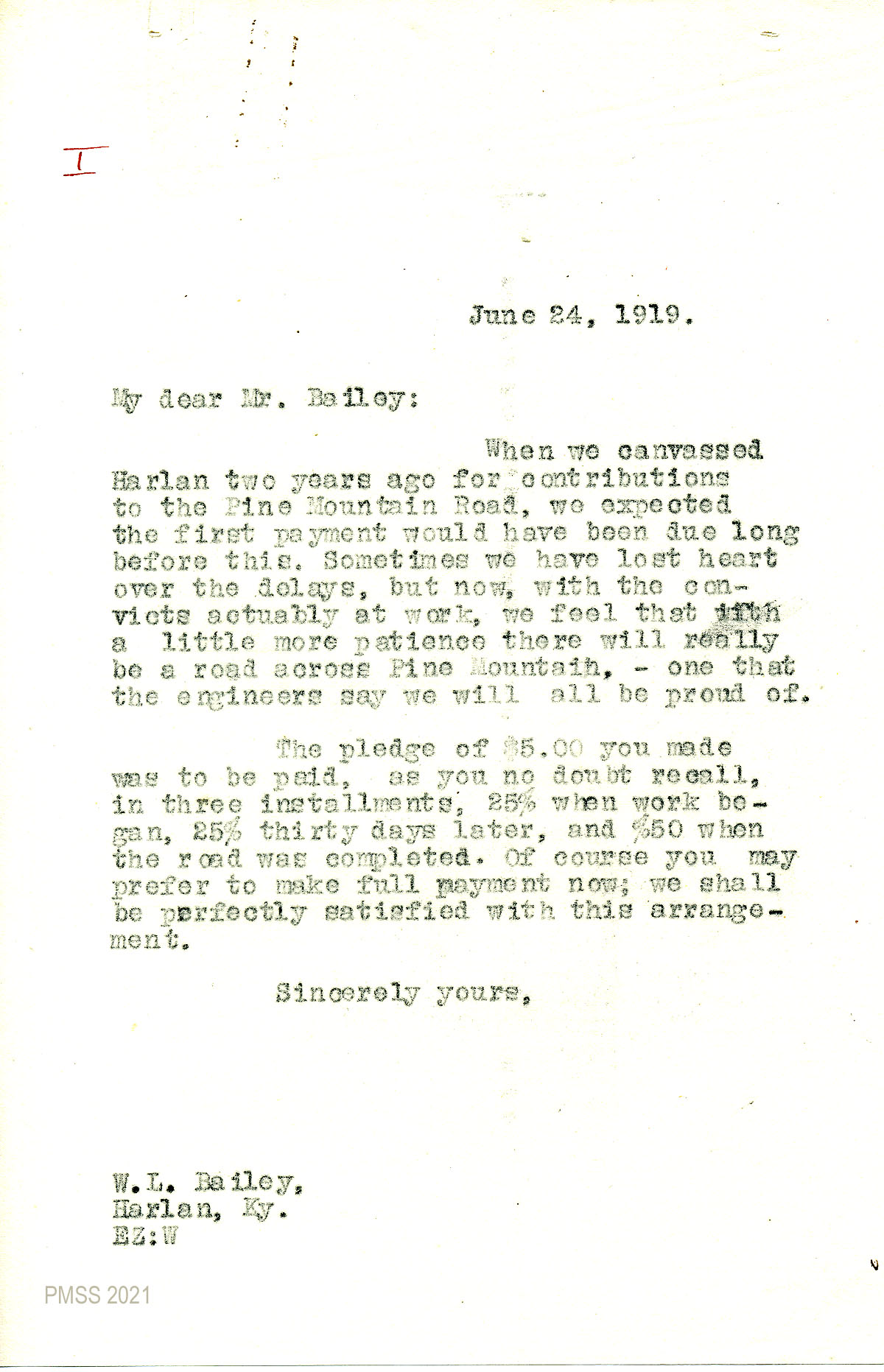 1919_06_24 June 24, 1919. To Mr. W.L. Bailey, Harlan, KY, from EZ (Zande), who reviews Bailey’s arrangement for payments on his $5.00 pledge and suggests making full payment.