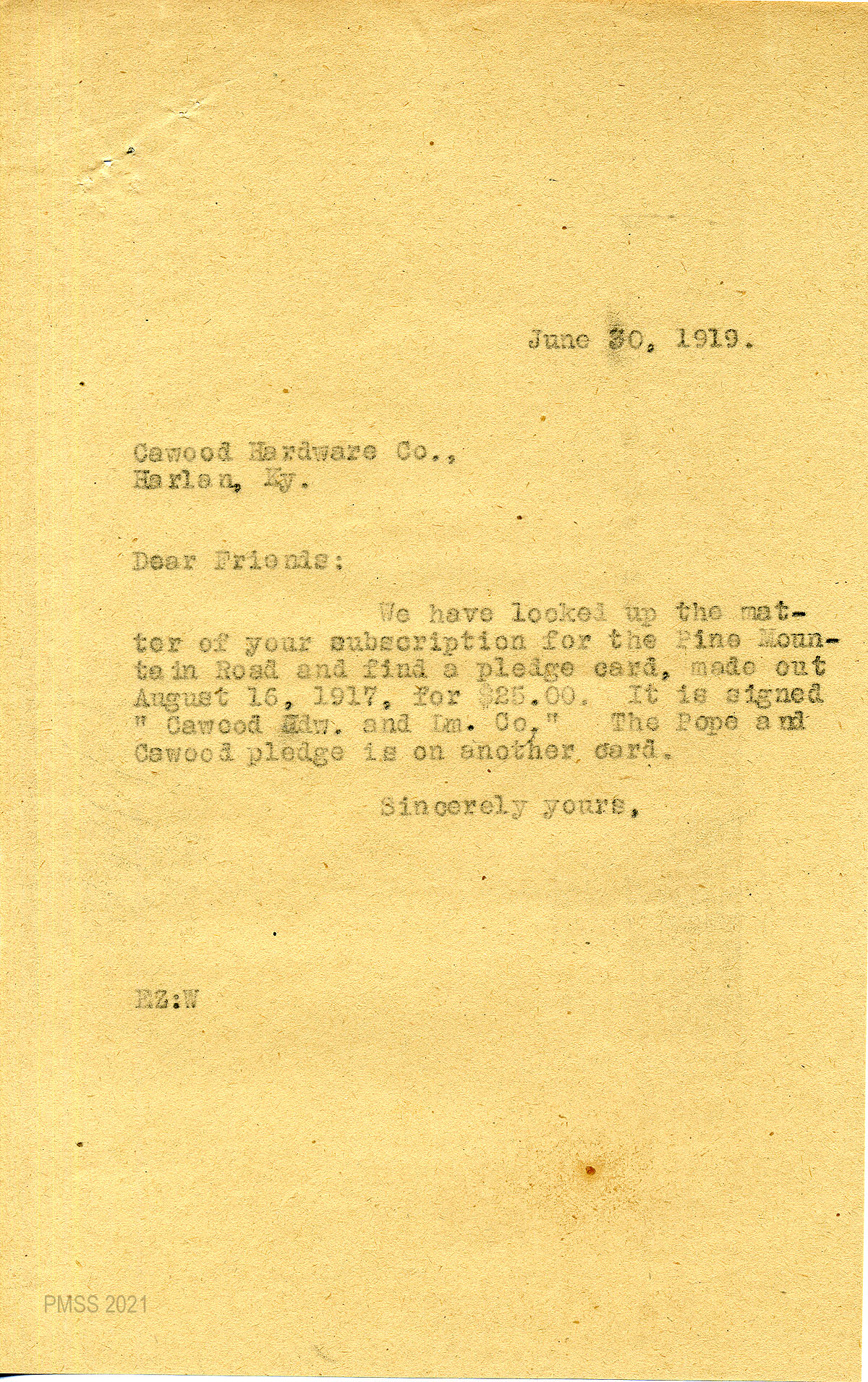 1919_06_26 June 26, 1919. Handwritten note to PMSS from Cawood Hardware Co., Harlan, KY, who asks if PMSS has their subscription to the Road Fund. “The above name is Pope & Cawood Lbr. Co.”