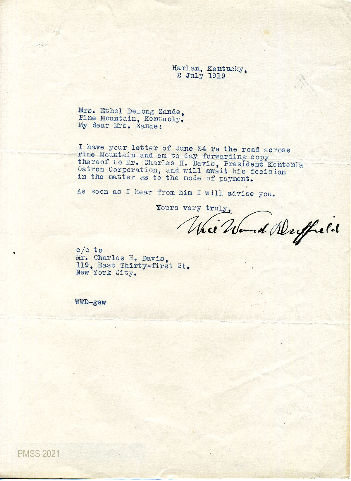 1919_07_02 (341) July 2, 1919. To Zande from Will Ward Duffield, Harlan, KY, who has forwarded her June 24 letter to Mr. Charles H. Davis, President of Kentenia Catron Corporation, NYC, to decide the mode of payment.