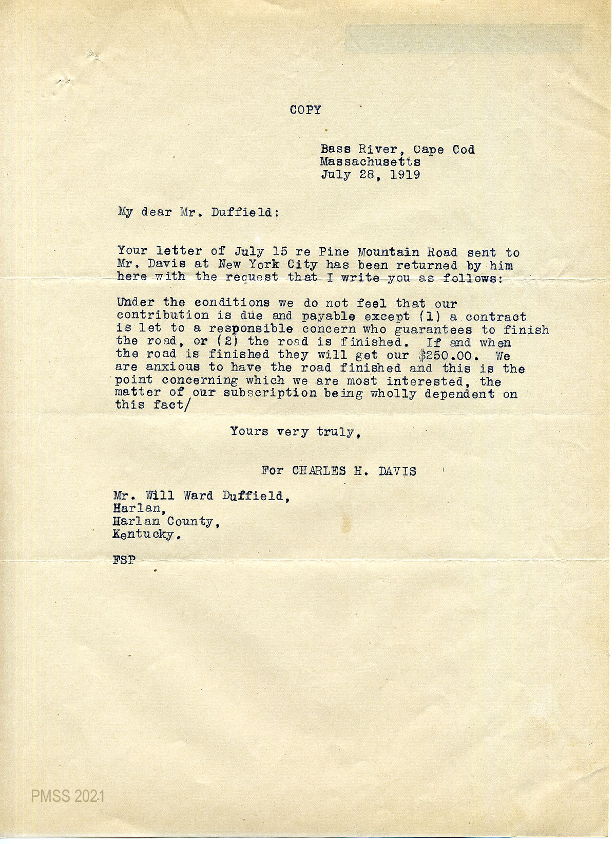 1919_07_28 (341b) July 28, 1919. To Duffield from Charles H. Davis via an assistant in Cape Cod, MA. Davis directed the assistant to inform PMSS that the School will get a $250 contribution from Kentenia if the Road is guaranteed to be finished or is already finished.