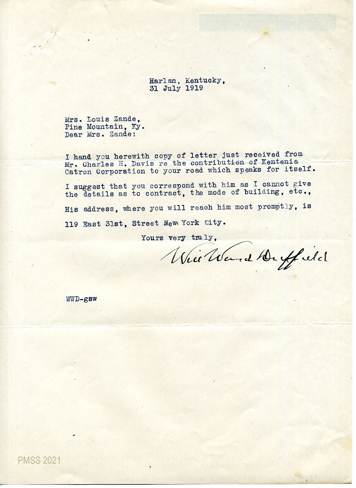 1919 _07_31 July 31, 1919. To Ethel de Long Zande from Duffield, enclosing a copy of a letter from Charles H. Davis about the contribution of Kentenia Catron Corporation to the Road. Provides Davis’s address in NYC and suggests Zande write to him.