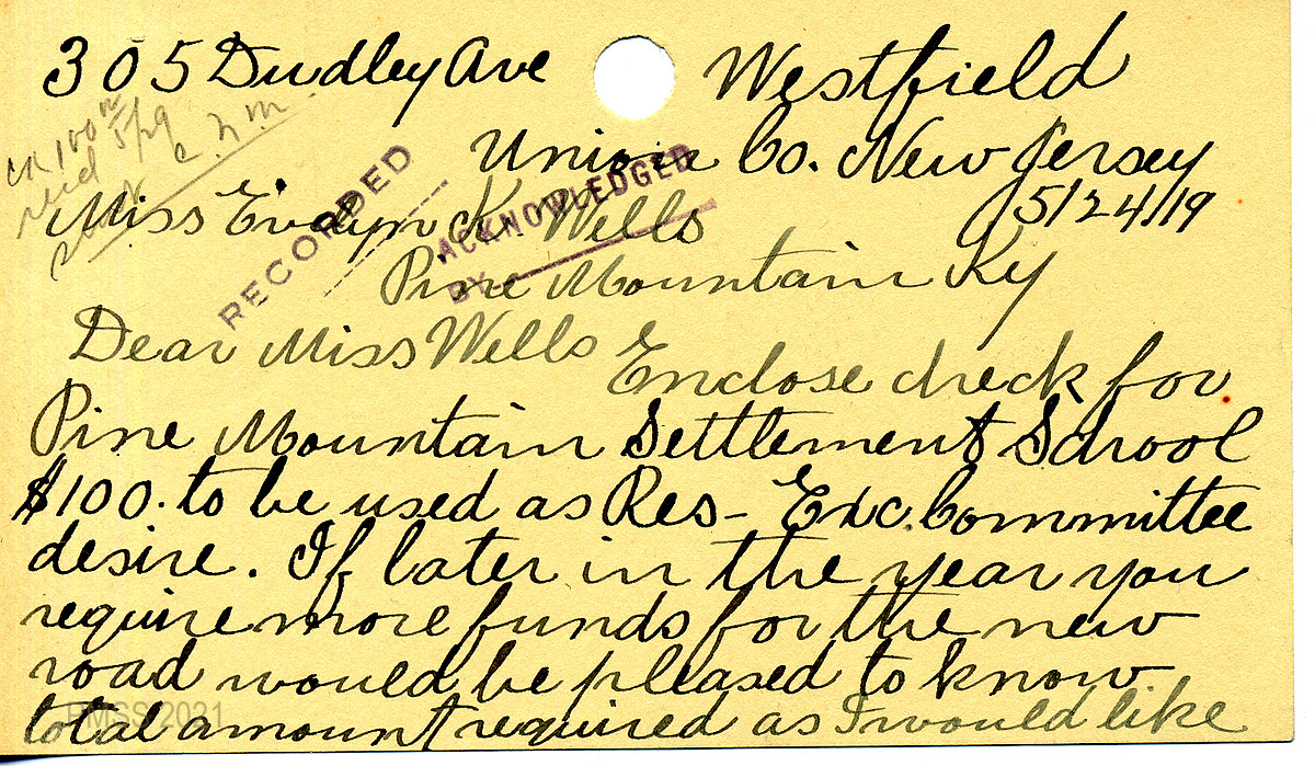1919_05_24 May 24, 1919. Side 1 of a two-sided handwritten card to Miss (Evelyn K.) Wells, from H.E. Jackson, Westfield Union Co., NJ, enclosing a $100 check for the Pine Mountain Settlement School to be used as desired; offers to contribute more if needed later.