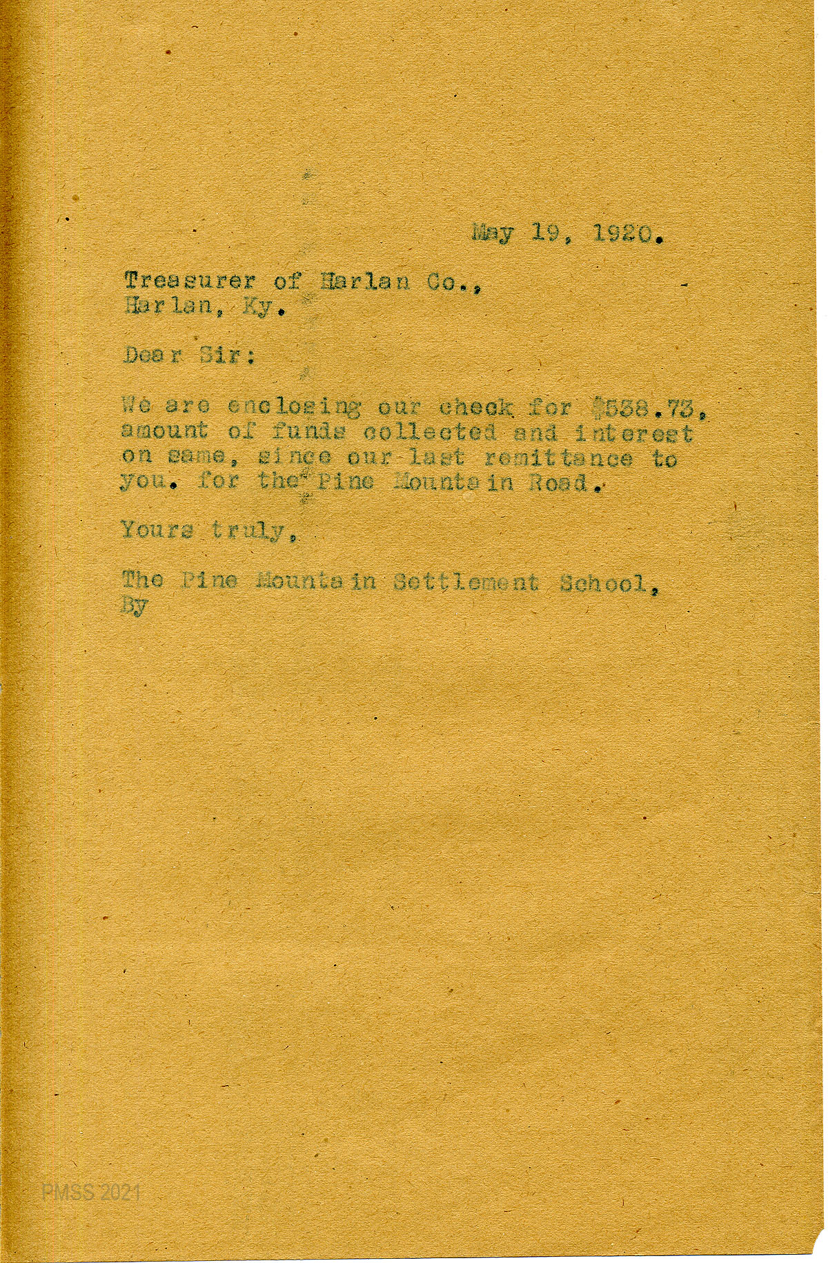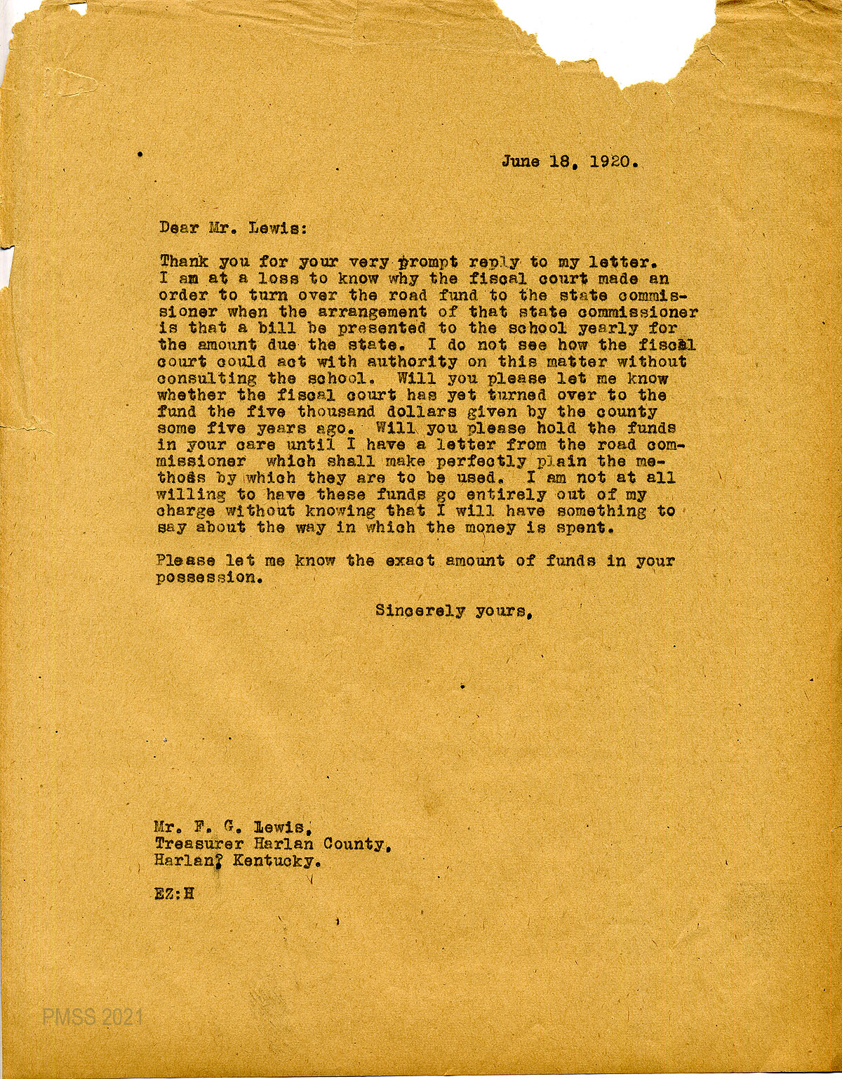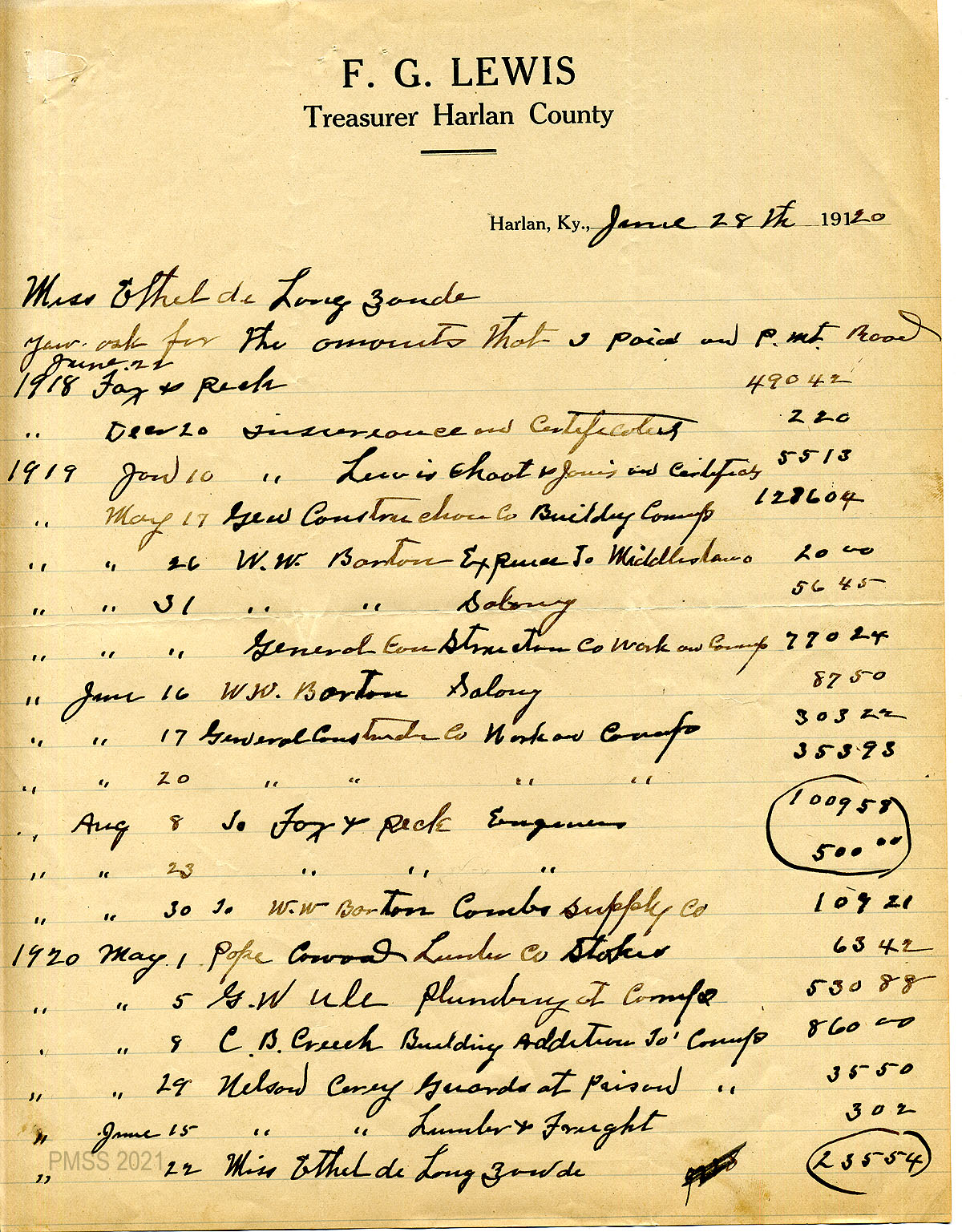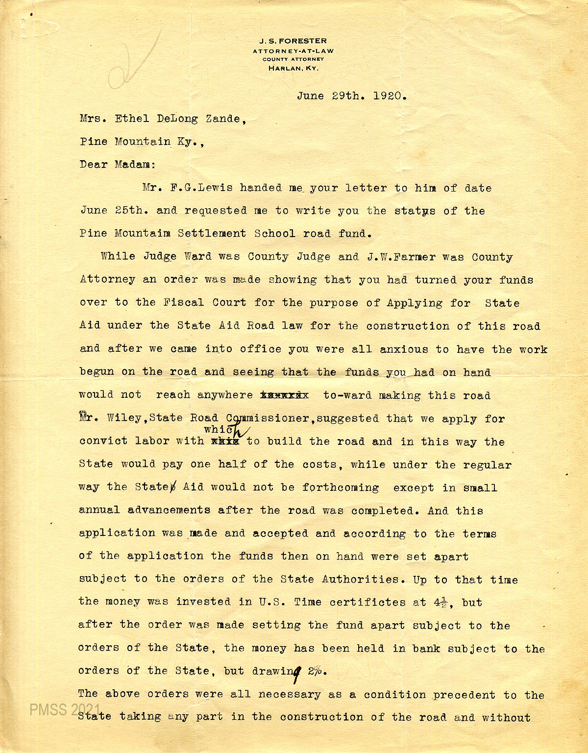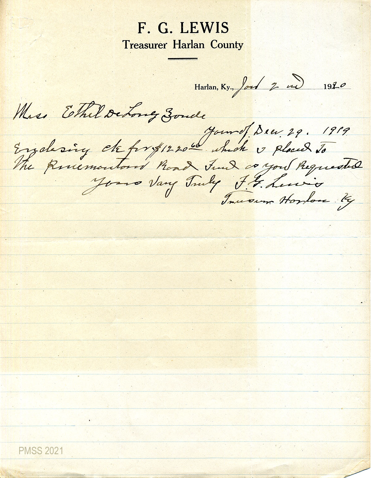 01 January 2, 1920. Handwritten note to Ethel de Long Zande from F.G. Lewis, Treasurer, Harlan, Ky., enclosing a check for $1220.60 which he “placed to the Pine Mountain Road Fund as you requested.”