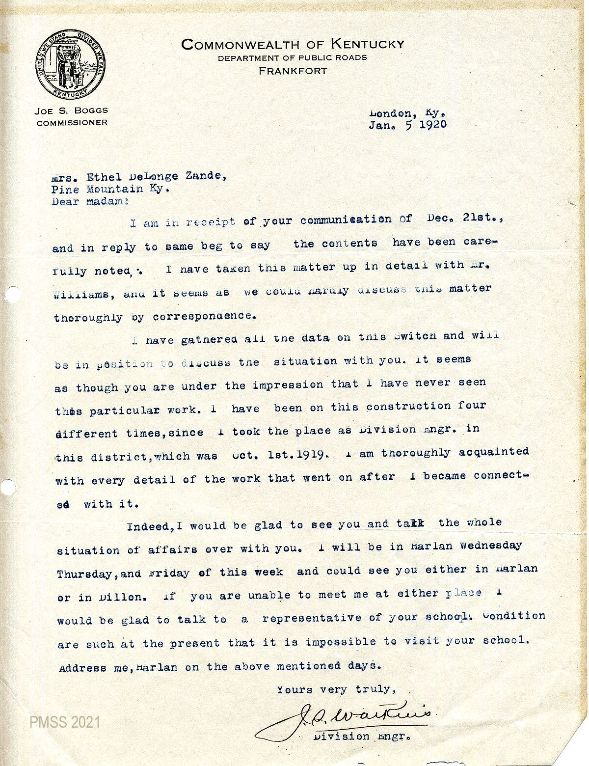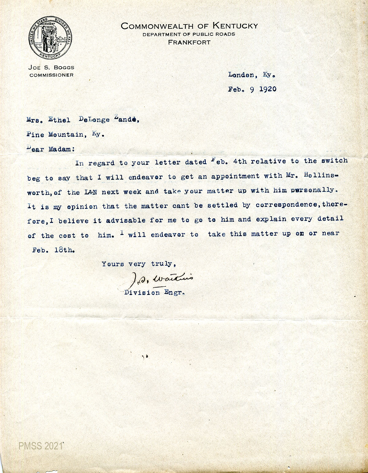 02 January 5, 1920. To Zande from J.S. Watkins, Division Manager, Kentucky Department of Public Roads, London, Ky., who asks to meet with Zande in Harlan or Dillon to discuss the “switch” situation. He describes his background and assures her of his experience with this type of work.